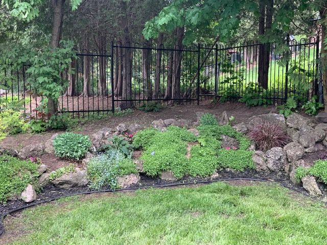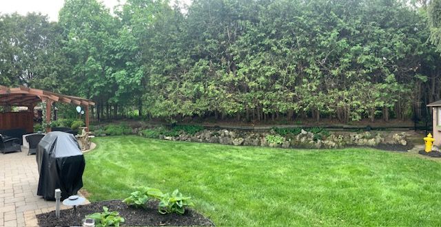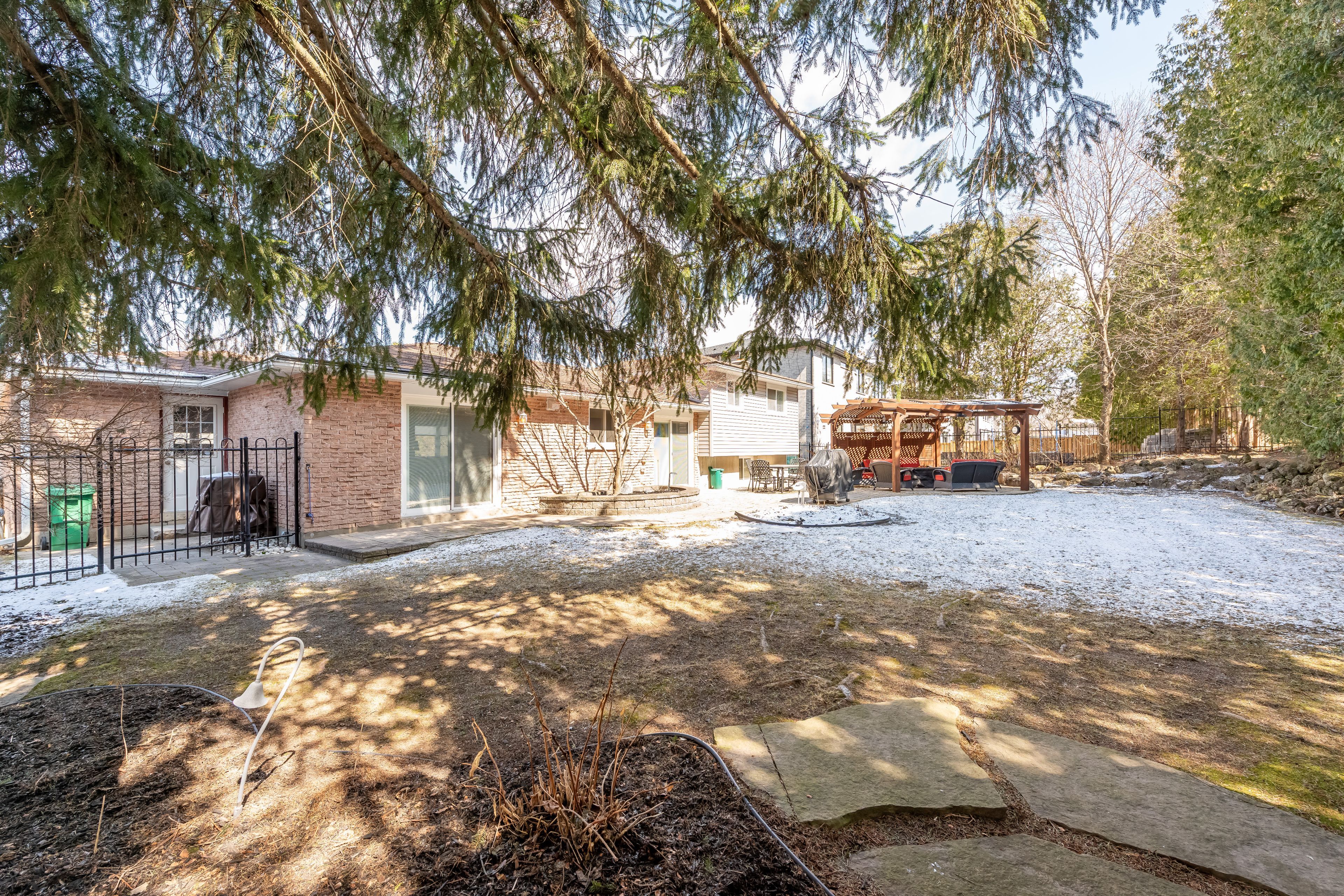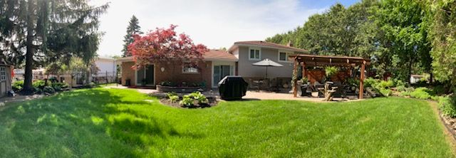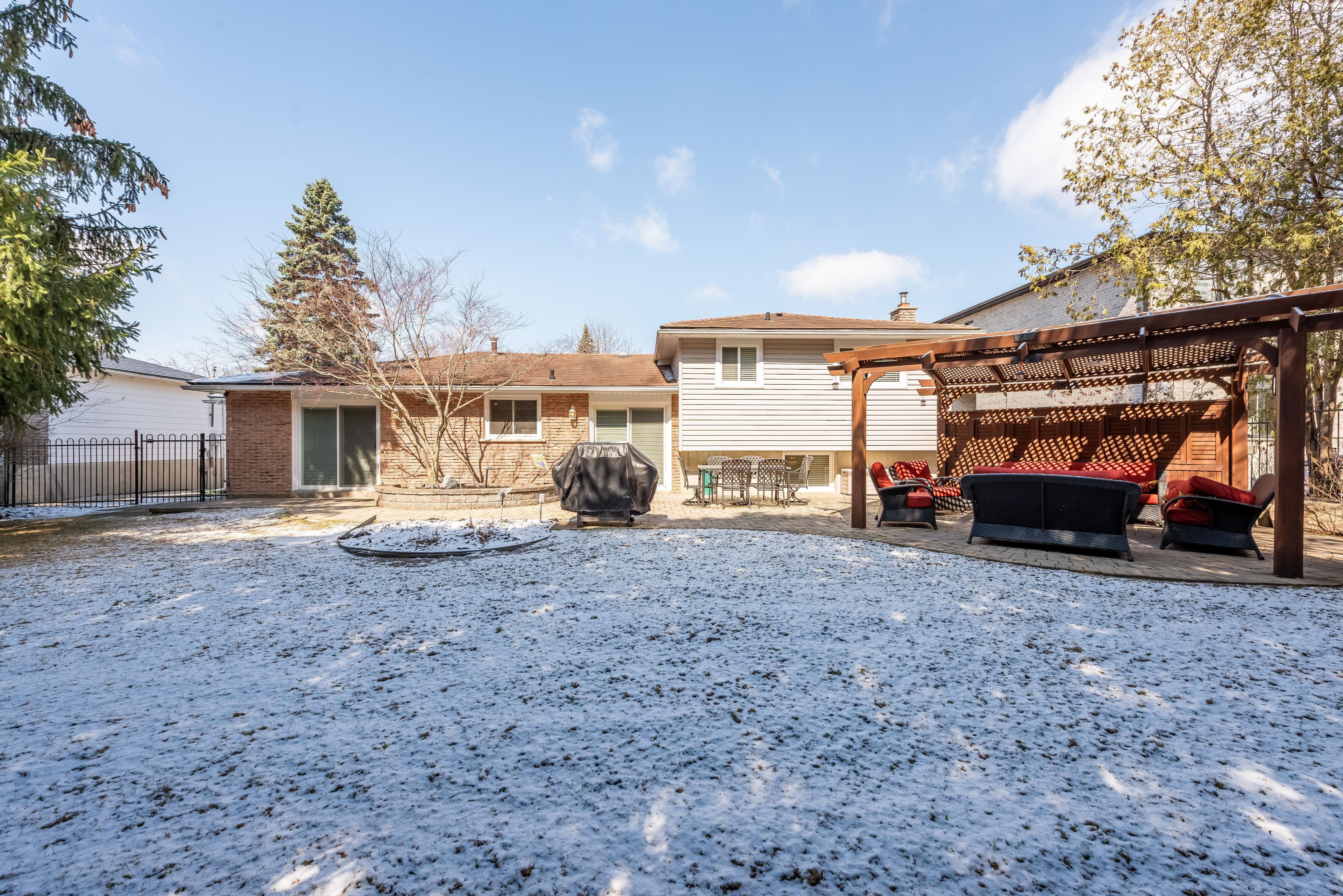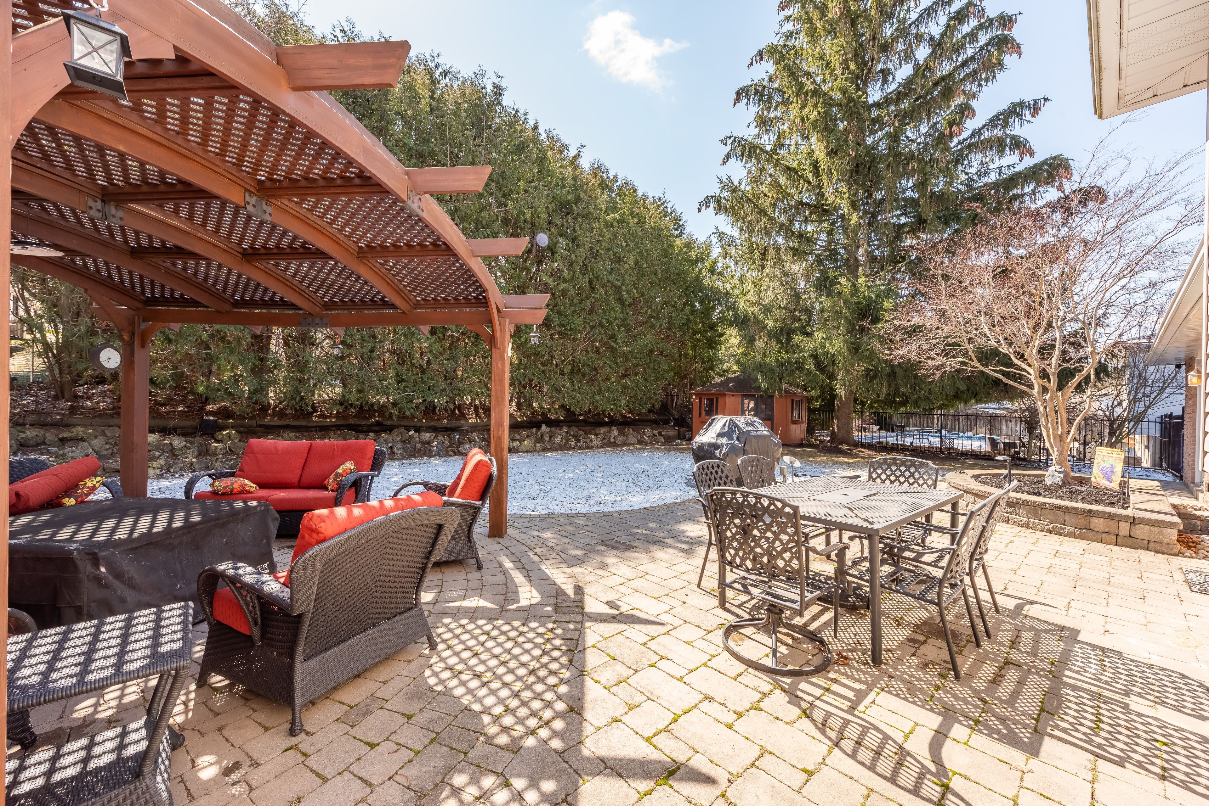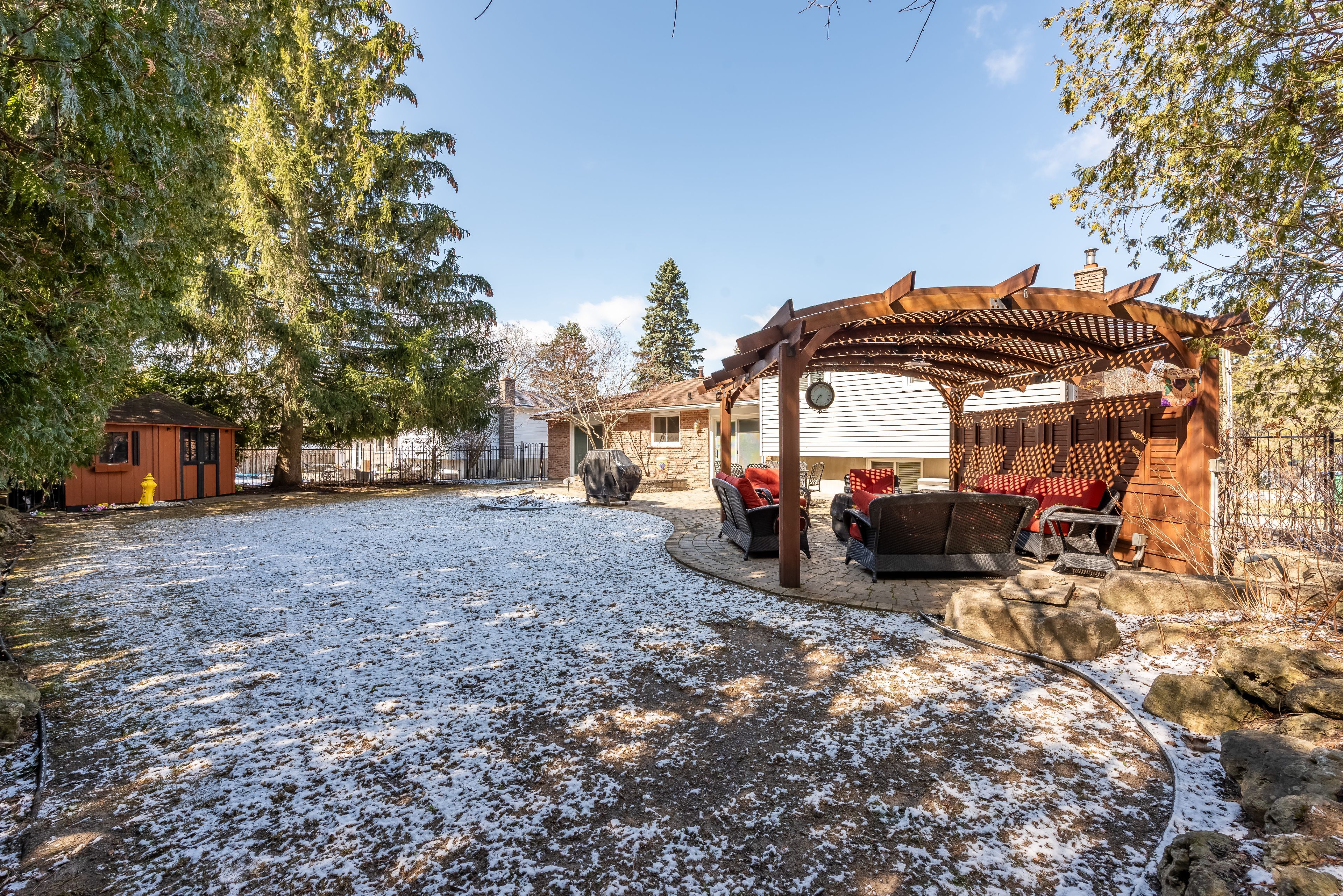 • Low maintenance backyard with patio, pergola, and in-ground sprinklers.