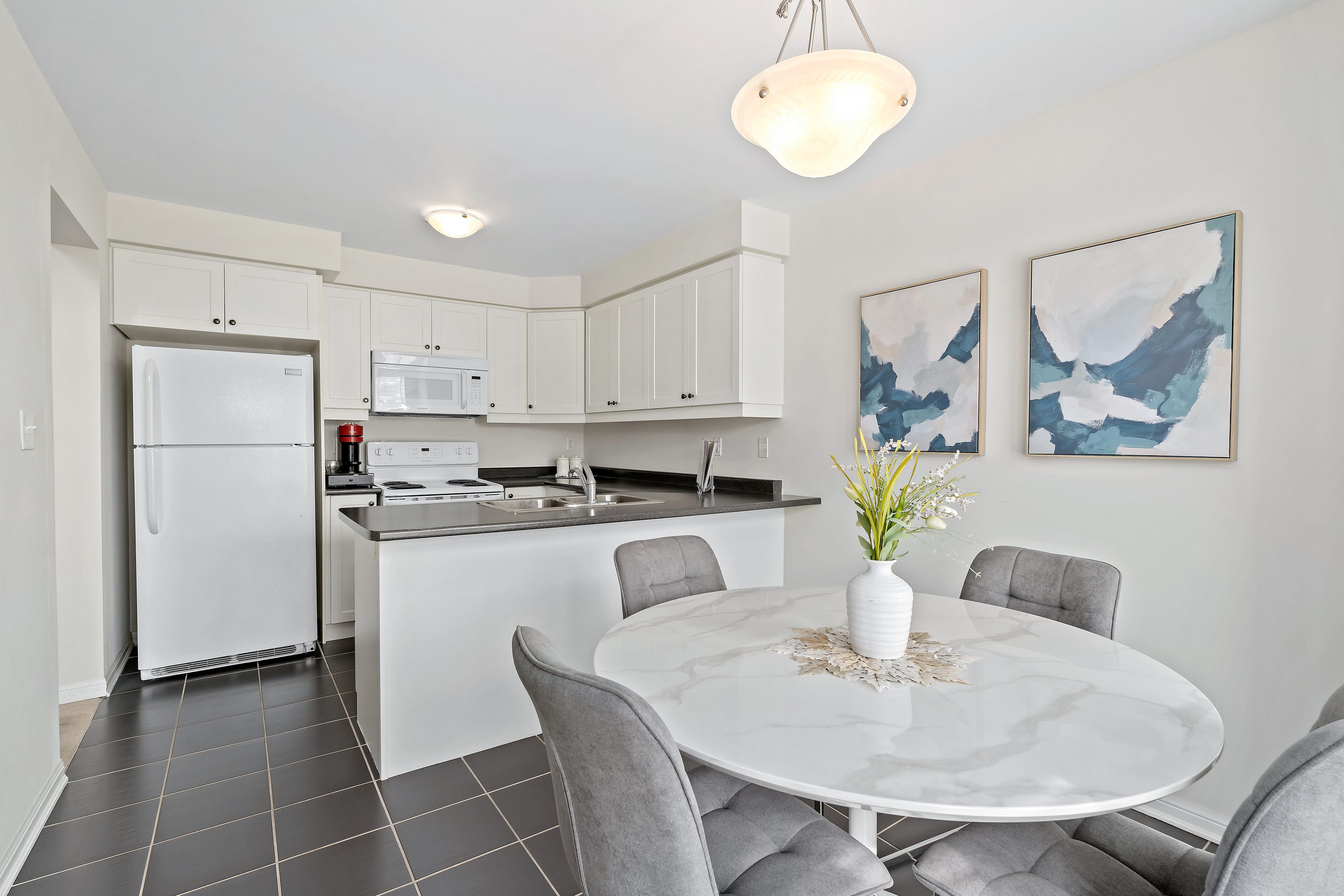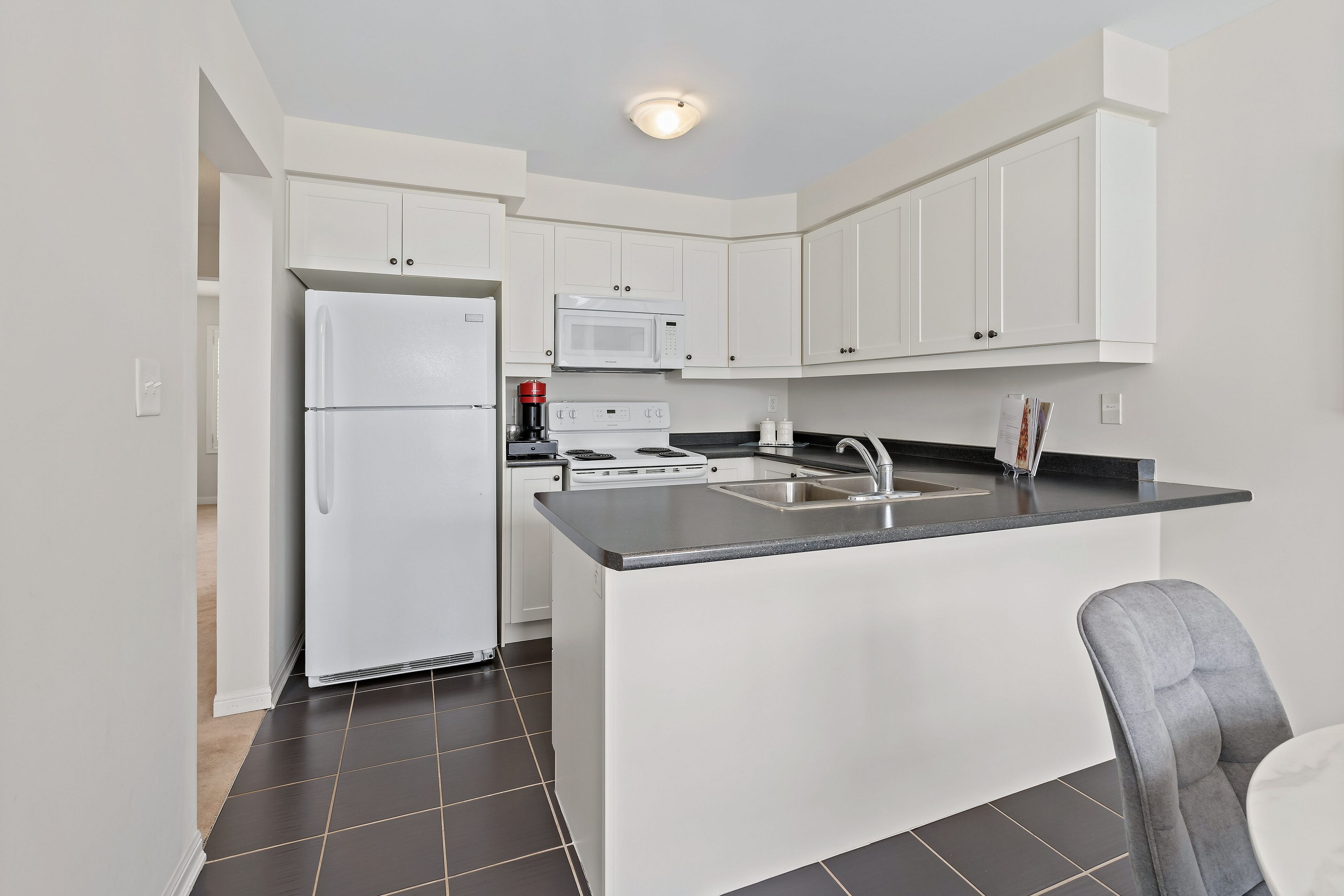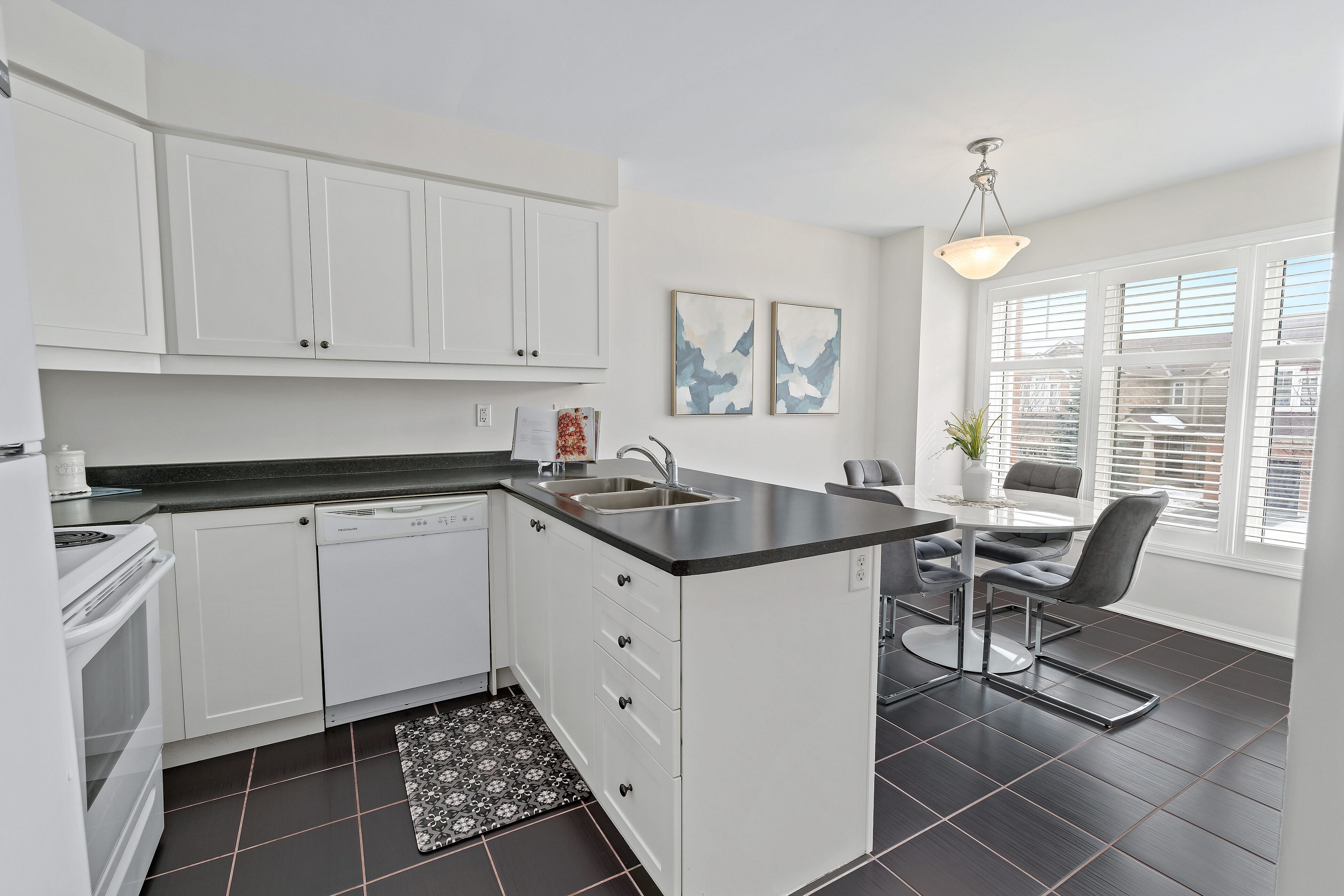 • Functional eat-in kitchen with ample counter space and storage.