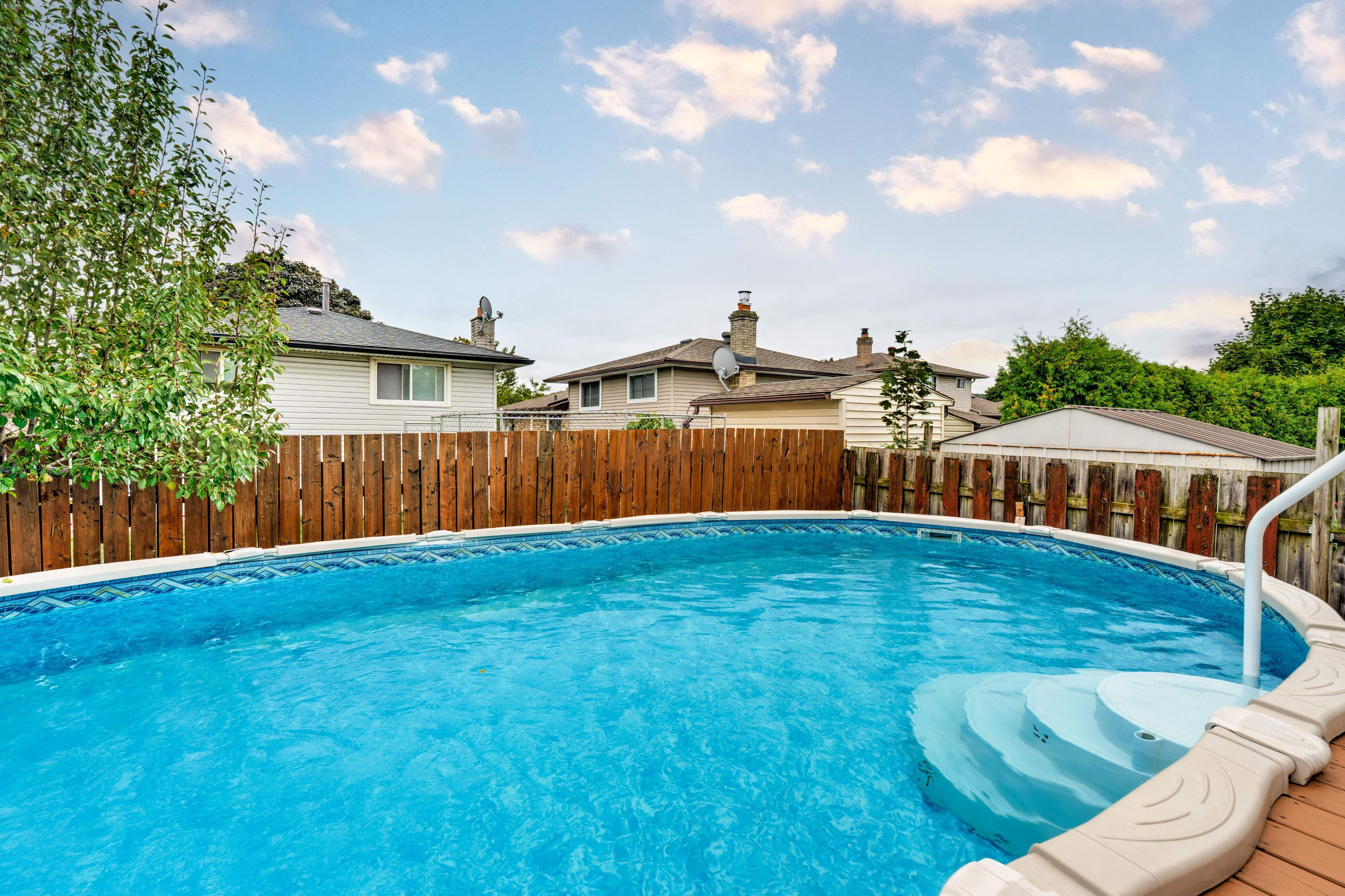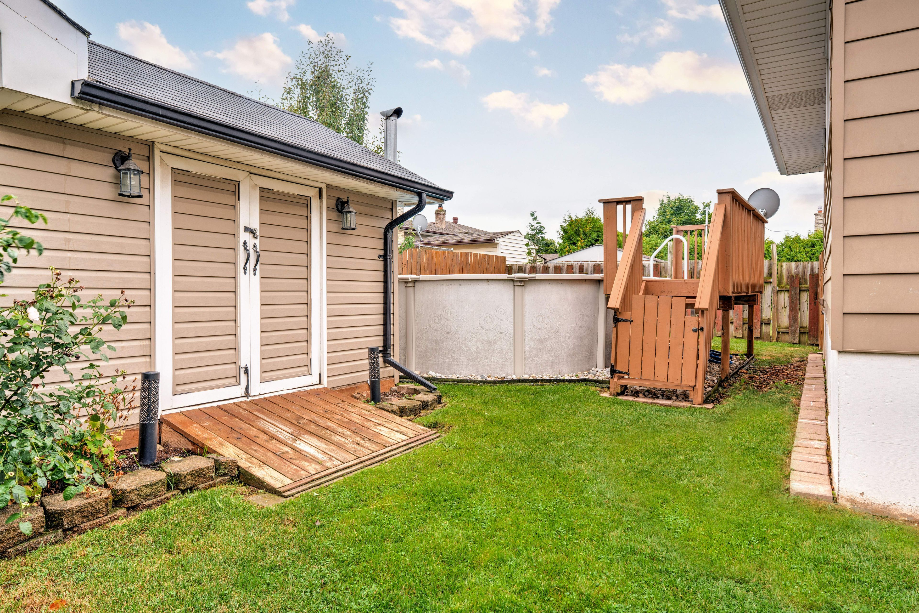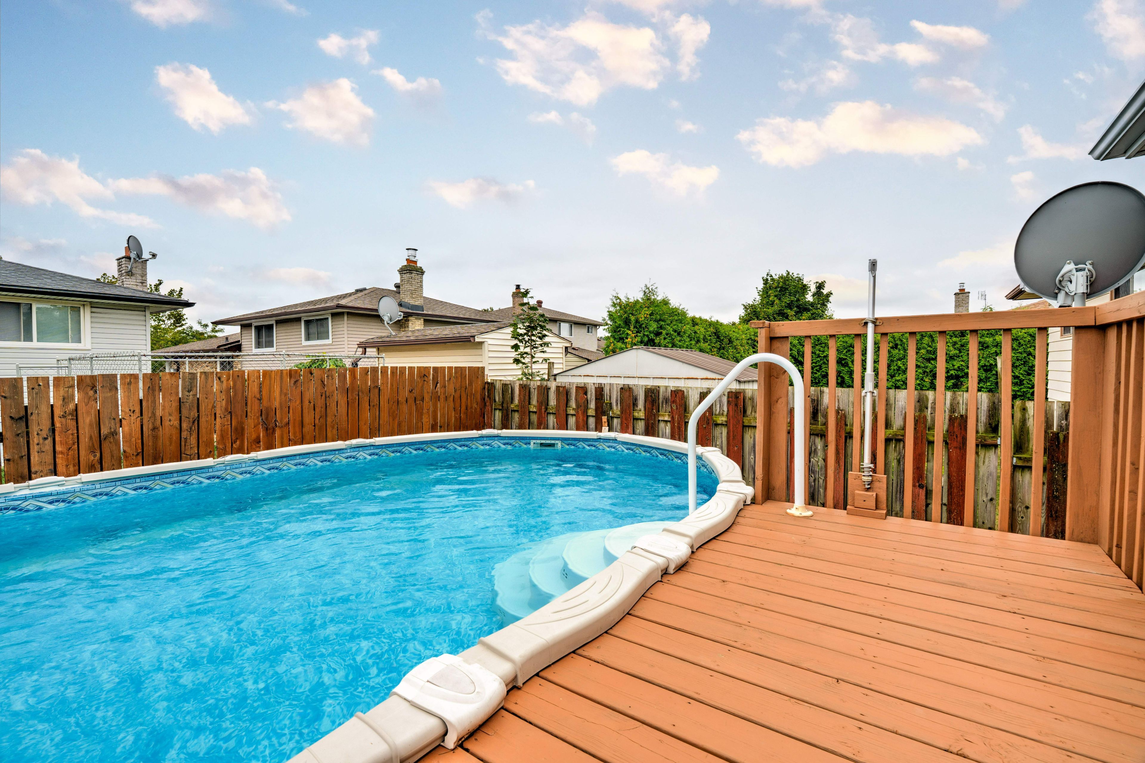 • Private backyard includes an above-ground pool and deck for summer fun.