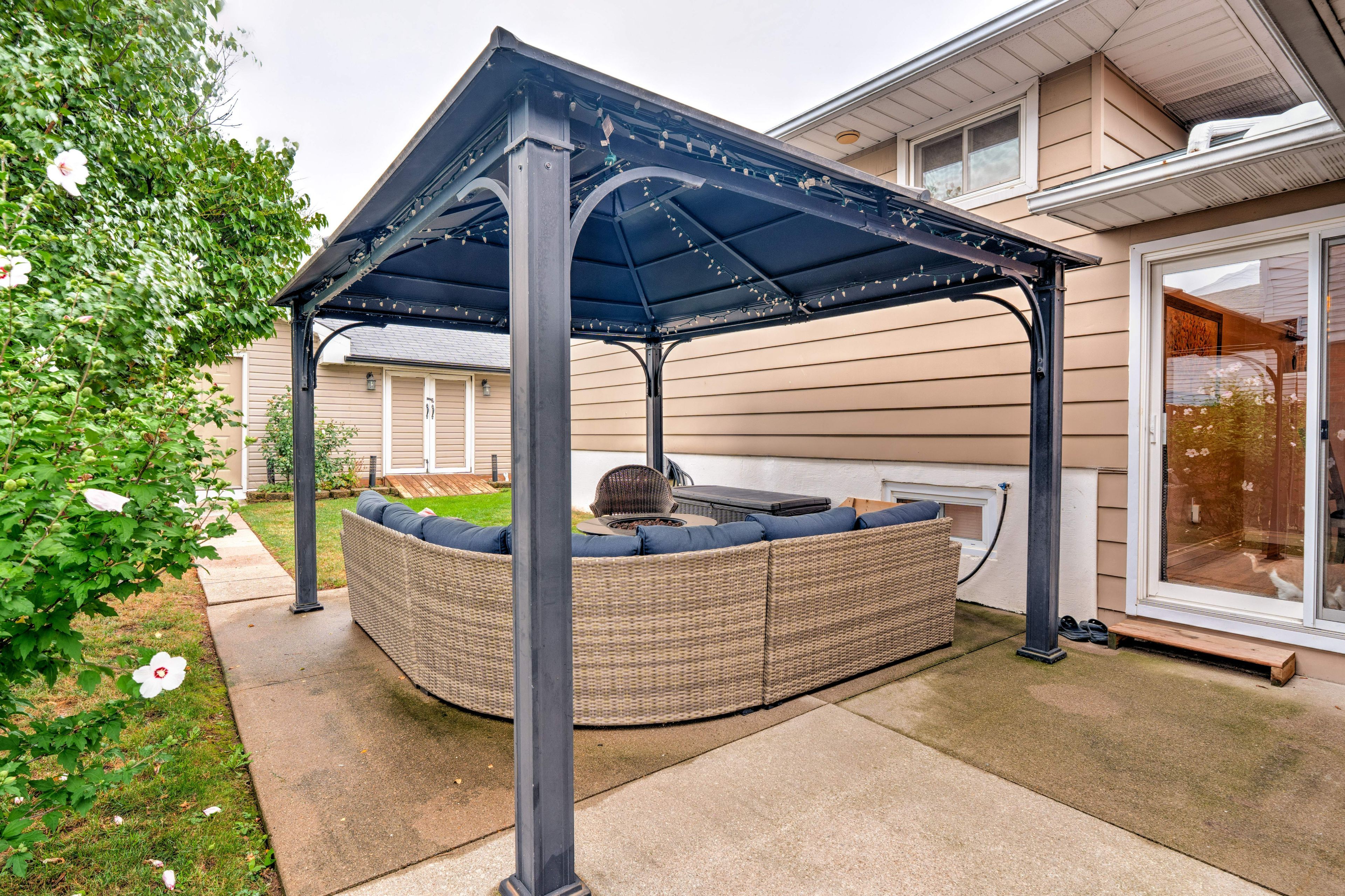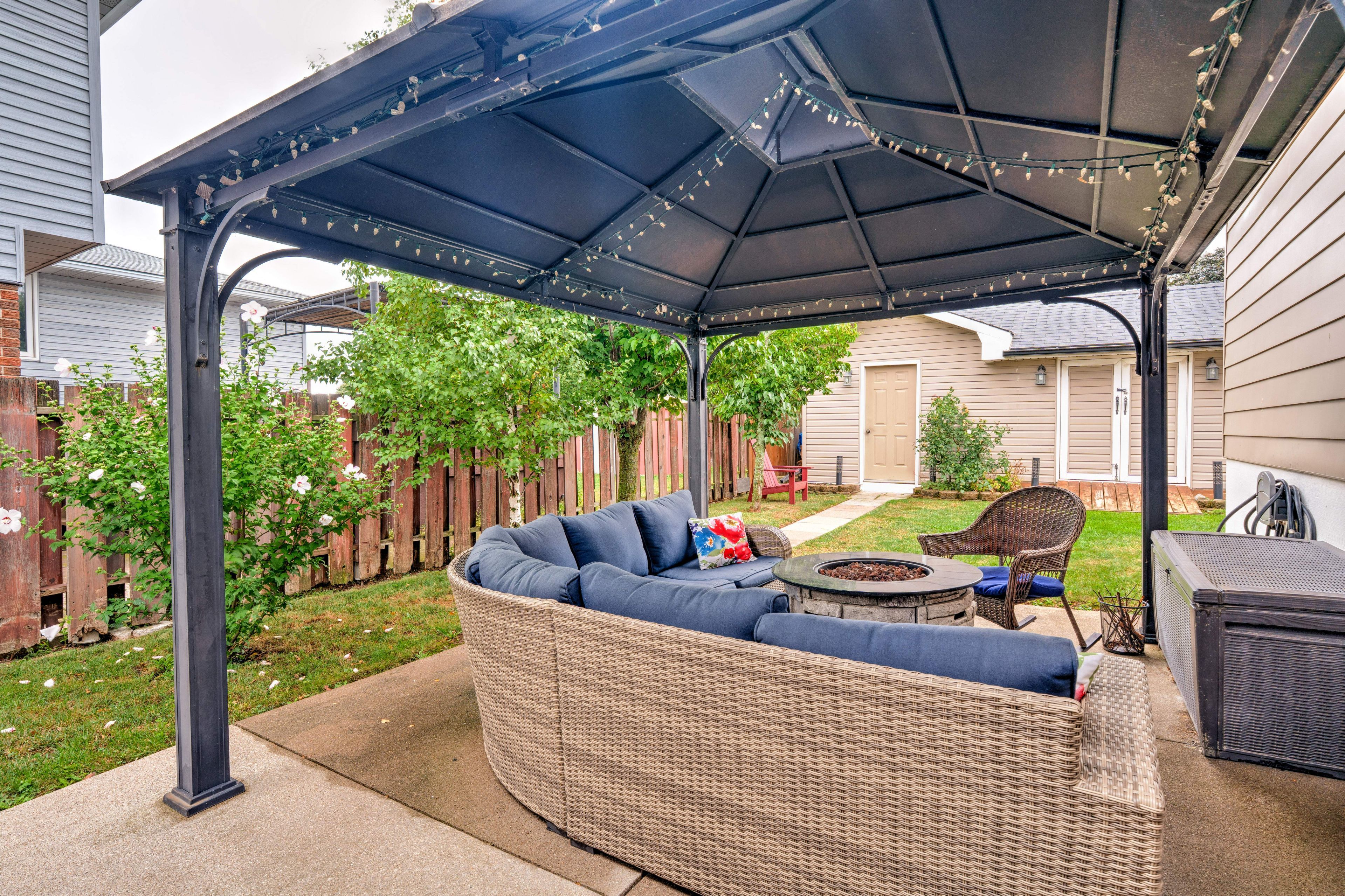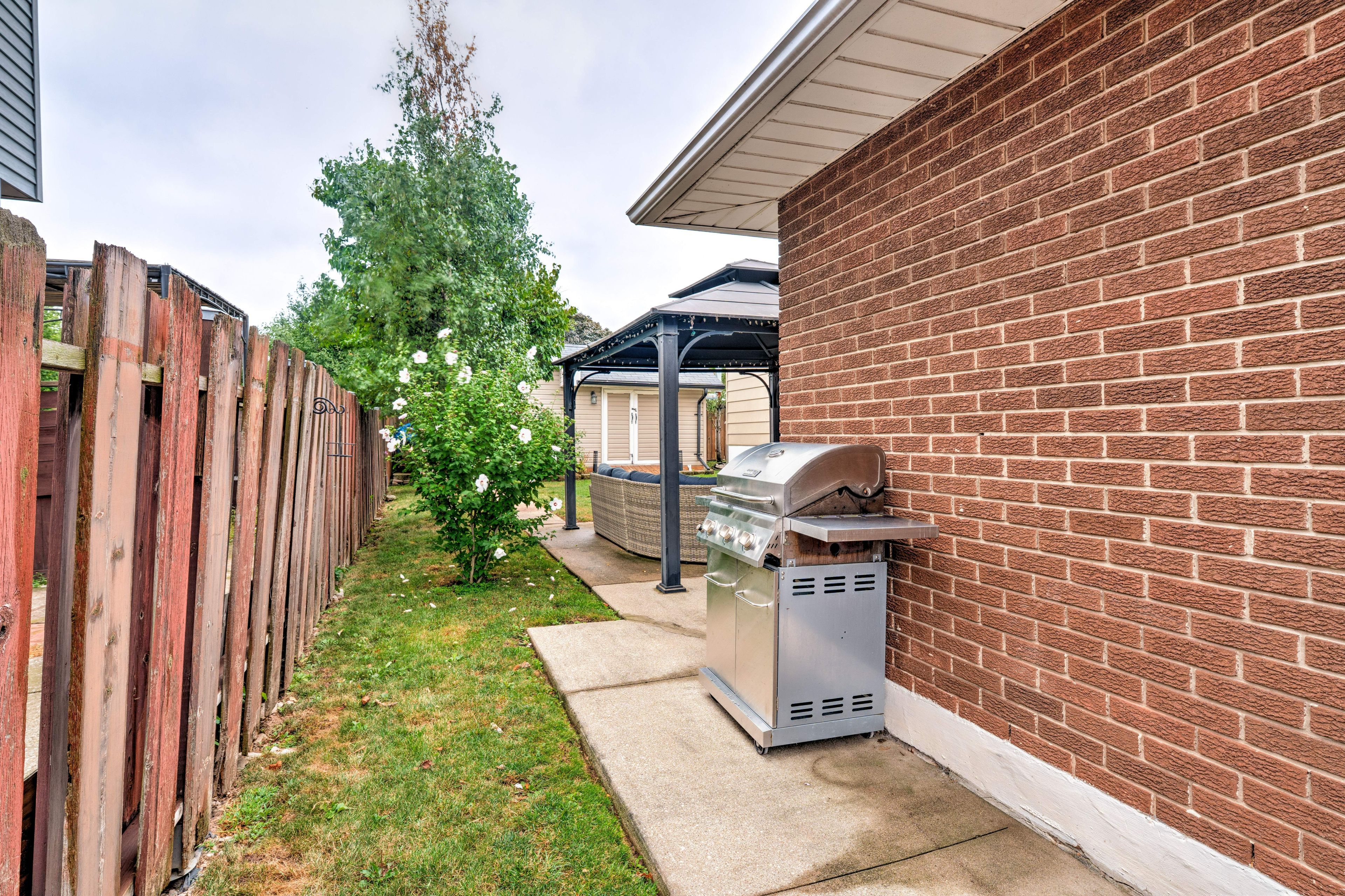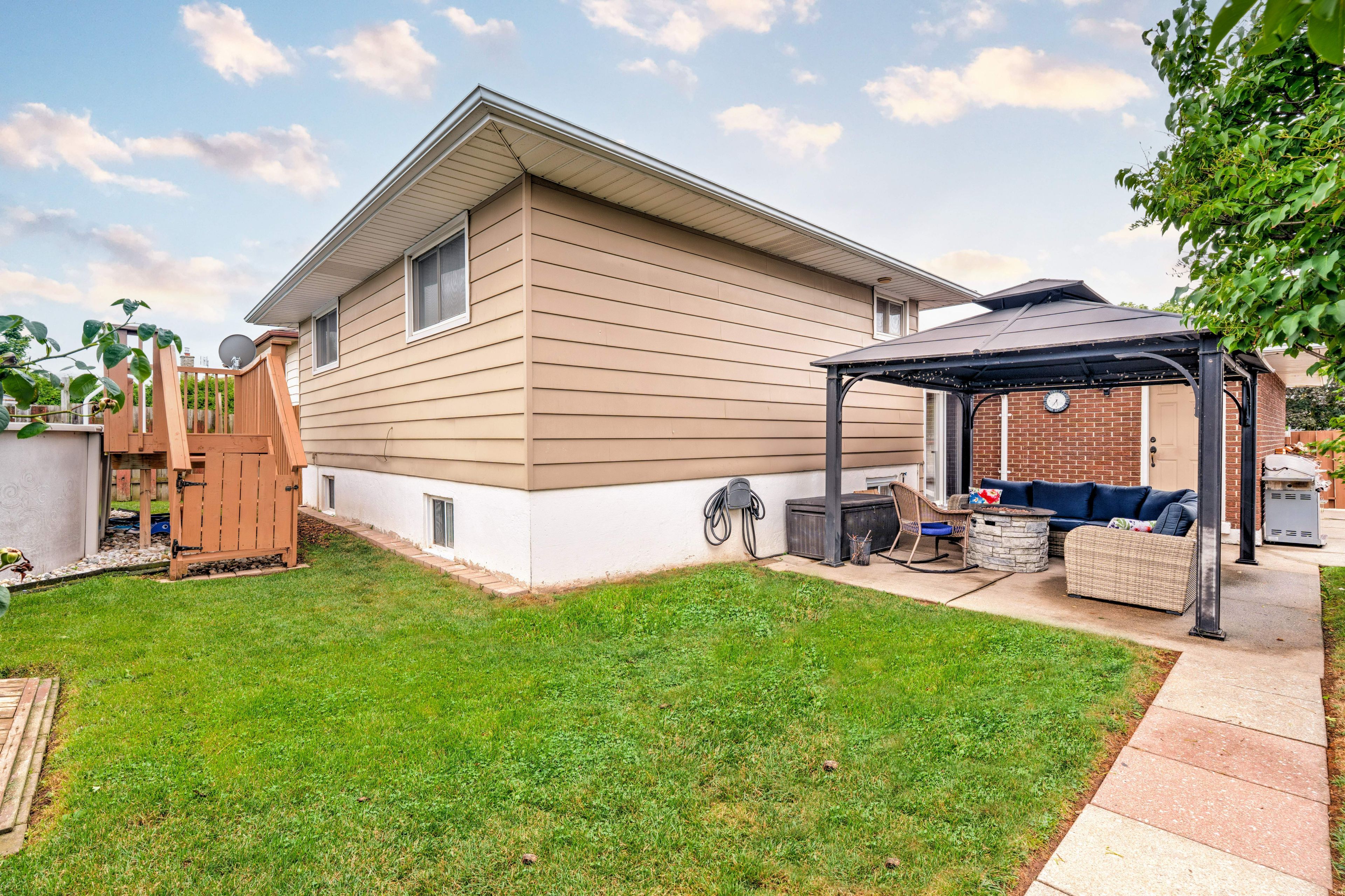 • Private backyard includes an above-ground pool and deck for summer fun.