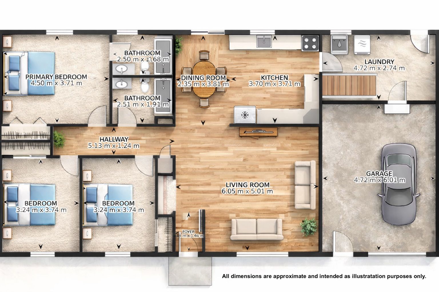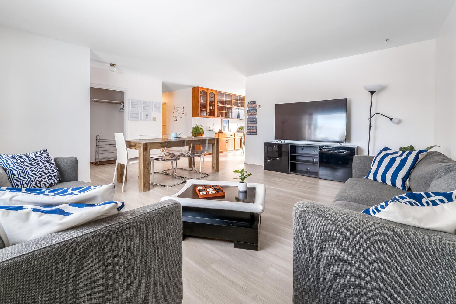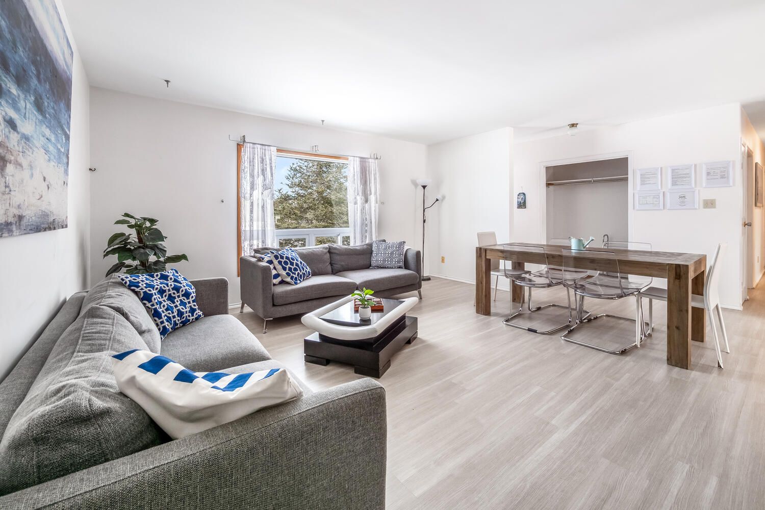 • Spacious open-concept kitchen, dining, and living area with patio walkout.