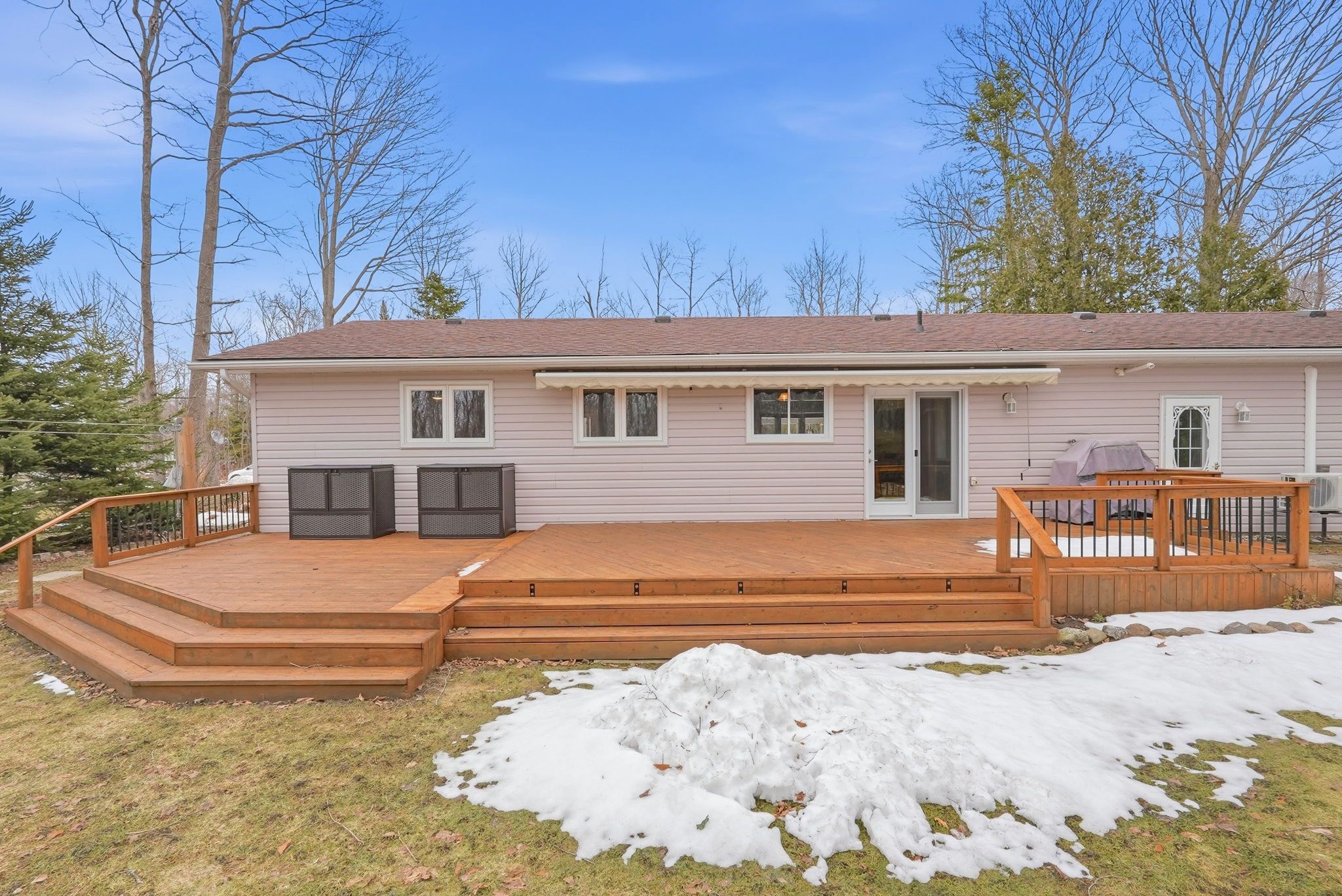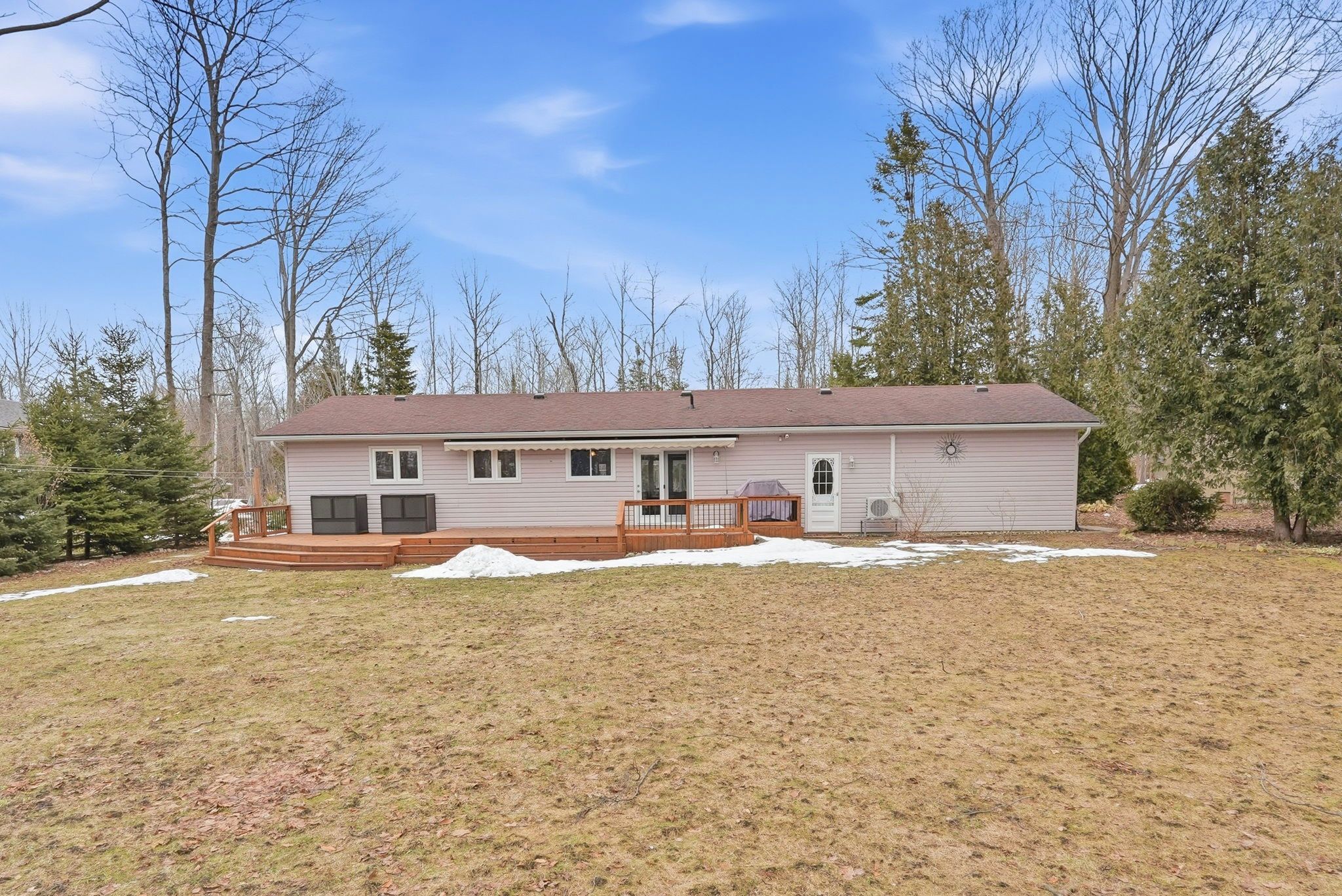 A lovely bungalow with great curb appeal in sauble beach, set on a sprawling lot graced by tall trees, offering privacy, space, and natural beauty. This property features landscaped grounds with pretty, low-maintenance gardens, a poured concrete driveway with drainage, and a covered poured concrete front porch running the full length of the house. The backyard is a true entertainer's dream with a beautiful big deck and large electric awning, plus a natural gas hookup for bbq and a quality mennonite-built shed. This accessible and move-in ready home features an open-concept layout with tasteful finishes, such as a built-in gas fireplace with new insert (dec 2025) and an updated kitchen with all stainless-steel appliances including gas cooking. The washroom features radiant heated floors and a jet tub! A recently installed heat pump (nov 2025) offers efficient heating and cooling. Additional features include hot water on demand, central vac, insulated garage with a large, heated bonus room, and a spray-foam insulated crawl space. Attic insulation upgraded to approximately r-50. A low maintenance home with great use of space, excellent storage, and privacy blinds throughout. Versatile and well cared for, this property is perfect as a primary home, four-season cottage retreat, or vacation rental. Pride of ownership is very evident after 20 years with the same owner.