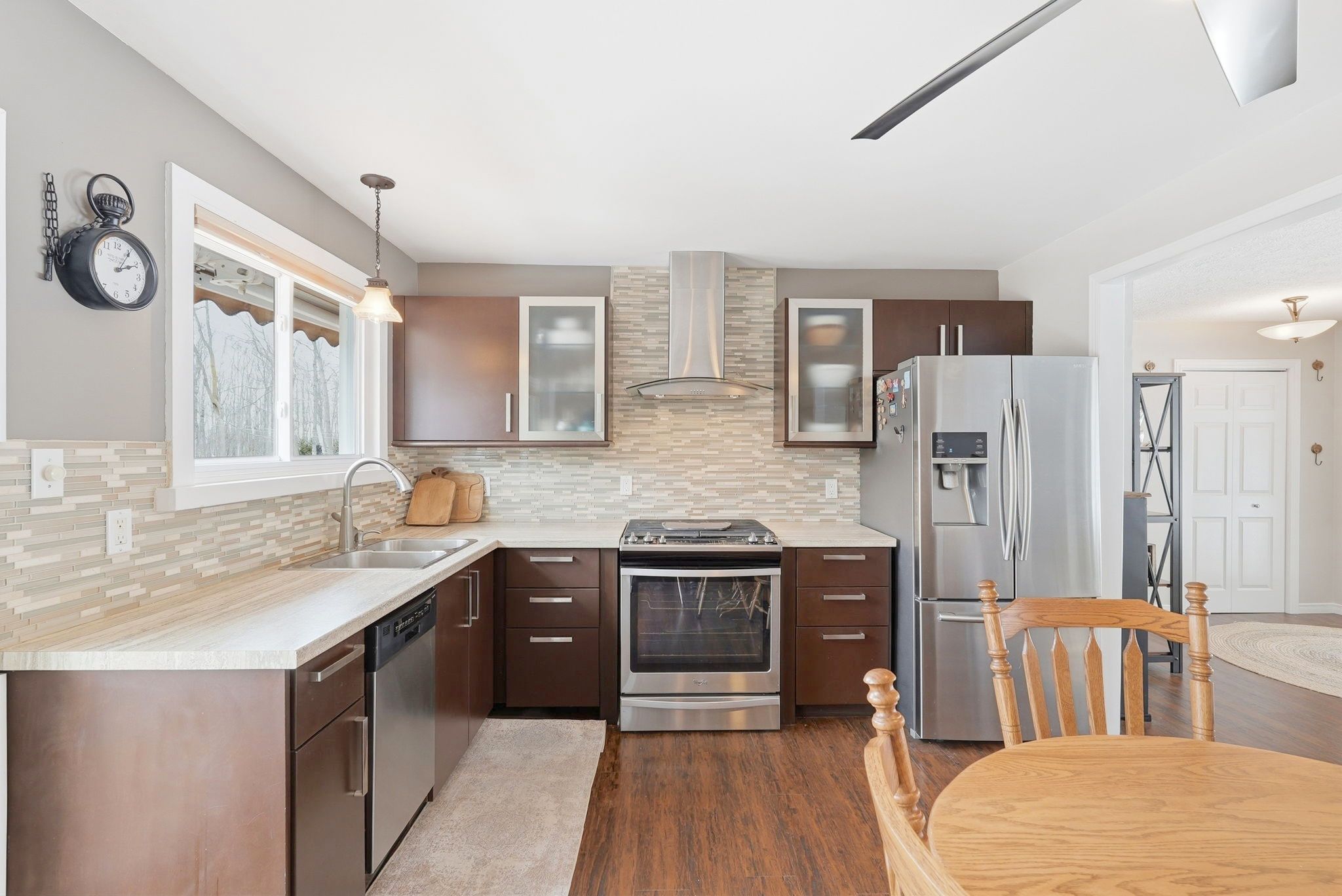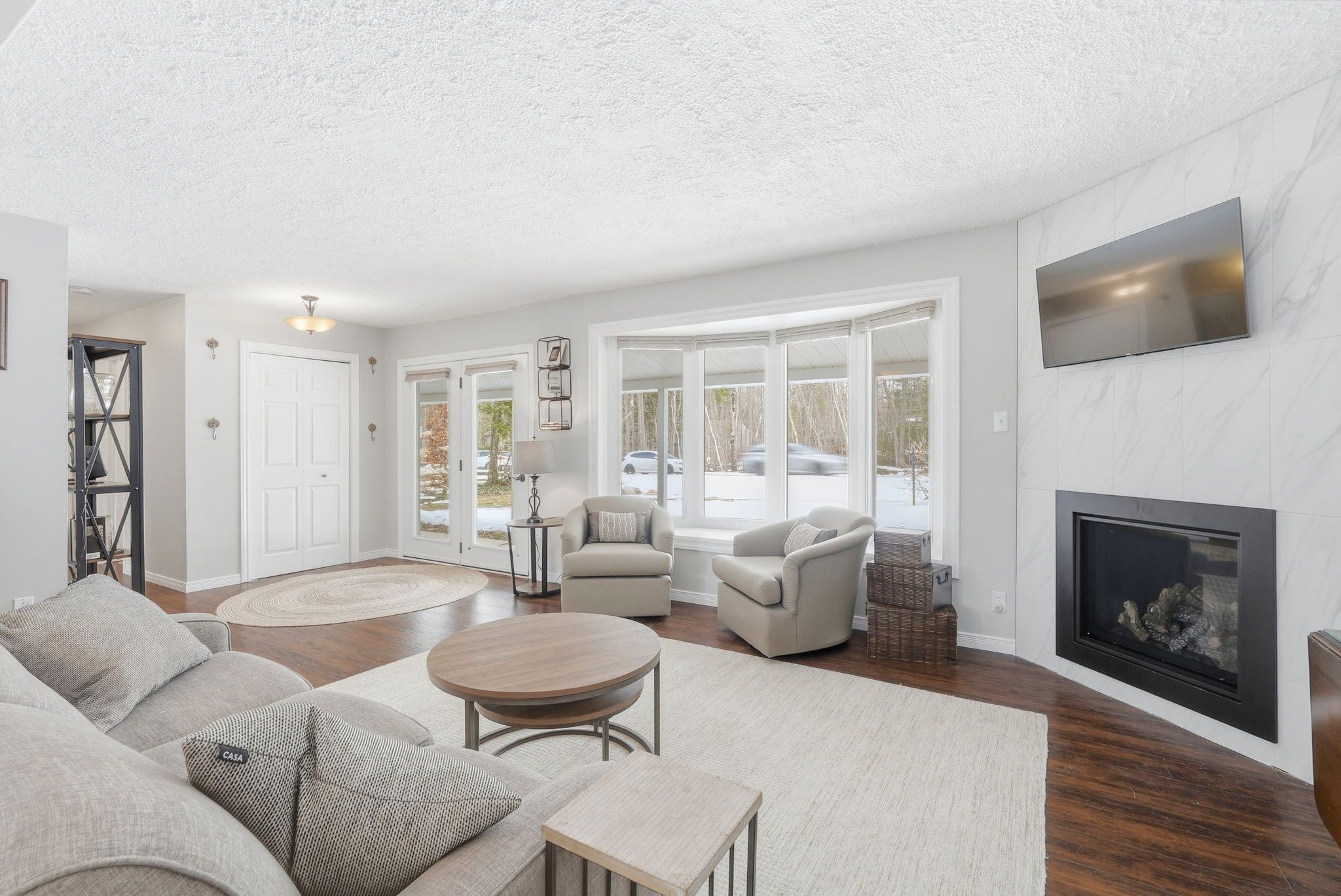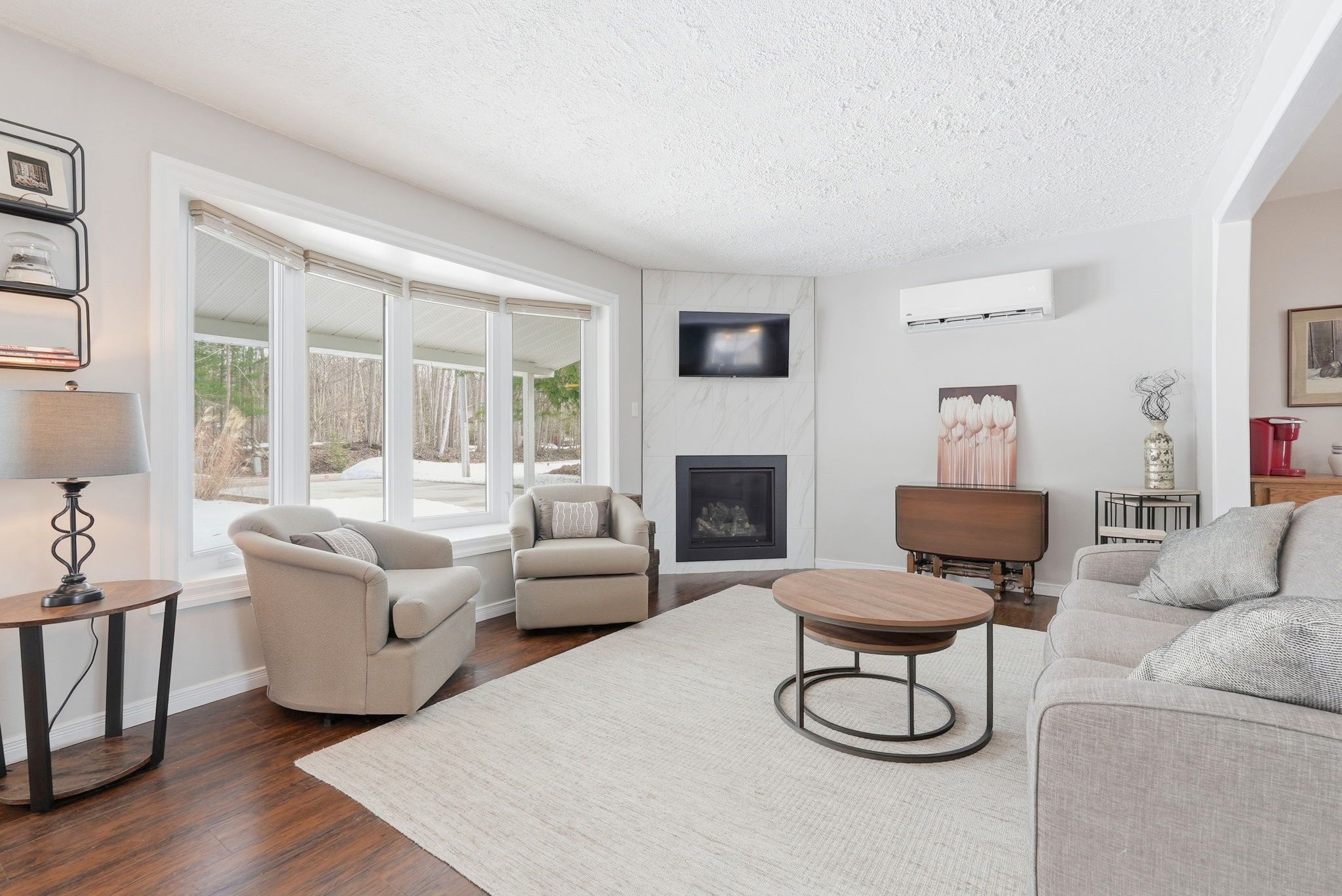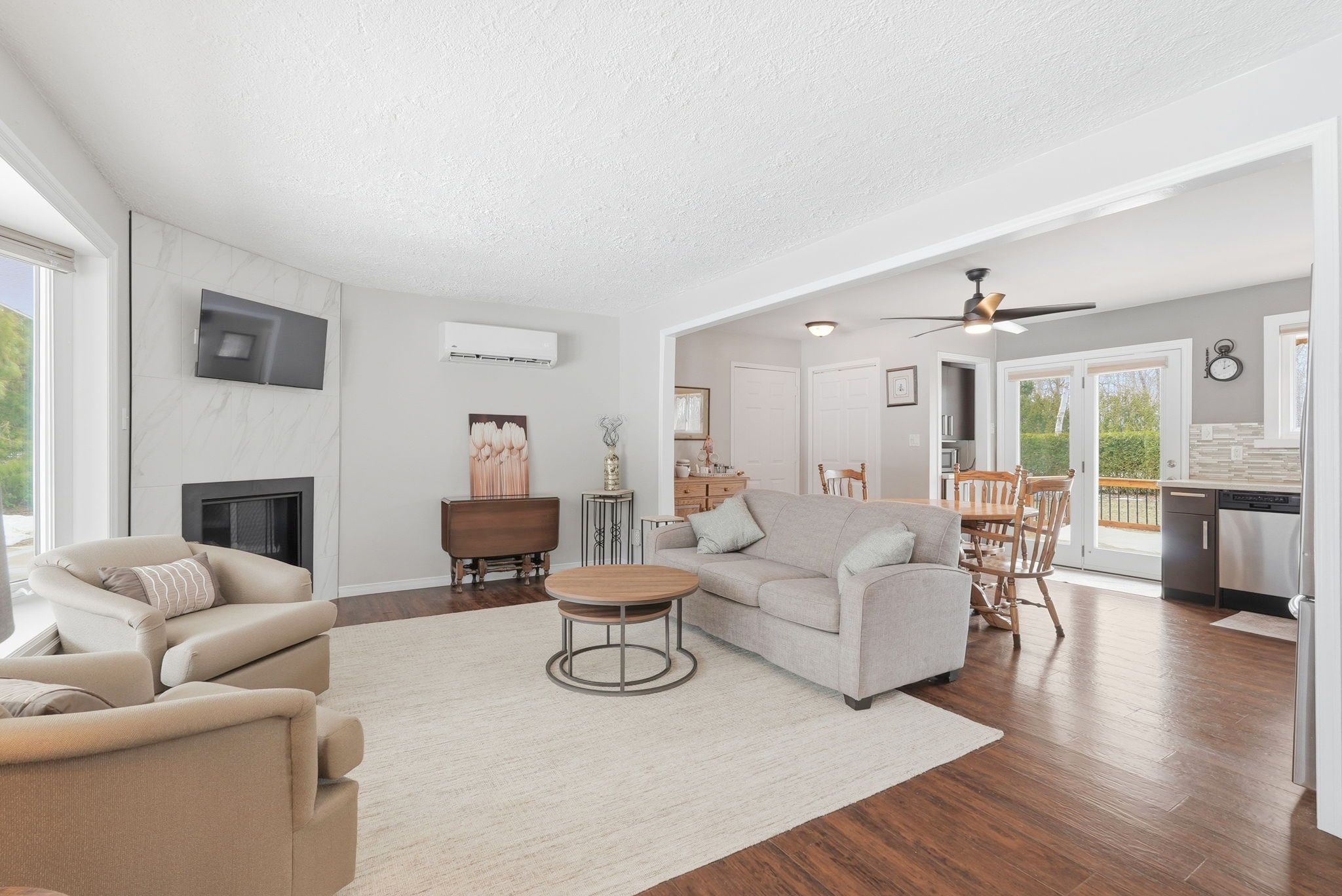 • Open-concept layout featuring a stylish kitchen and gas fireplace.