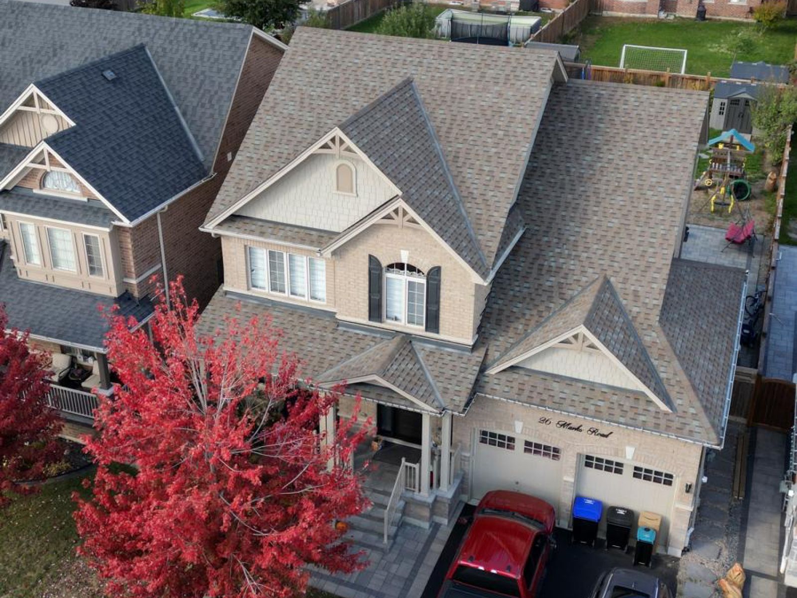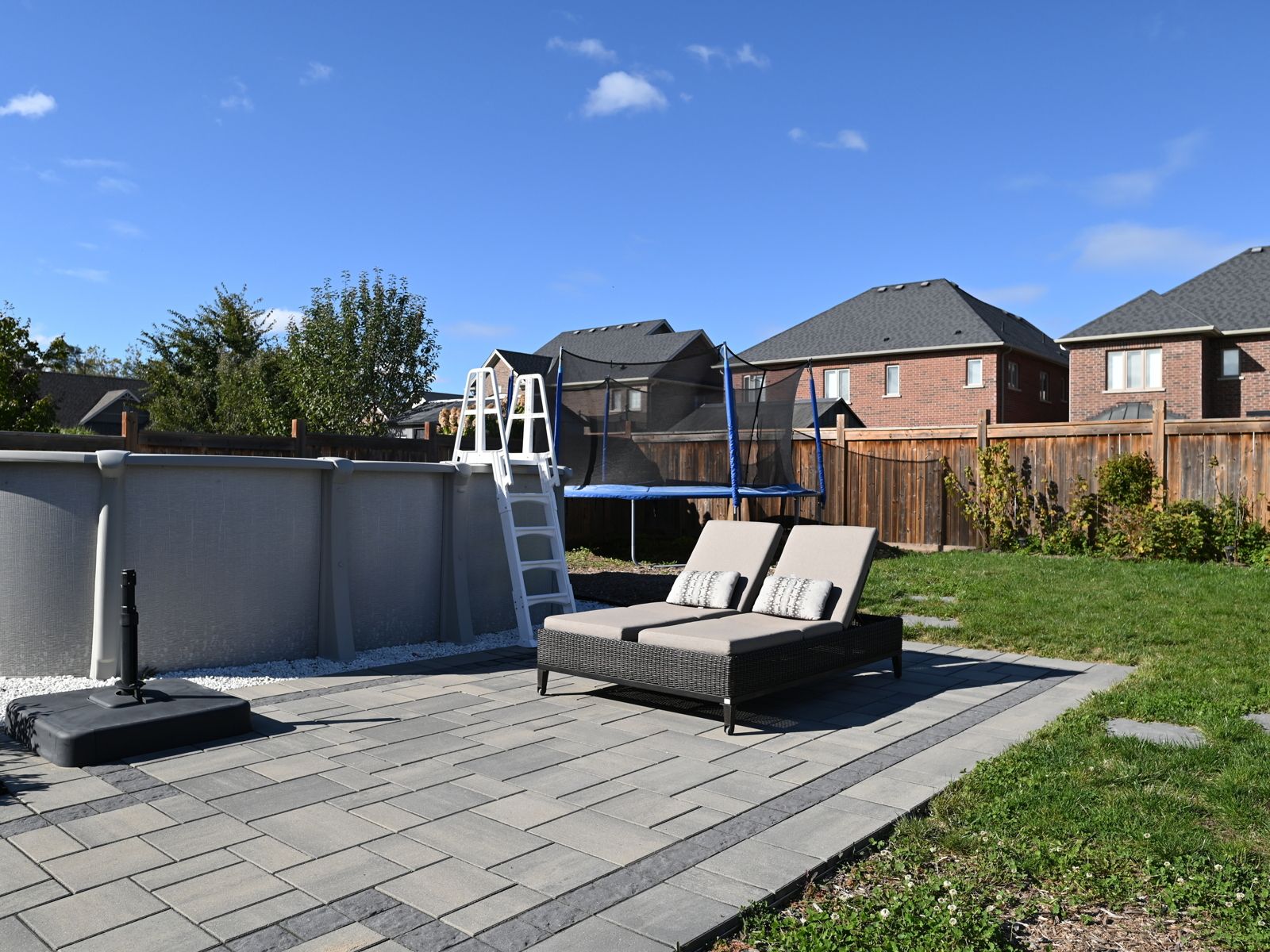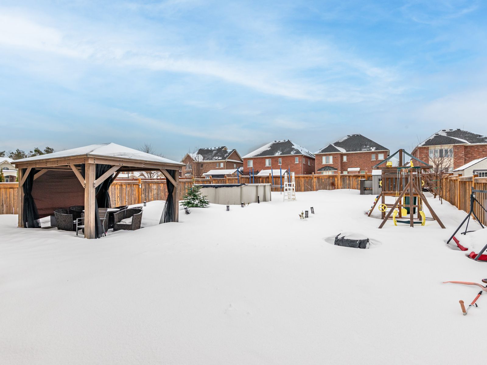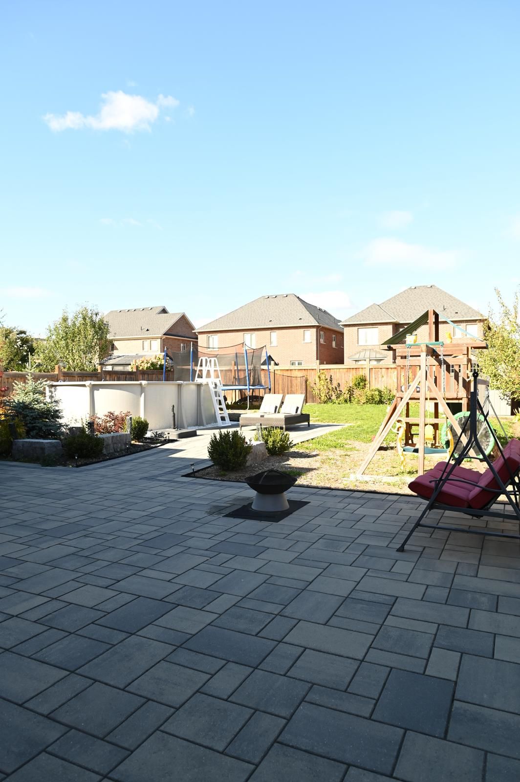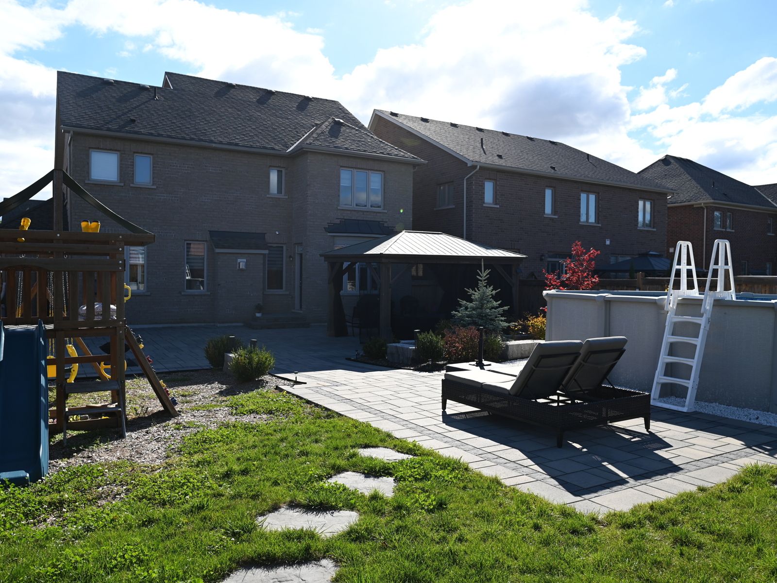 • Professionally landscaped backyard with a pool, gazebo, and play areas.