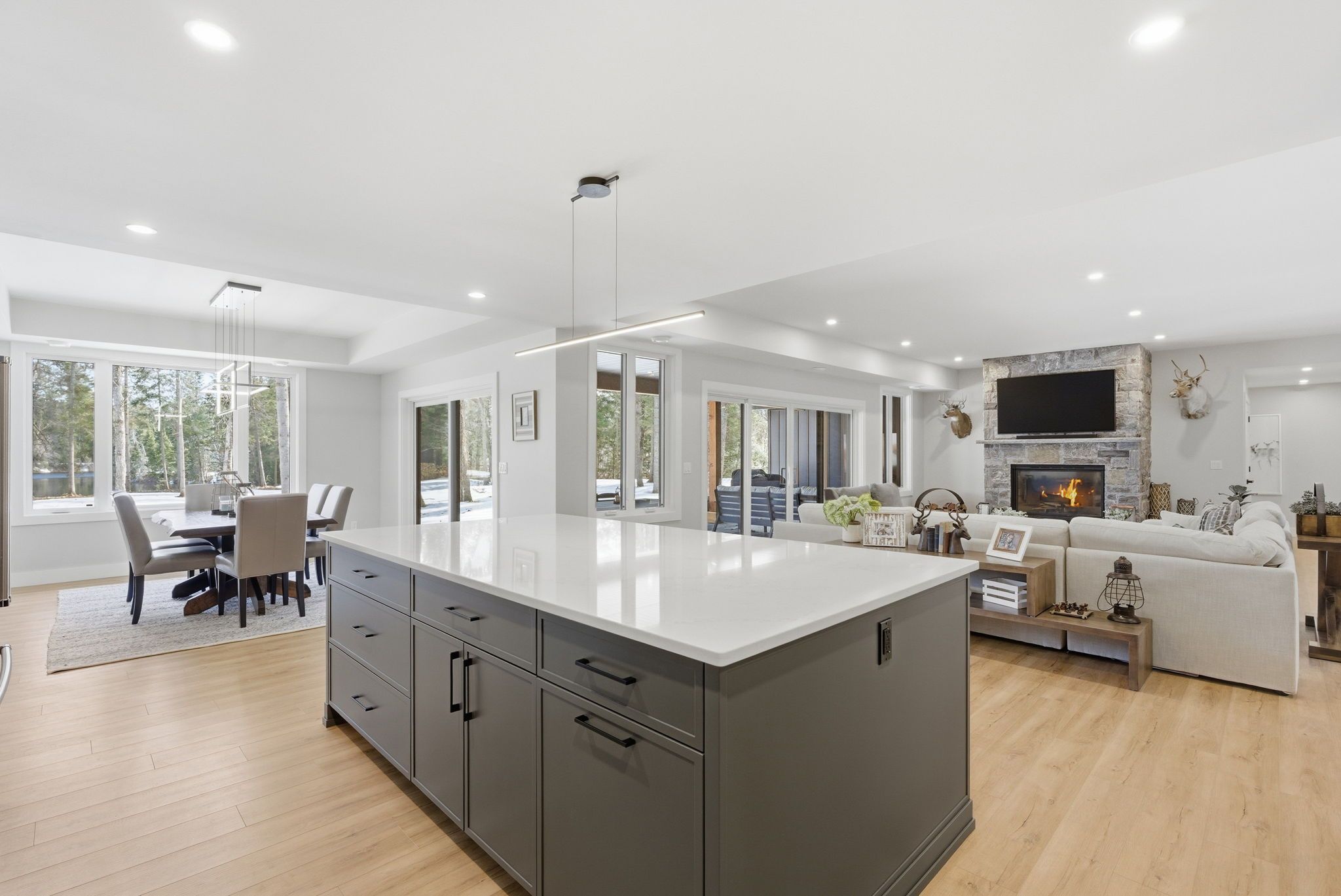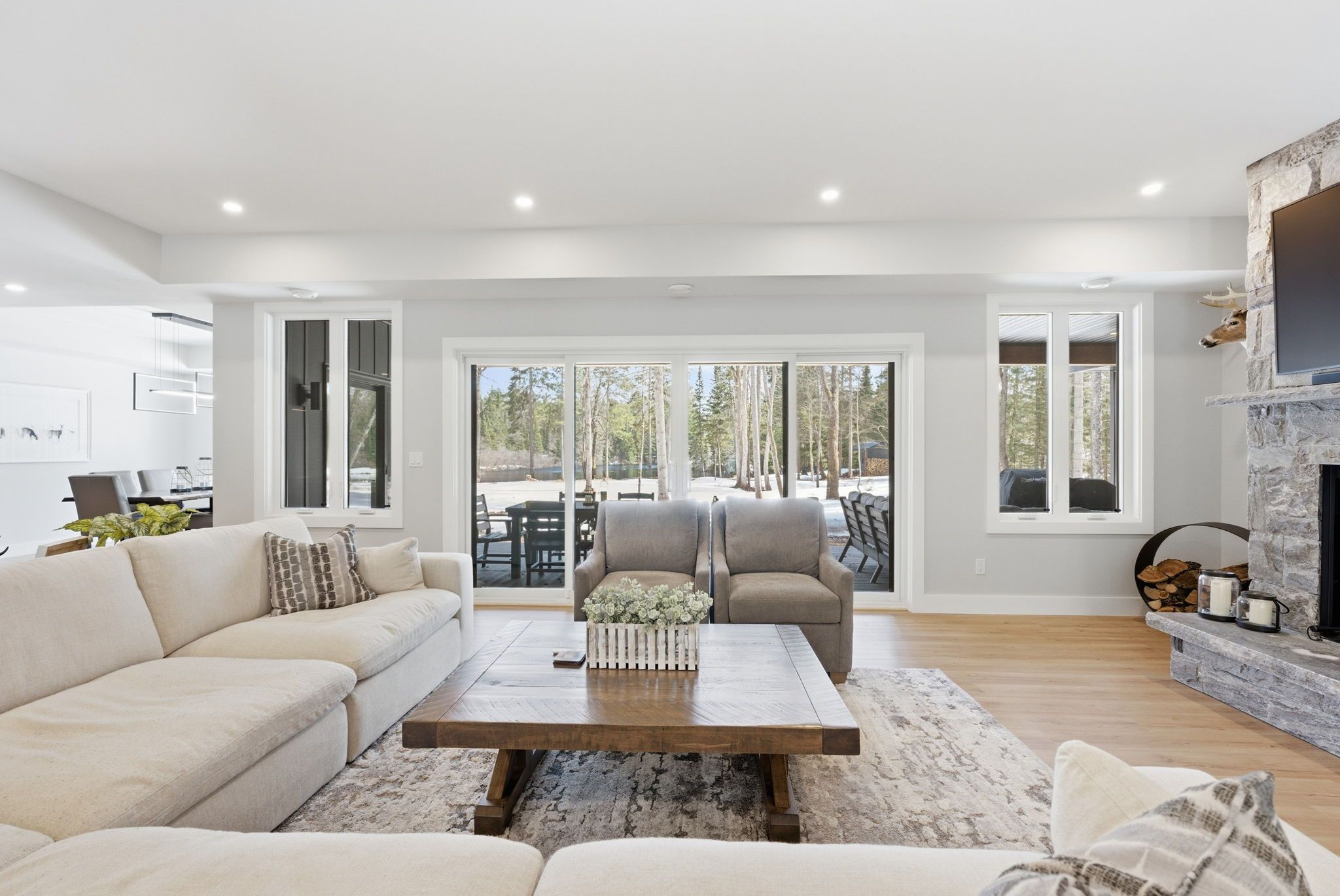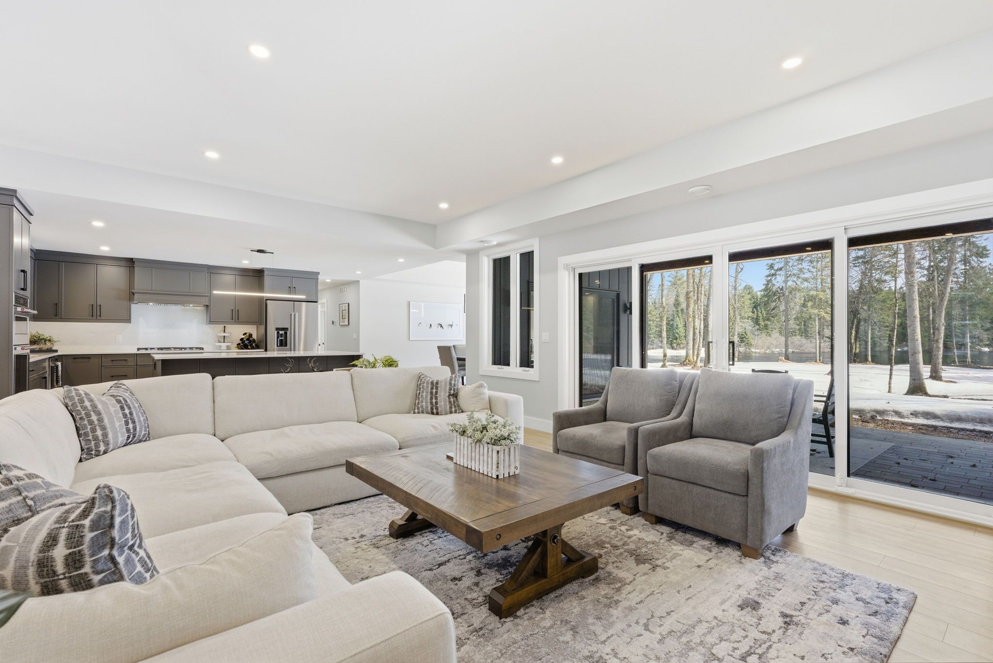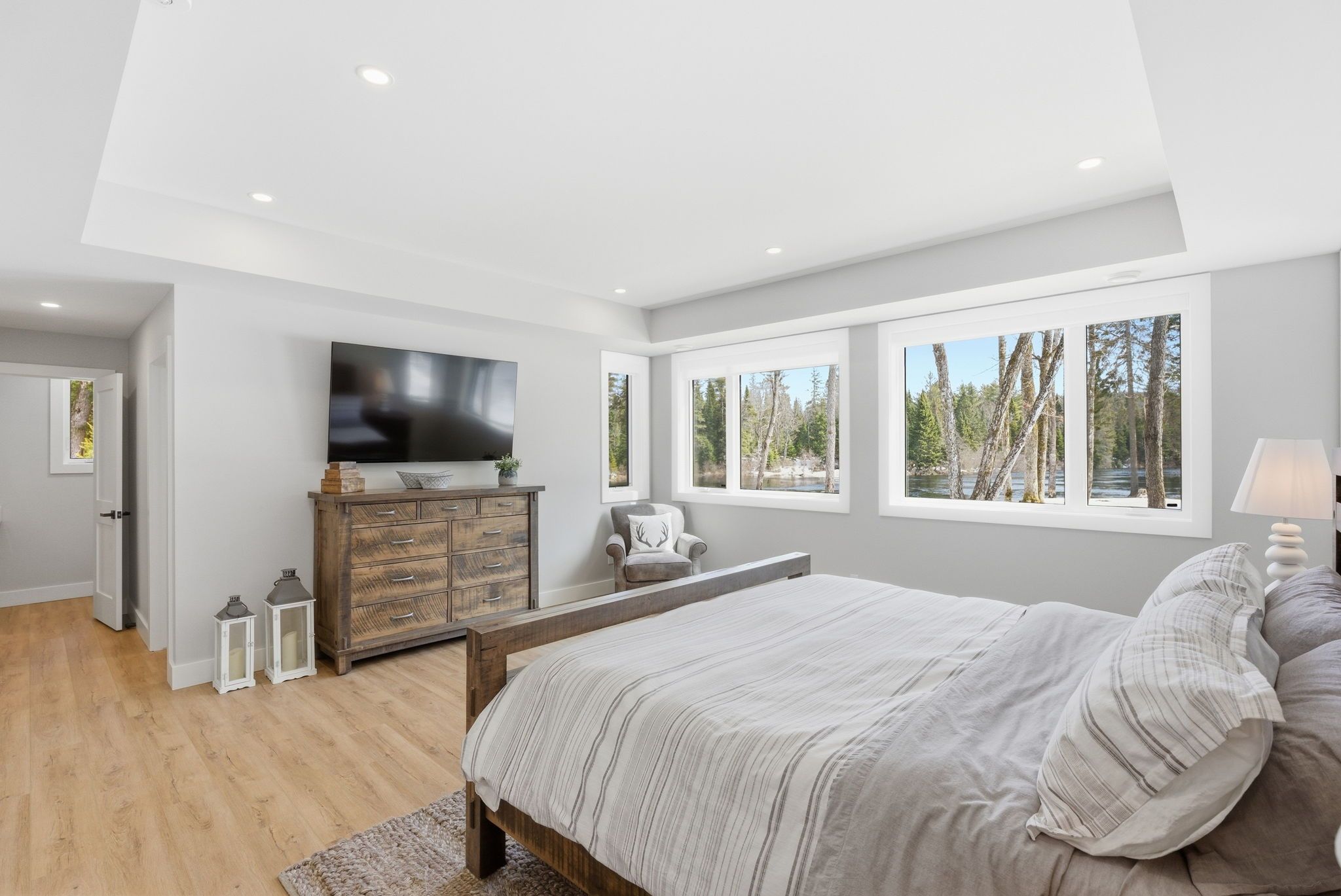 Set along a calm stretch of the north branch of the muskoka river, this newly built, single-level ranch style bungalow offers a functional layout, strong privacy, and a setting that's easy to enjoy year-round. Situated on one of the widest sections of the river along this stretch, between two sets of falls, there is plenty of space to enjoy the water safely, with the ability to boat locally and spend time at nearby balsam chutes. With gentle water flow, this section of the river is well-suited for both adults and kids to swim, making it ideal for family use. Built in 2025 and offering approximately 3,100 sq ft of living area, the home features 4 spacious bedrooms and 4 bathrooms. The layout is thoughtfully designed with the primary suite set on one side of the home with views of the water, and three additional bedrooms on the opposite side, providing separation and flexibility for families or guests. The main living area is bright and open, with a granite stone fireplace feature and a practical kitchen layout with a large island that includes ample cupboard and storage space, including a walk-in pantry. Radiant in-floor heating runs throughout the home, supported by propane forced air, central air conditioning, and on-demand hot water, and a generac backup generator for added peace of mind. Outdoor living has been well considered, with a dedicated entertaining area complete with propane bbq hookup, tv set up, and space to gather. The lot itself is predominantly level and well-treed, offering a high degree of privacy. A standout feature of this property is the two triple garages-a heated and air-conditioned attached garage with in-floor heat, plus a detached triple garage that is heated, insulated, and powered. A detached shed with power provides additional storage. Located on a municipally maintained year-round road between port sydney and bracebridge, this property is well suited for full-time living or a recreational retreat.