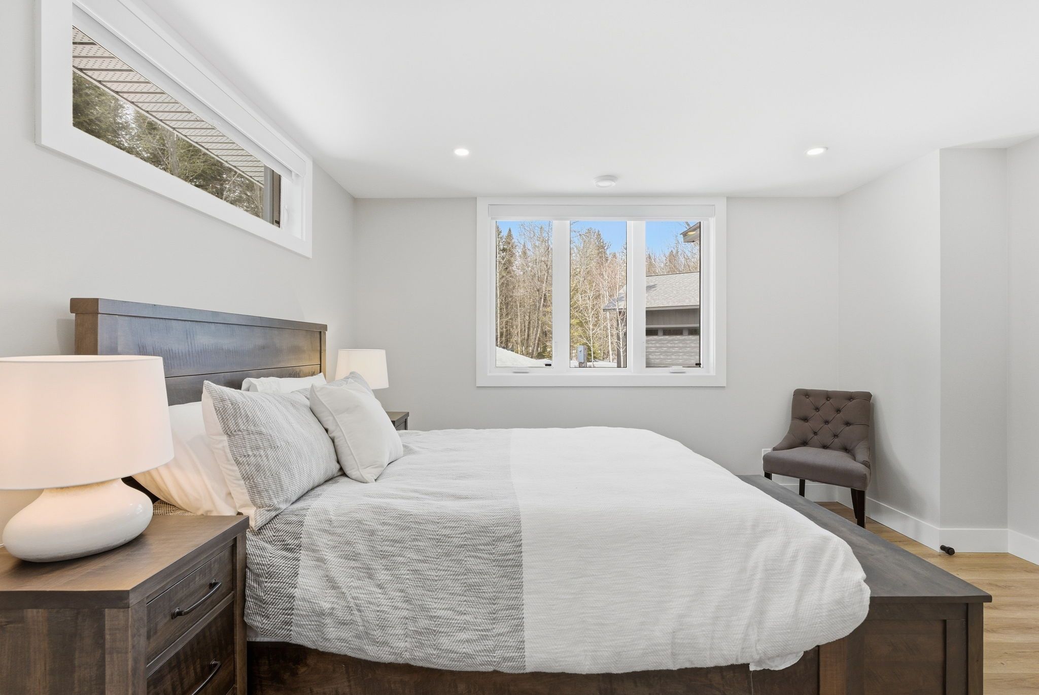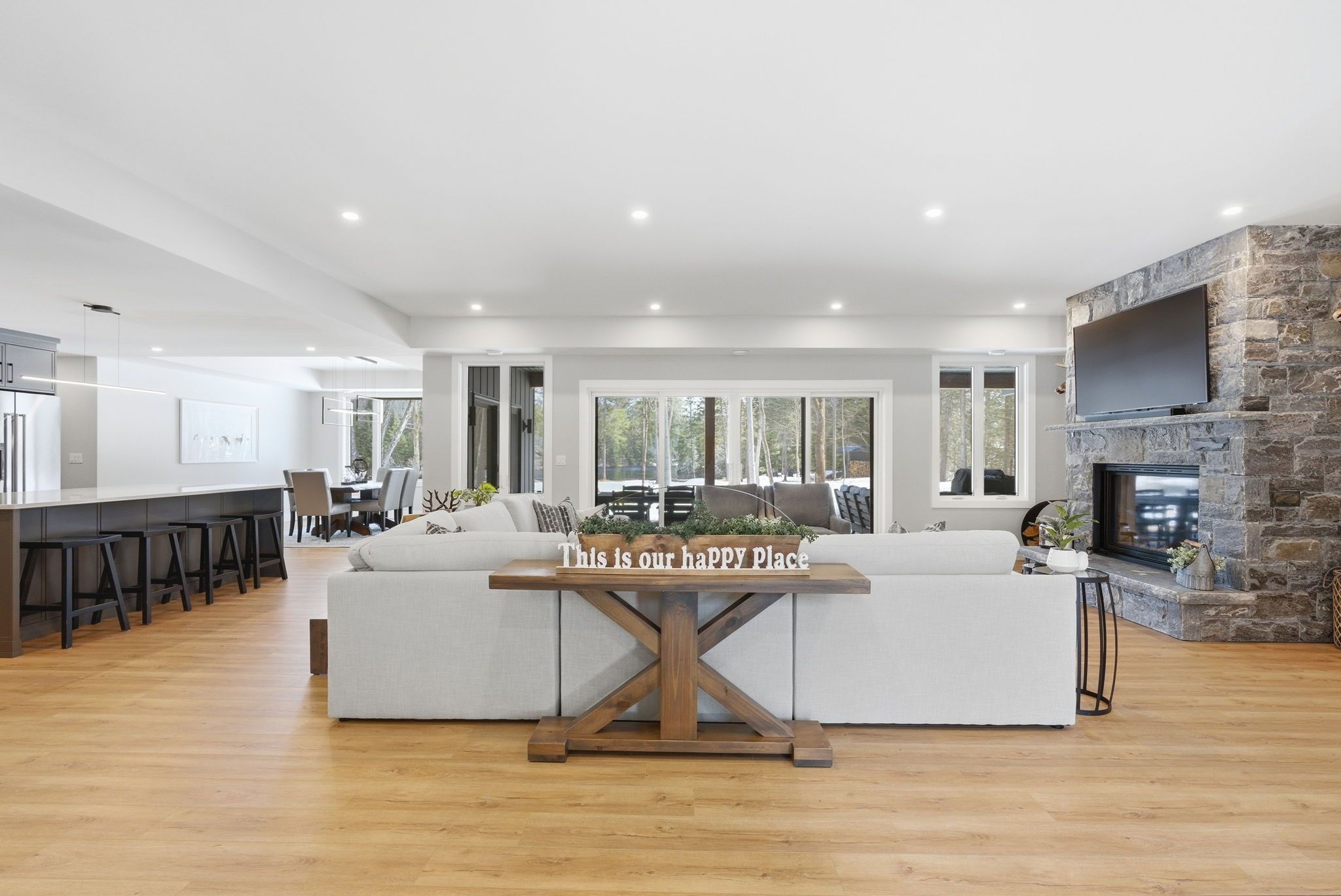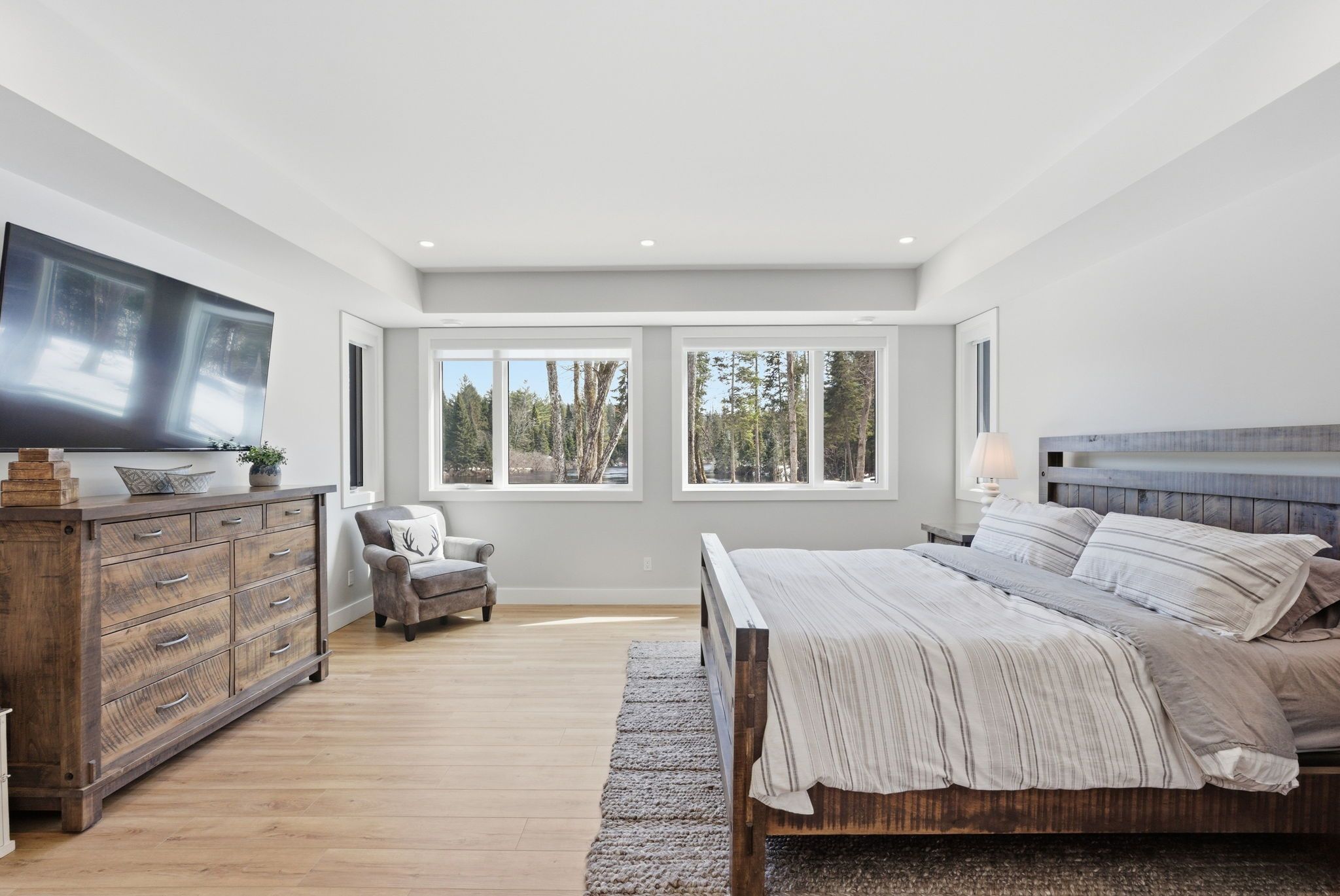 Set along a calm stretch of the north branch of the muskoka river, this newly built, single-level ranch style bungalow offers a functional layout, strong privacy, and a setting that's easy to enjoy year-round. Situated on one of the widest sections of the river along this stretch, between two sets of falls, there is plenty of space to enjoy the water safely, with the ability to boat locally and spend time at nearby balsam chutes. With gentle water flow, this section of the river is well-suited for both adults and kids to swim, making it ideal for family use. Built in 2025 and offering approximately 3,100 sq ft of living area, the home features 4 spacious bedrooms and 4 bathrooms. The layout is thoughtfully designed with the primary suite set on one side of the home with views of the water, and three additional bedrooms on the opposite side, providing separation and flexibility for families or guests. The main living area is bright and open, with a granite stone fireplace feature and a practical kitchen layout with a large island that includes ample cupboard and storage space, including a walk-in pantry. Radiant in-floor heating runs throughout the home, supported by propane forced air, central air conditioning, and on-demand hot water, and a generac backup generator for added peace of mind. Outdoor living has been well considered, with a dedicated entertaining area complete with propane bbq hookup, tv set up, and space to gather. The lot itself is predominantly level and well-treed, offering a high degree of privacy. A standout feature of this property is the two triple garages-a heated and air-conditioned attached garage with in-floor heat, plus a detached triple garage that is heated, insulated, and powered. A detached shed with power provides additional storage. Located on a municipally maintained year-round road between port sydney and bracebridge, this property is well suited for full-time living or a recreational retreat.