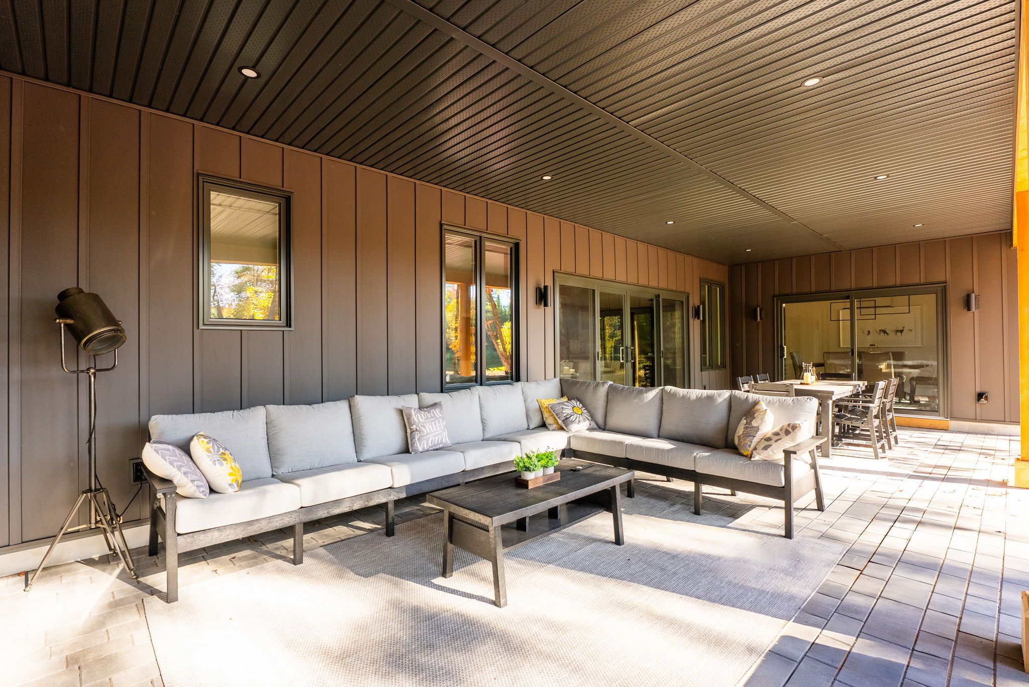 • Outdoor entertaining area with BBQ hookup and TV setup.