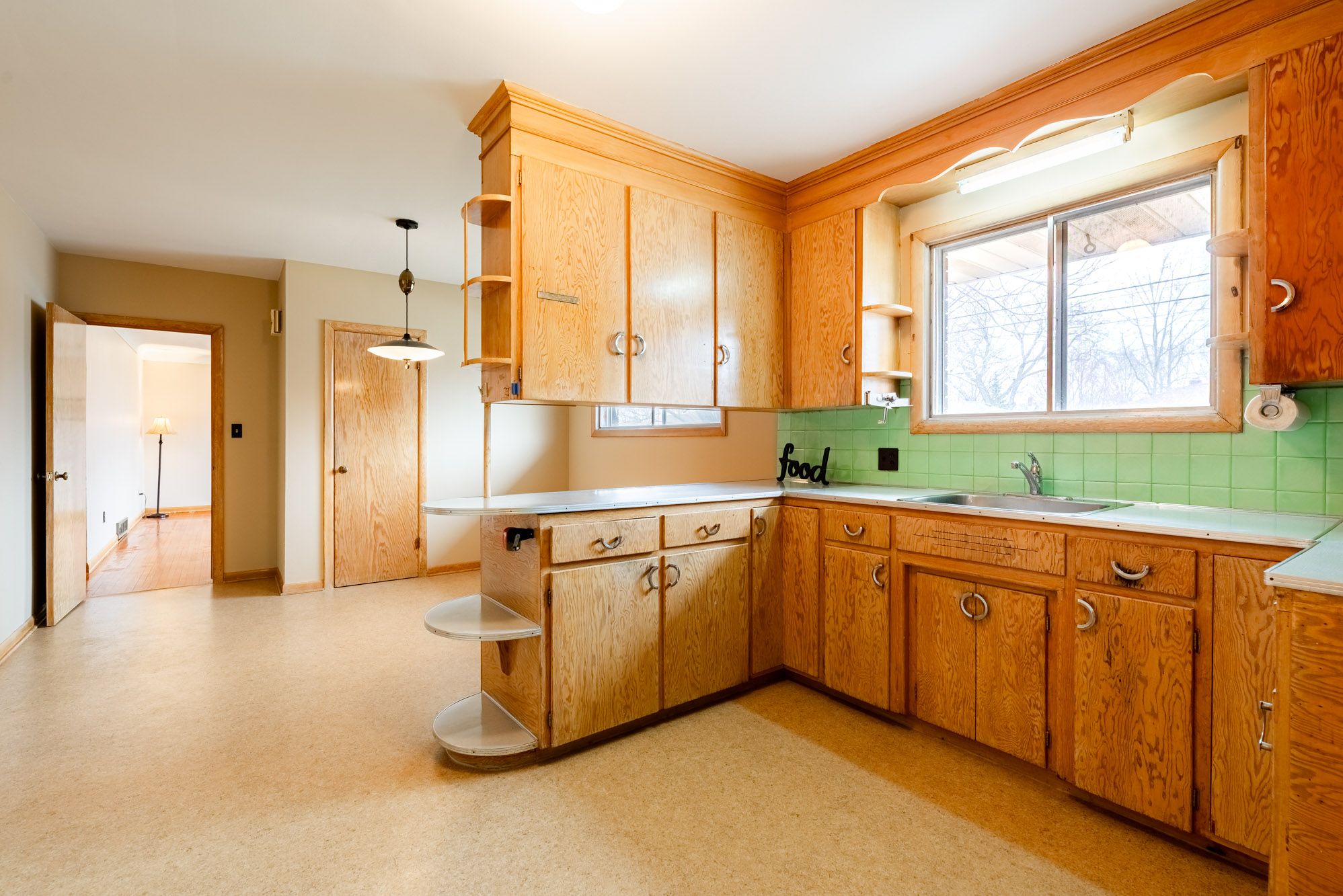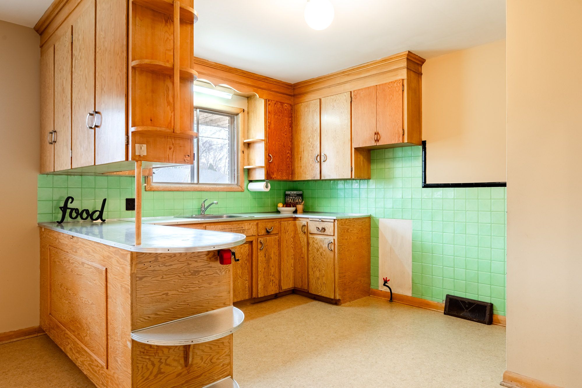• Original kitchen with vintage hardware and charming turquoise backsplash.