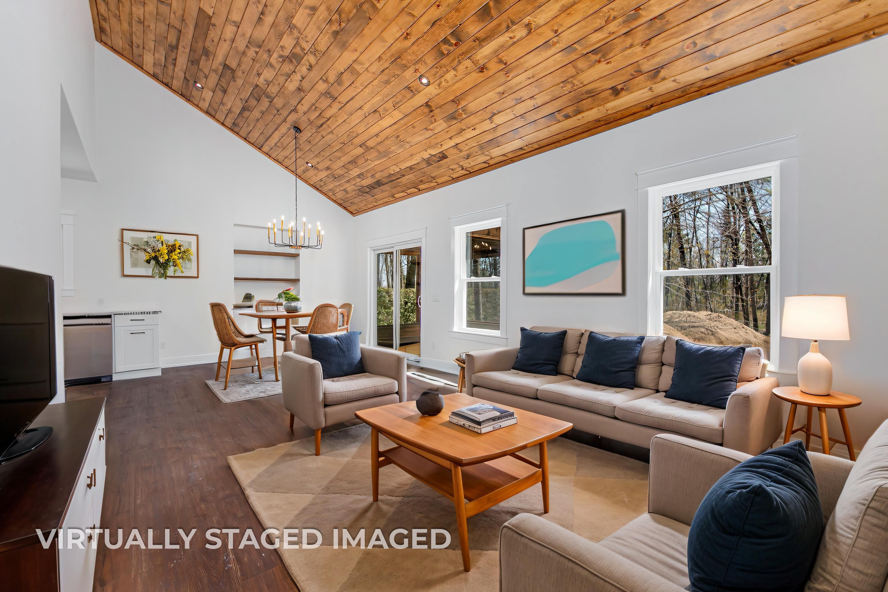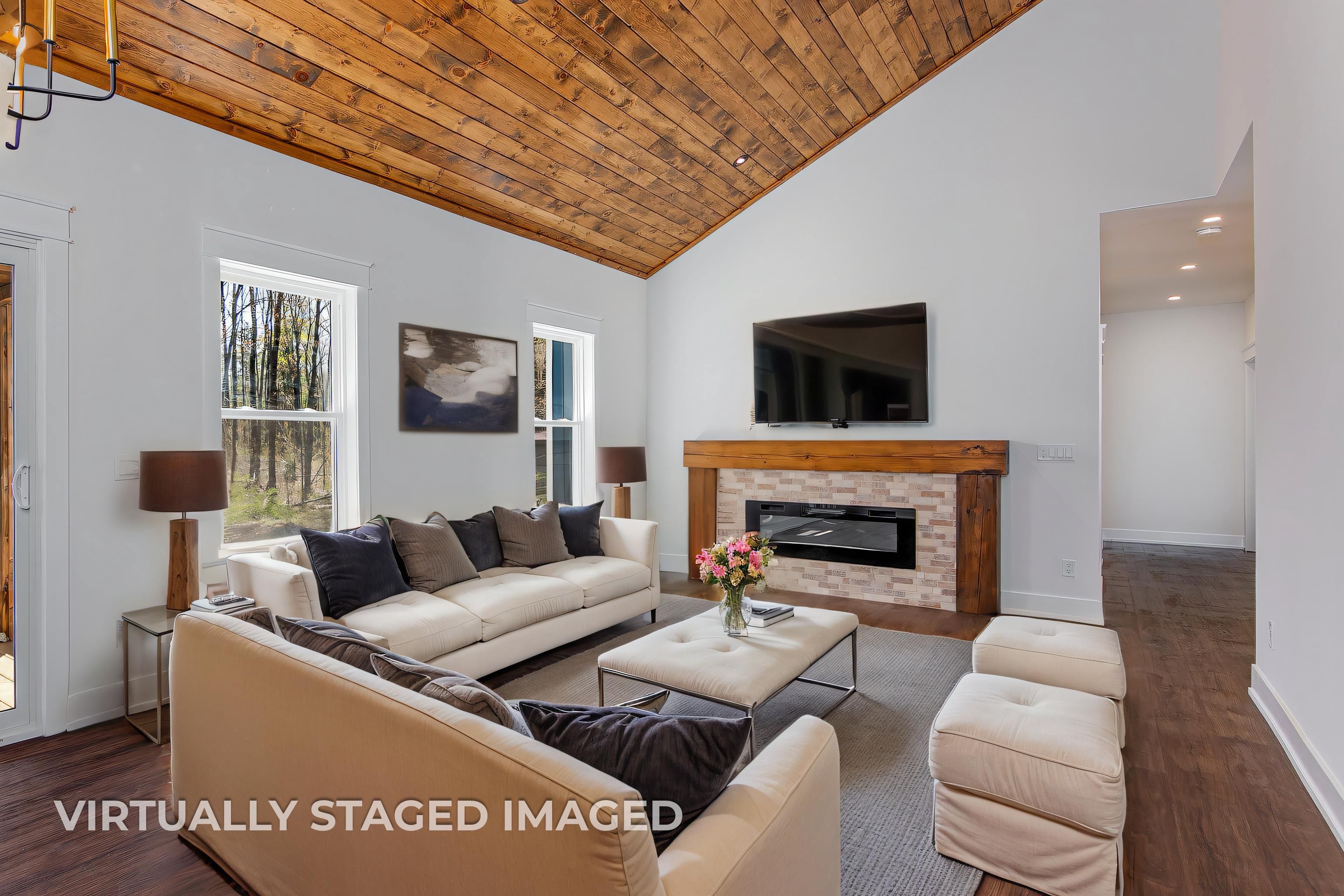 • Open concept living area featuring vaulted wood ceilings and fireplace.