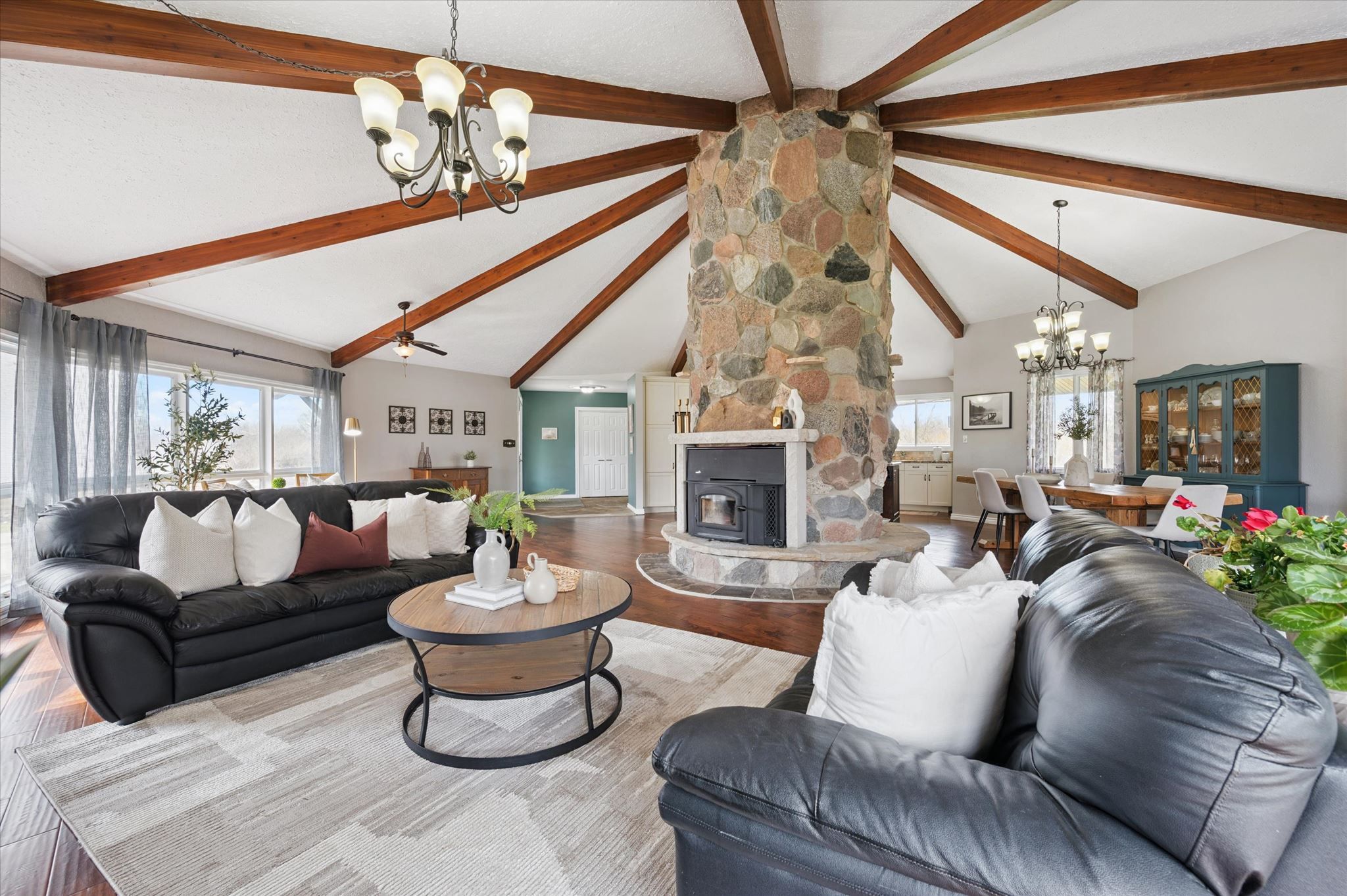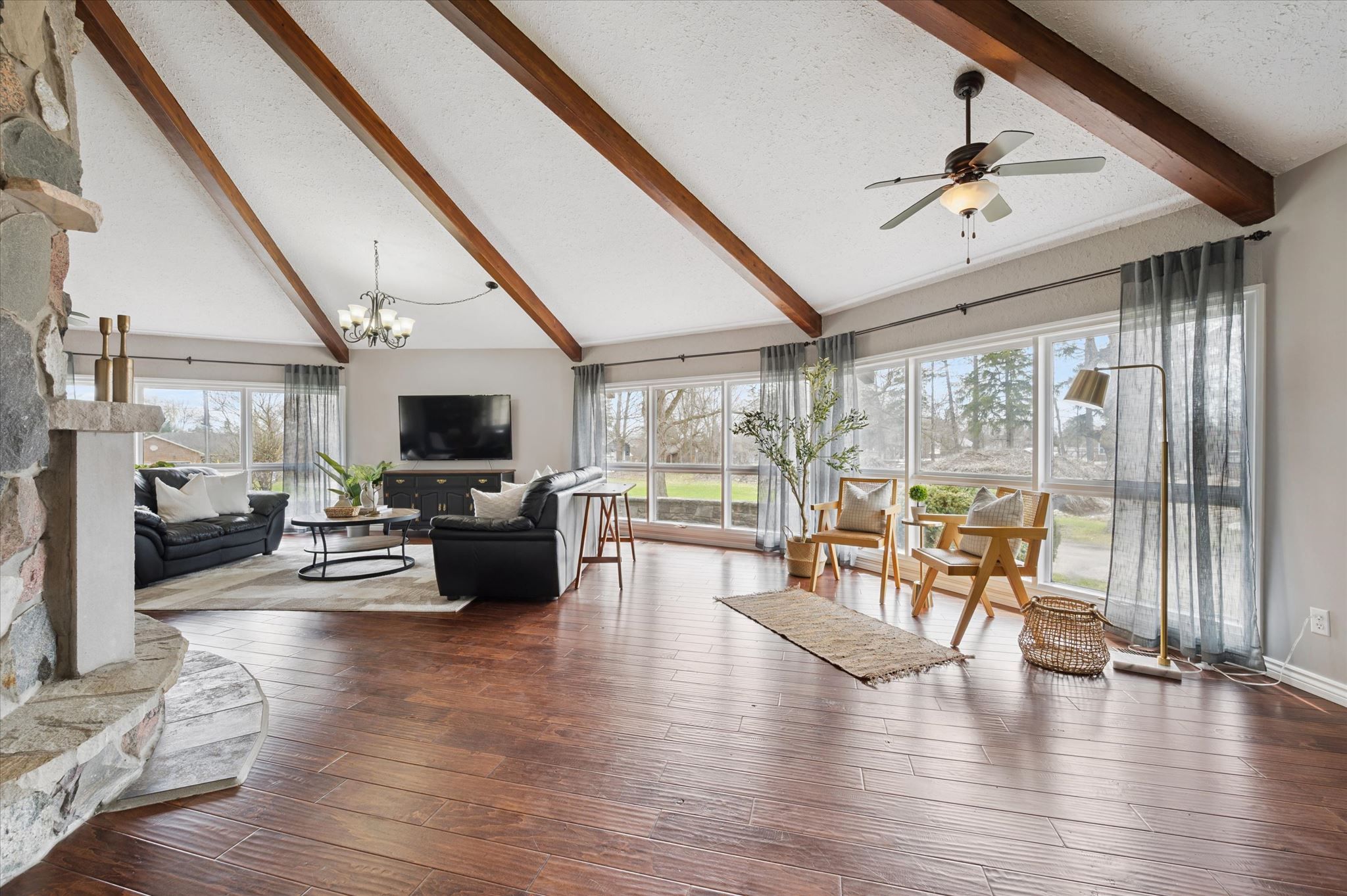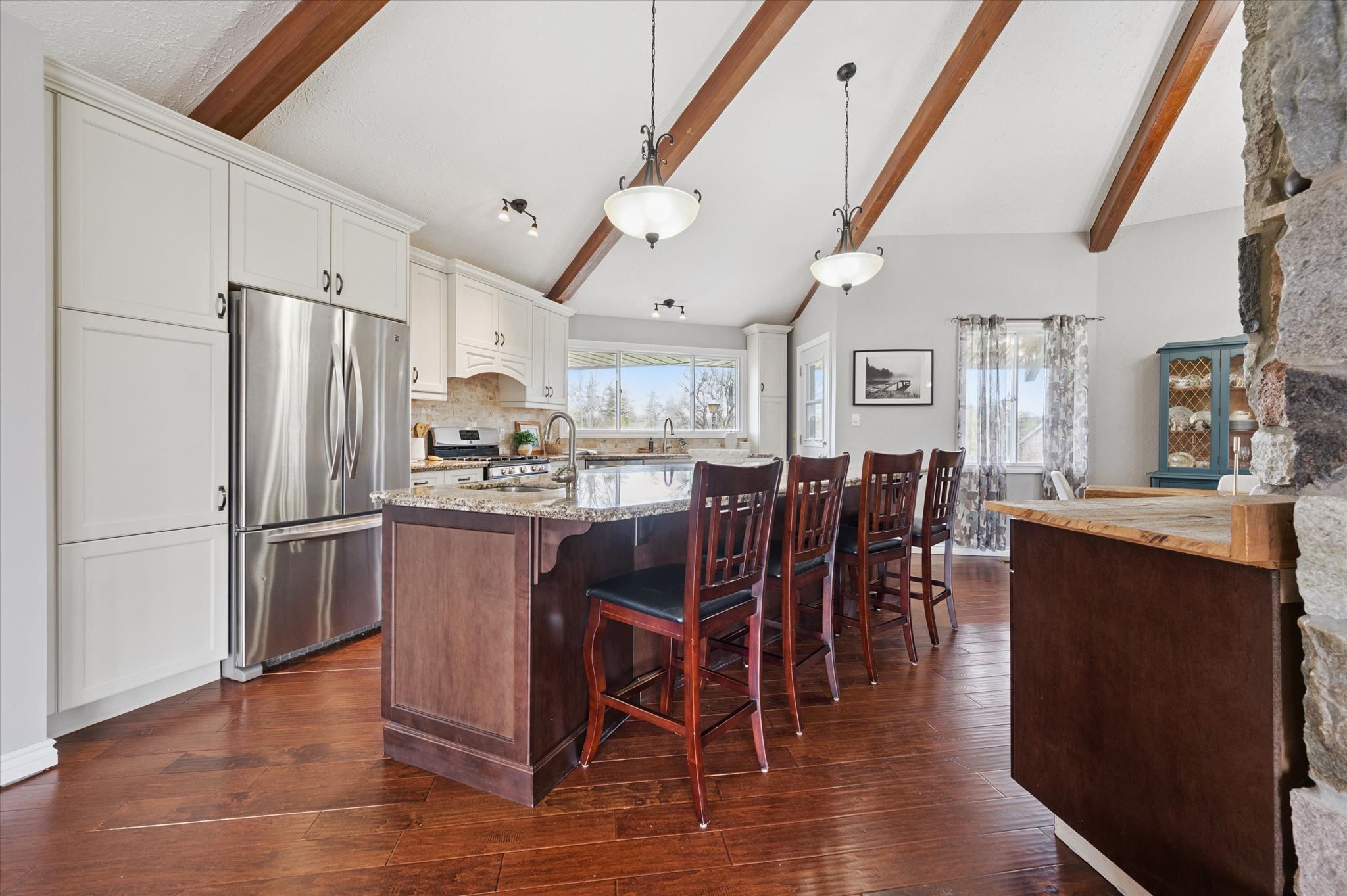 Mill pond views. Ski chalet soul. Two acres in aberfoyle - some homes have a feeling the moment you walk in. This one - with over 4300 finished square feet - has it. At the centre of the main living space, a striking floor-to-ceiling cylindrical fireplace anchors soaring vaulted ceilings with exposed beams - a space that feels just as right on a snowy february night as it does on a summer evening with the doors open. From the kitchen patio or the primary bedroom's private deck, the view is the same: mill pond, calm and uninterrupted. This is your everyday backdrop. With five bedrooms, four bathrooms, and a fully finished basement, there's room to truly live - whether hosting, working from home, or simply spreading out the way a two-acre property allows. The primary suite features a soaker tub and separate shower, while the lower level adds two more bedrooms, a full bath with a soaker tub and separate shower, and a spacious rec room with ample storage. Outside, the detached garage and shop deliver real utility - space for vehicles, equipment, and a proper workshop - with a loft above ready to be a studio, retreat, or additional storage. Enjoy peace of mind with updated big ticket items: furnace 2020, ac 2021, new well 2021, new septic 2021, tankless water heater 2021. Set near the end of a quiet dead-end street, you're moments from top-rated schools, south guelph amenities, and quick access to the 401. Country living, without compromise.
