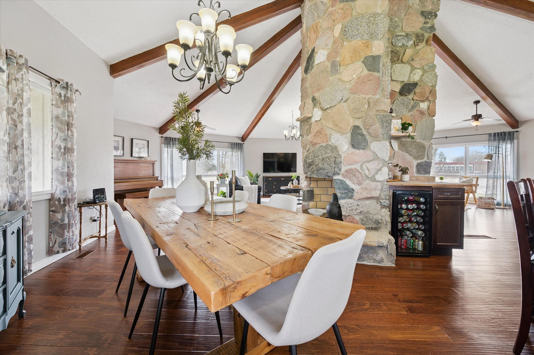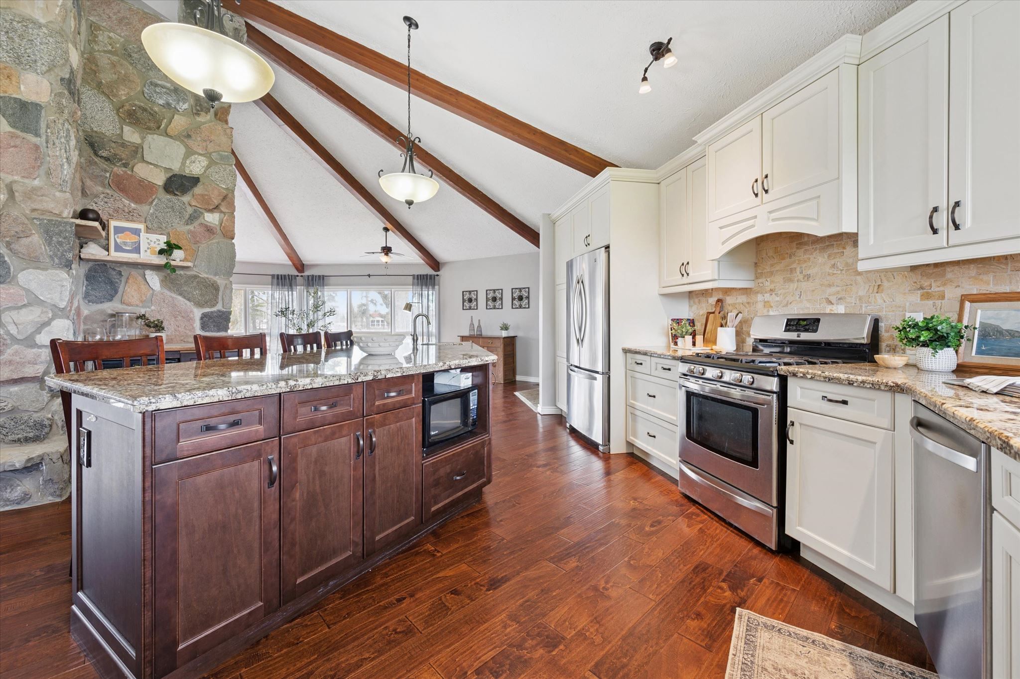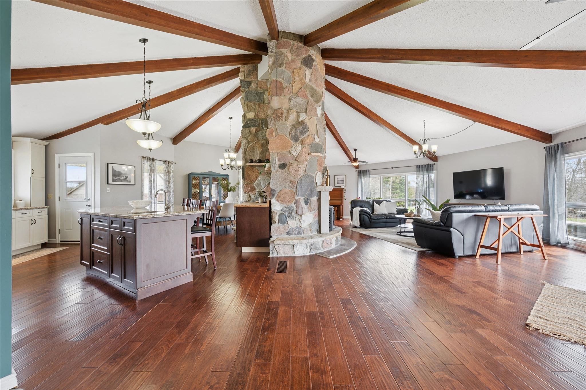 Mill pond views. Ski chalet soul. Two acres in aberfoyle - some homes have a feeling the moment you walk in. This one - with over 4300 finished square feet - has it. At the centre of the main living space, a striking floor-to-ceiling cylindrical fireplace anchors soaring vaulted ceilings with exposed beams - a space that feels just as right on a snowy february night as it does on a summer evening with the doors open. From the kitchen patio or the primary bedroom's private deck, the view is the same: mill pond, calm and uninterrupted. This is your everyday backdrop. With five bedrooms, four bathrooms, and a fully finished basement, there's room to truly live - whether hosting, working from home, or simply spreading out the way a two-acre property allows. The primary suite features a soaker tub and separate shower, while the lower level adds two more bedrooms, a full bath with a soaker tub and separate shower, and a spacious rec room with ample storage. Outside, the detached garage and shop deliver real utility - space for vehicles, equipment, and a proper workshop - with a loft above ready to be a studio, retreat, or additional storage. Enjoy peace of mind with updated big ticket items: furnace 2020, ac 2021, new well 2021, new septic 2021, tankless water heater 2021. Set near the end of a quiet dead-end street, you're moments from top-rated schools, south guelph amenities, and quick access to the 401. Country living, without compromise.