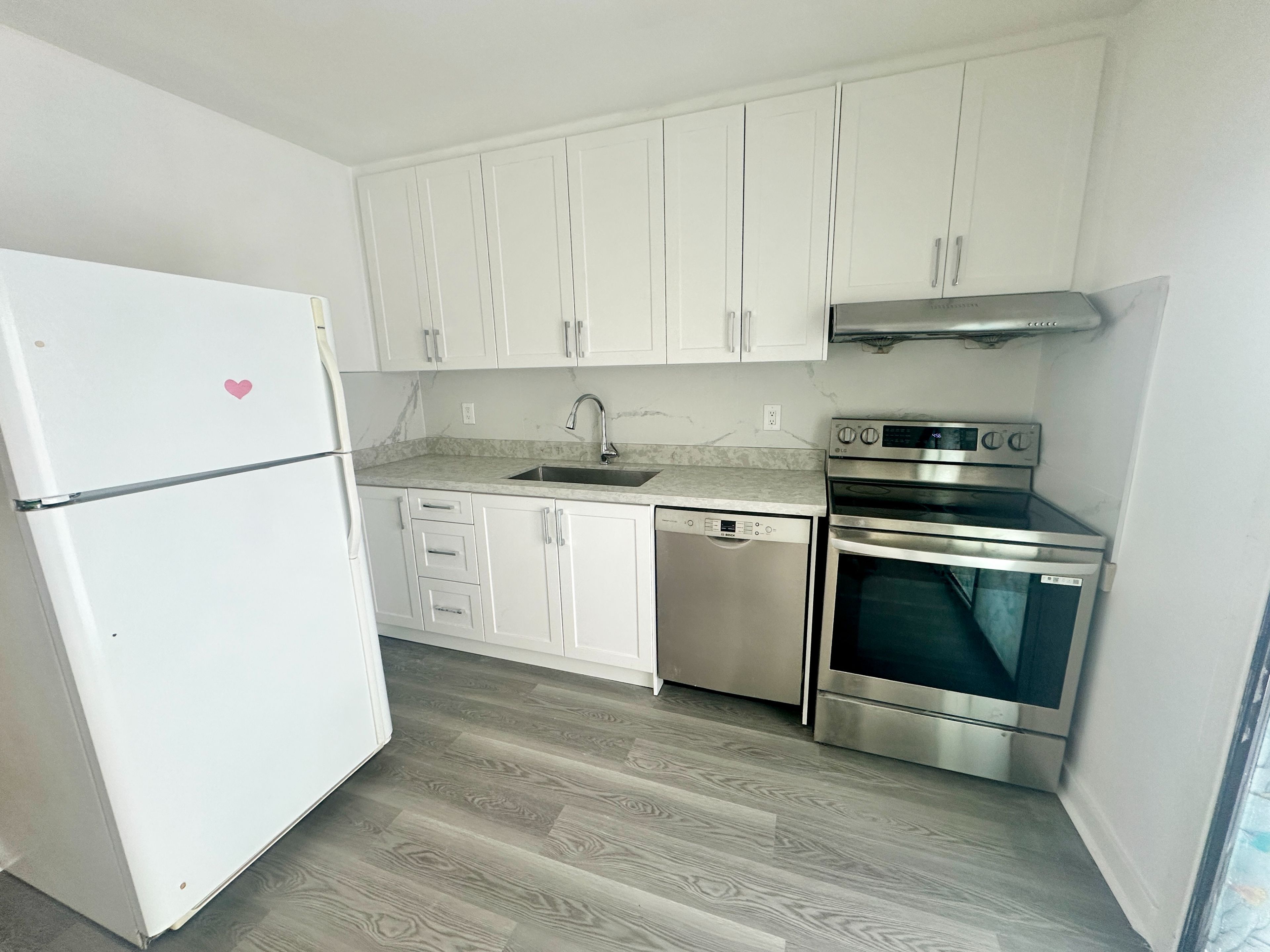 • Modern kitchen featuring brand-new cabinetry and elegant quartz countertops.