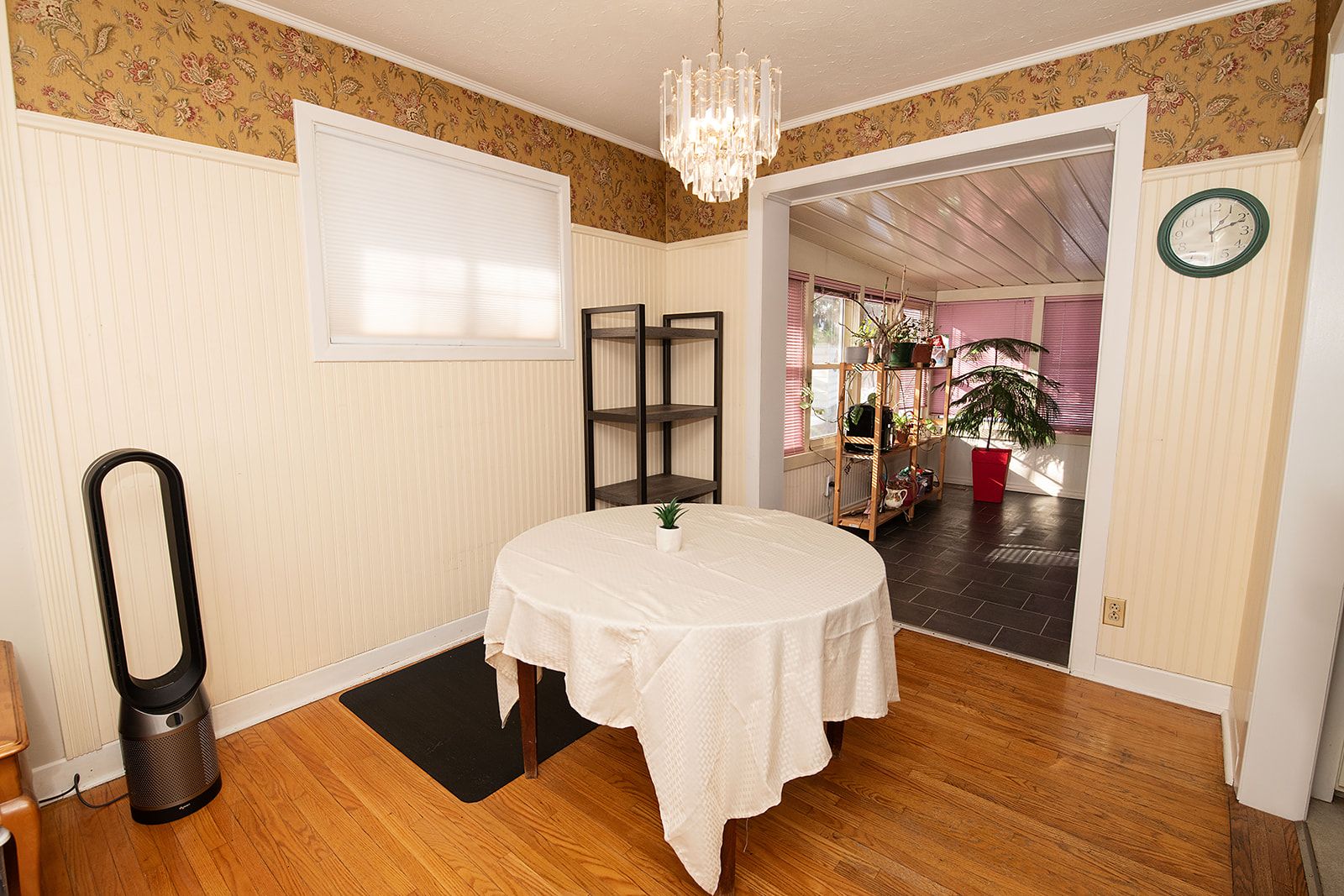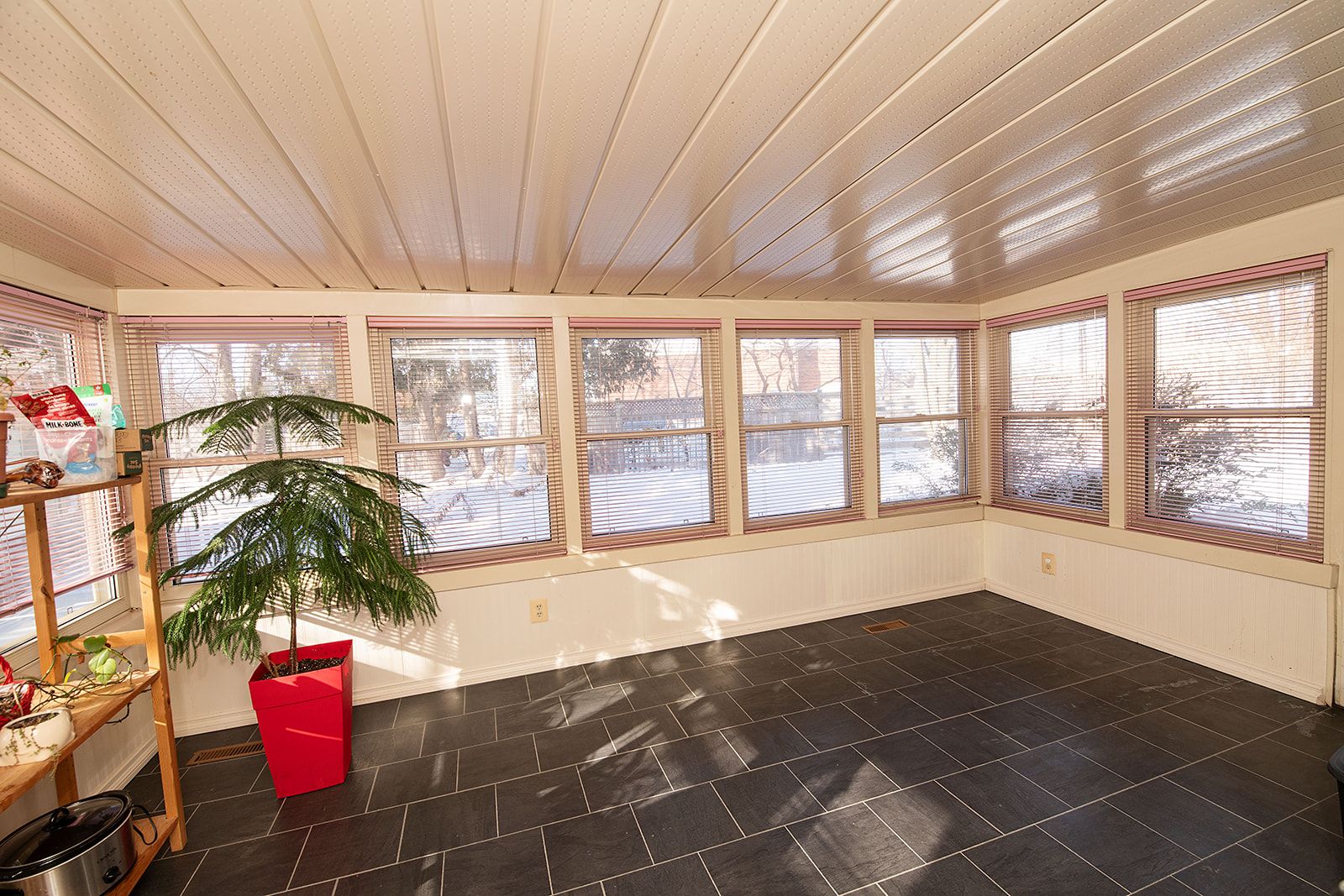 • Four-season sunroom with views of a large pie-shaped backyard.