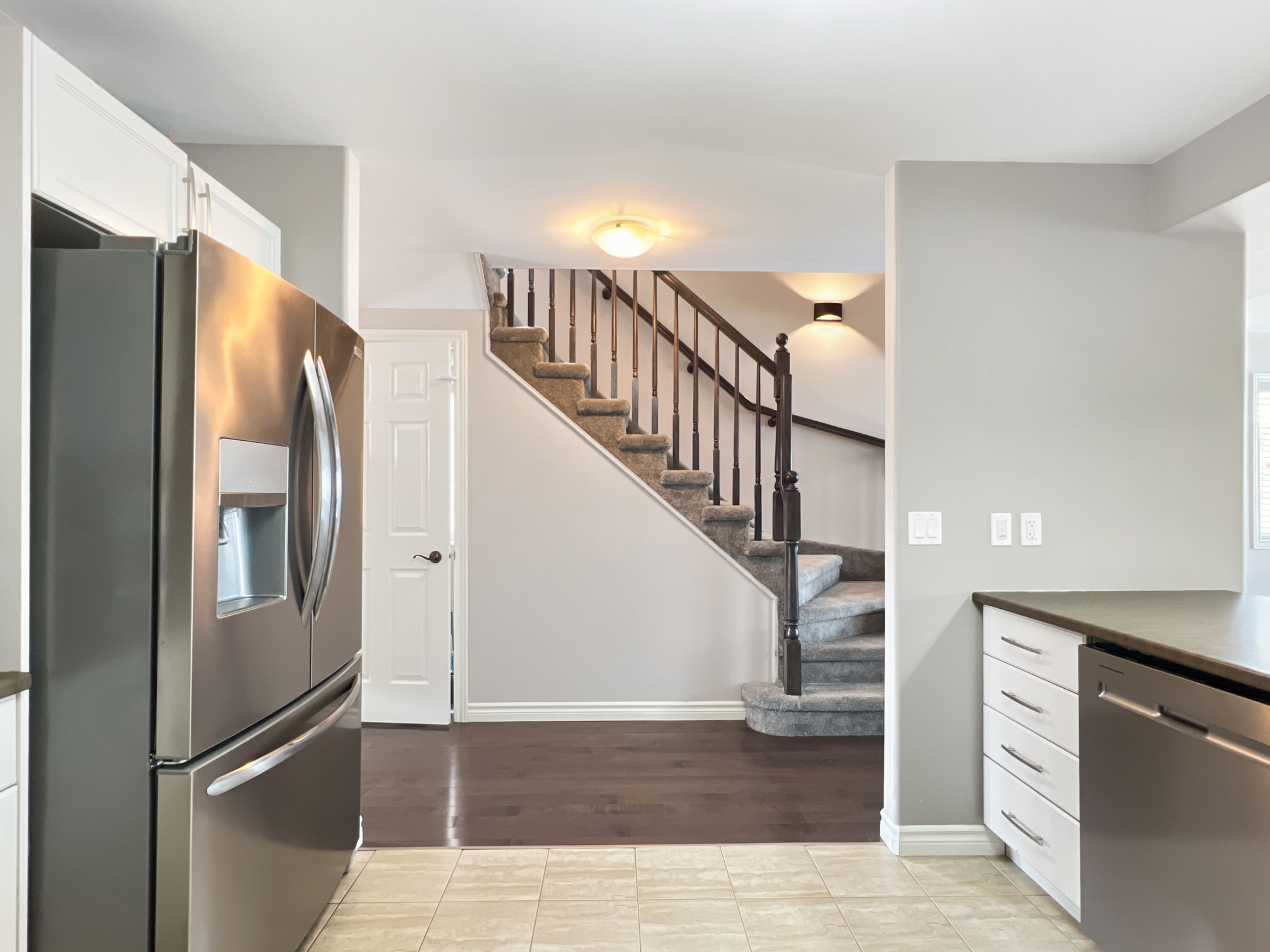 Welcome to this well maintained end unit townhouse offering the perfect blend of comfort and convenience. With 3 bedrooms and 2. 5 bathrooms, this home is ideal for families, professionals, or anyone looking for low maintenance living without compromise. The main floor features a functional layout with a bright dining area and direct access to a fully fenced backyard, perfect for relaxing or entertaining. The kitchen is equipped with stainless steel appliances, a pantry for added storage, and a gas/electric combination range that serious home cooks will appreciate. Upstairs, you will find three spacious bedrooms, including a large primary suite complete with a walk in closet and a private four piece ensuite. Second floor laundry adds every day convenience, while newer carpet on the stairs provides a fresh, updated feel. Additional highlights include an attached garage with inside entry, a partially finished basement offering extra living space, and a roof shingled in 2022 for peace of mind. Located close to shopping, the 401, parks, golf courses, and the hospital, this home checks all the boxes for location and lifestyle. Move in ready and easy to maintain, this is one you will not want to miss.