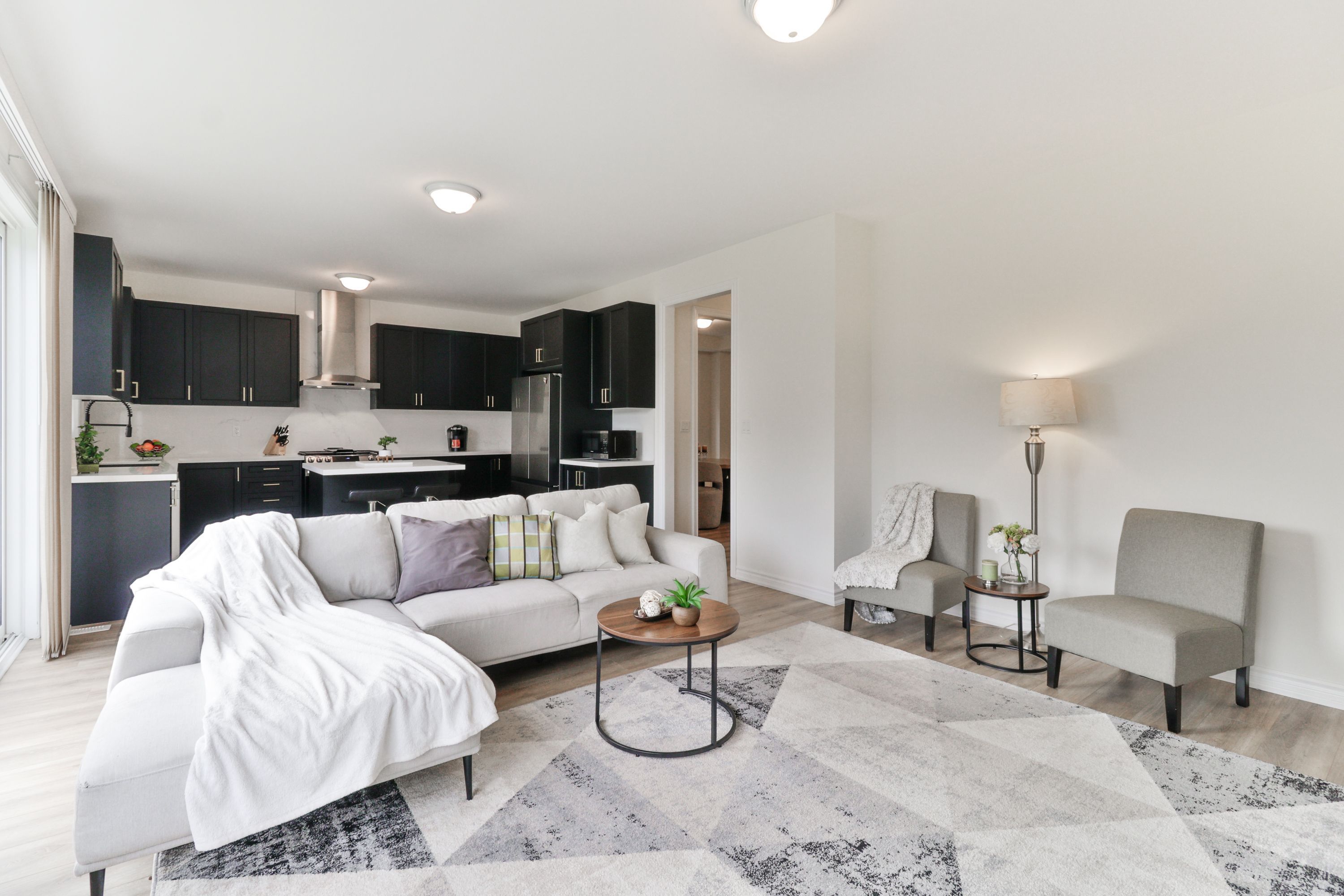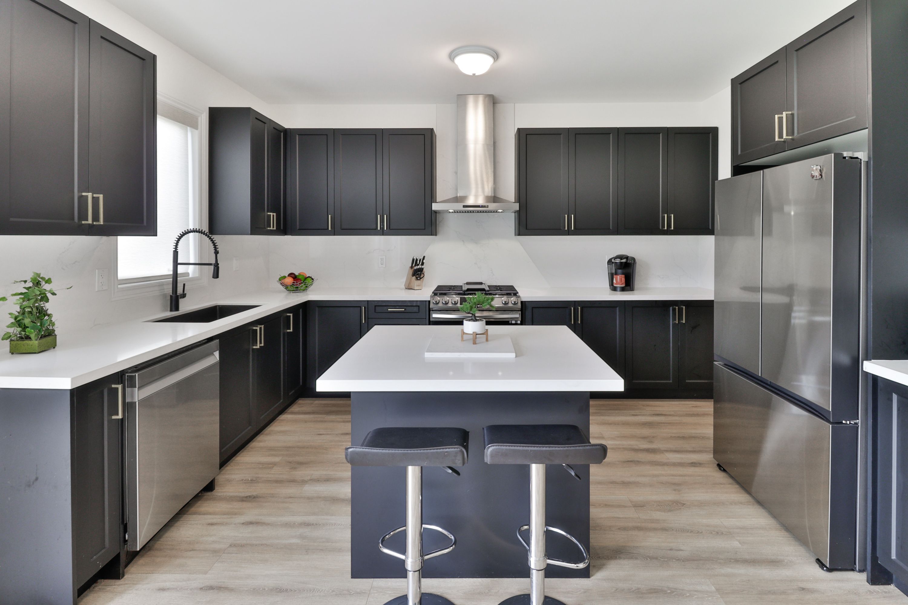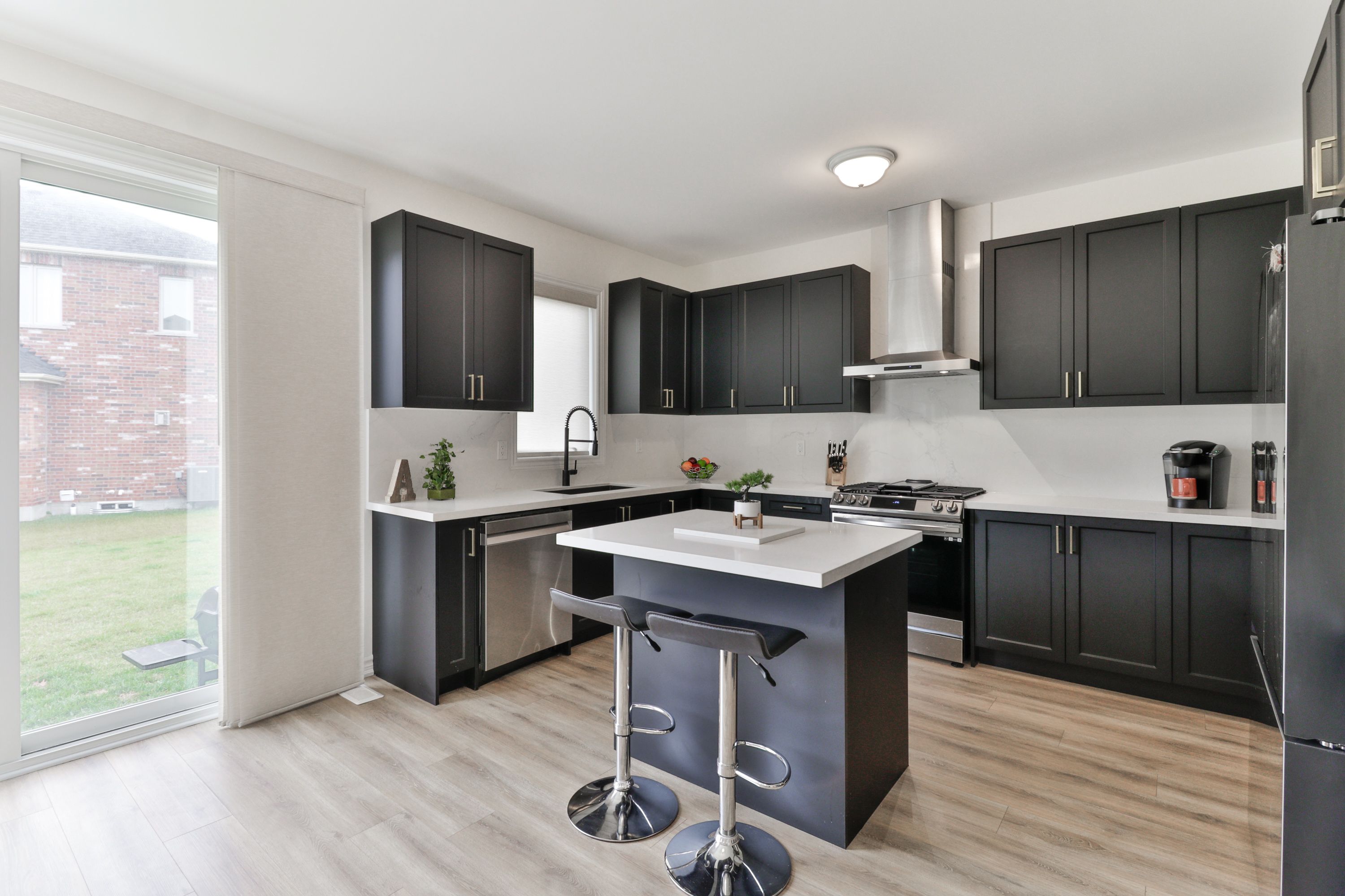 • Chef's kitchen features upgraded cabinetry, quartz countertops, and stainless steel appliances.