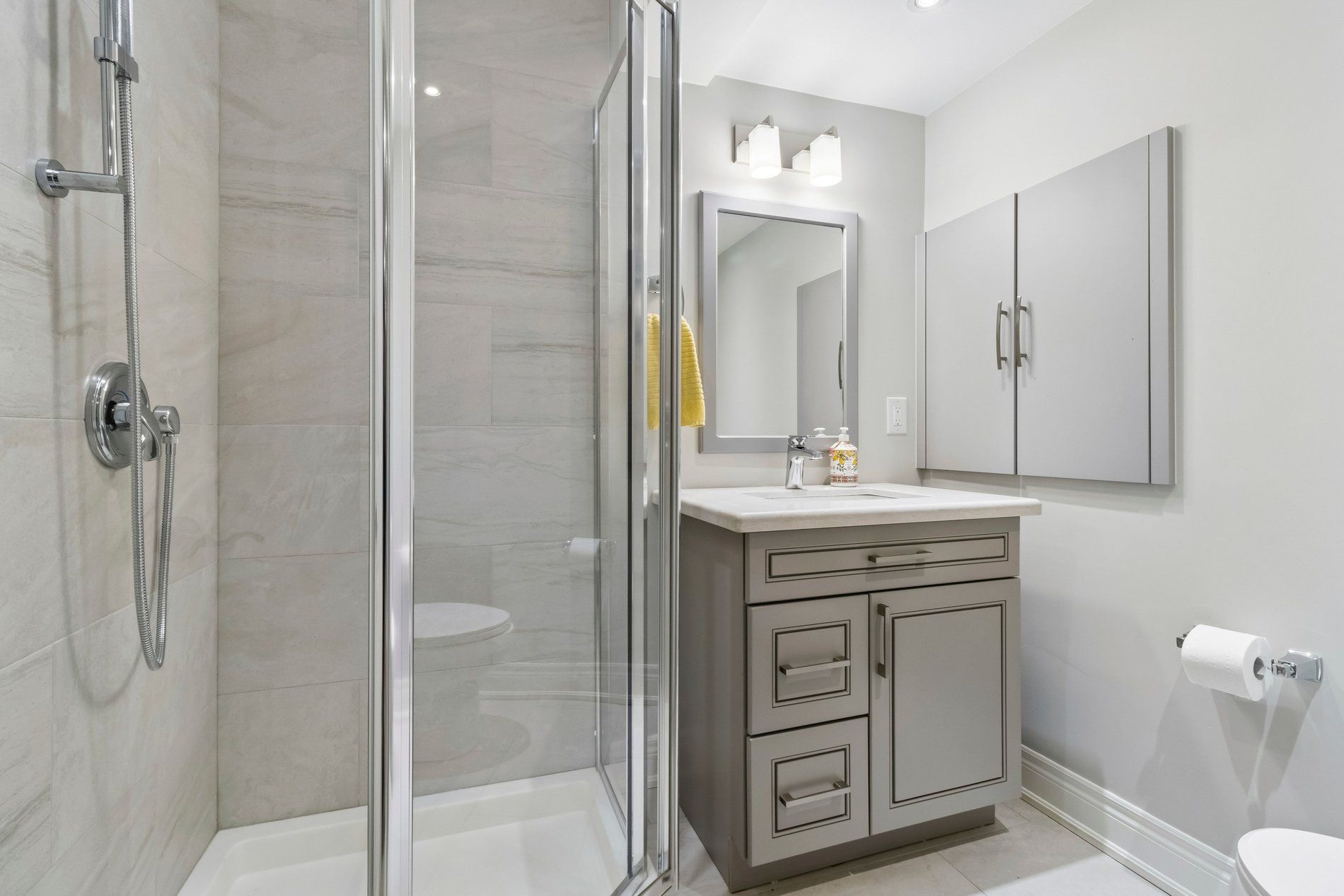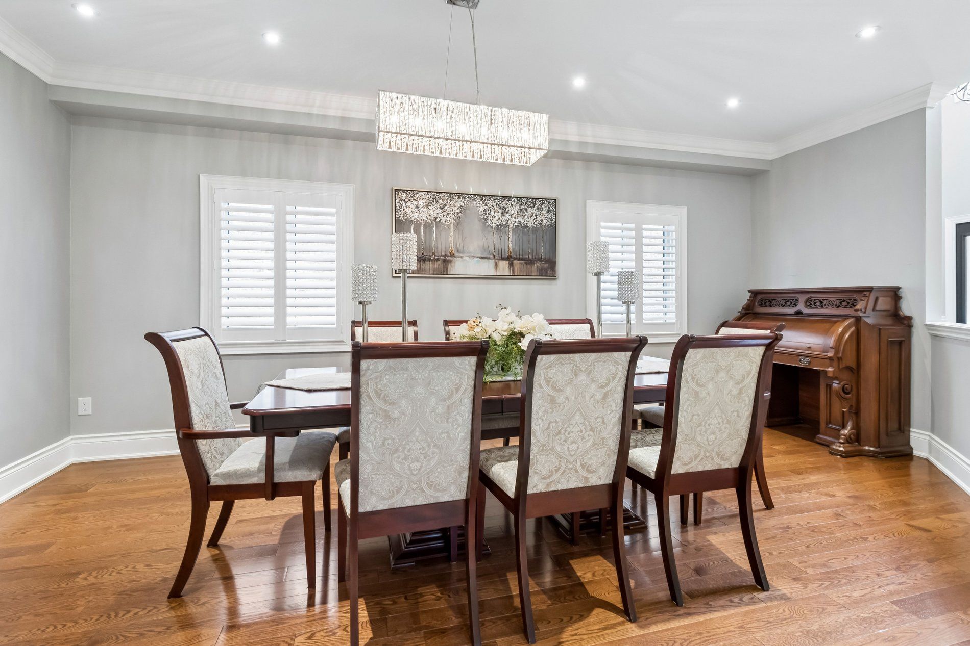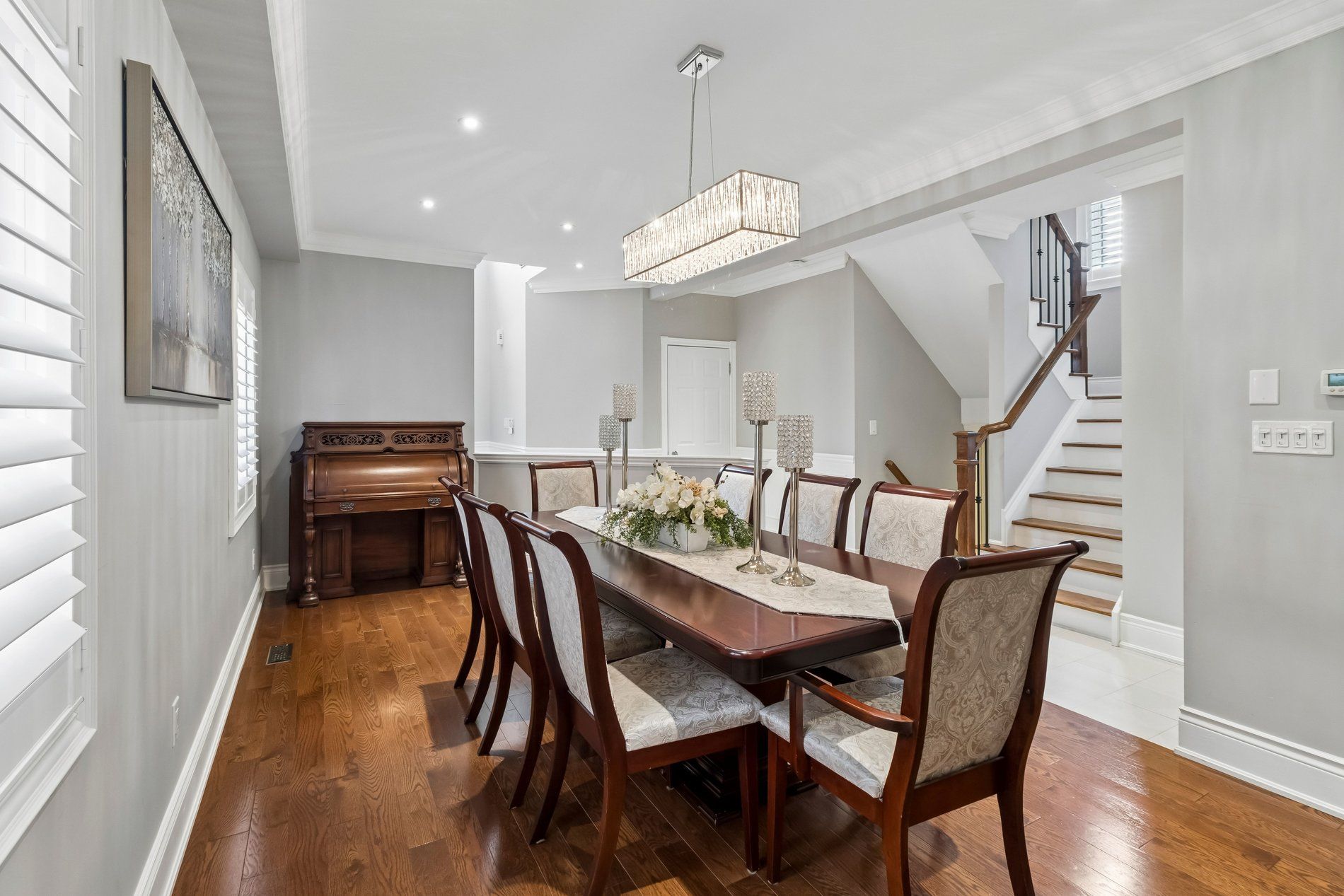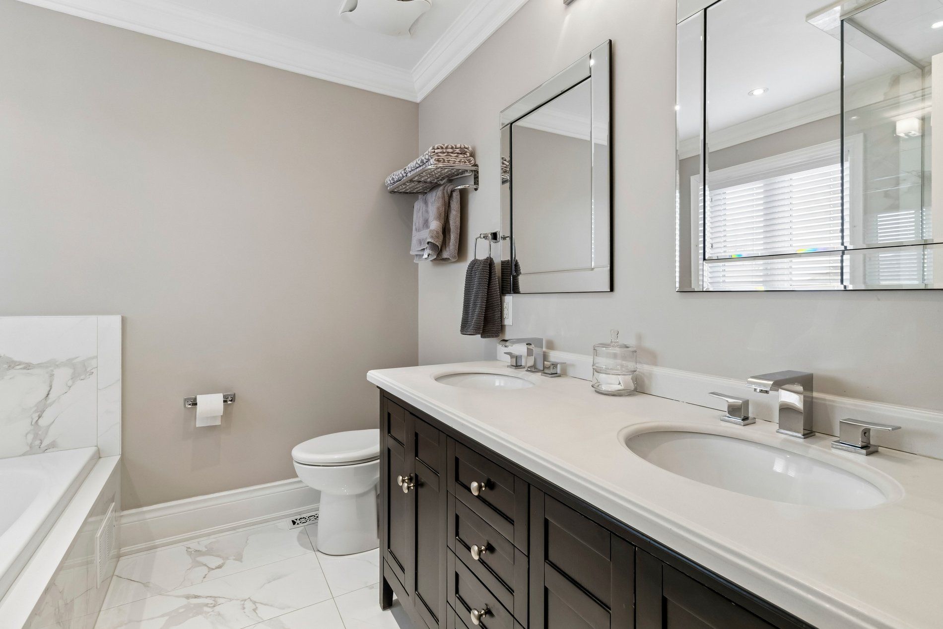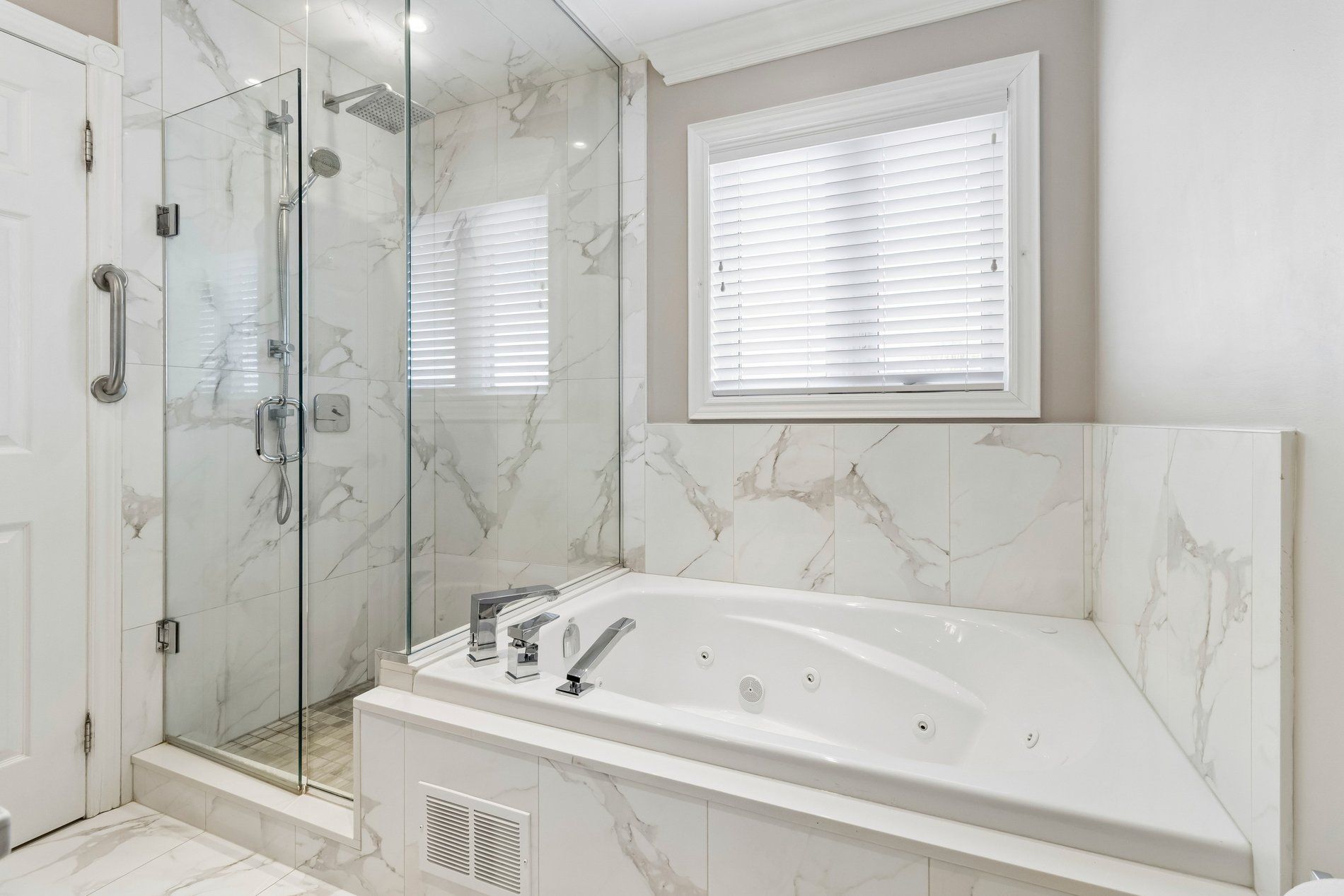 • Elegant porcelain tile and hardwood flooring for style and durability.