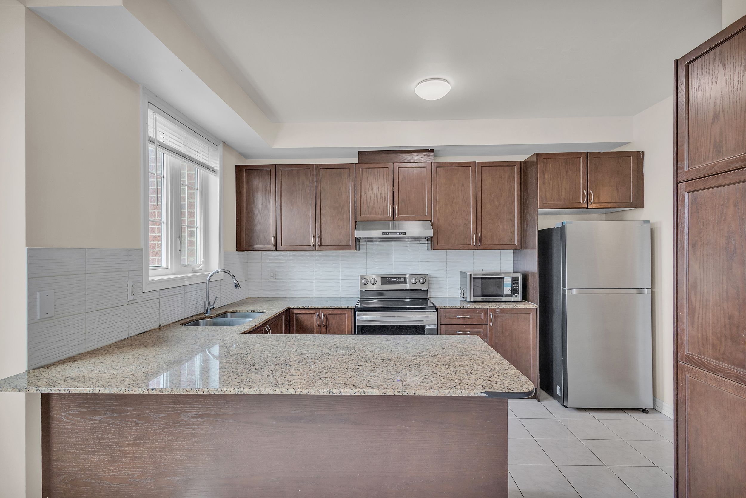 • Well-equipped kitchen with granite countertops and stylish backsplash.