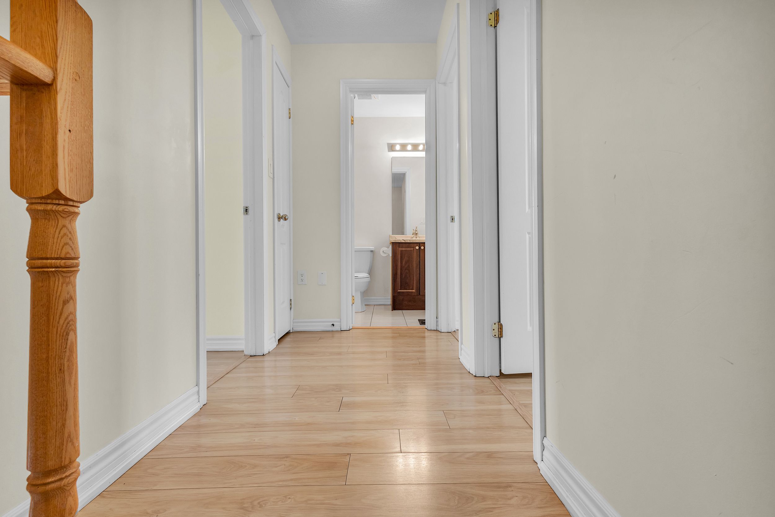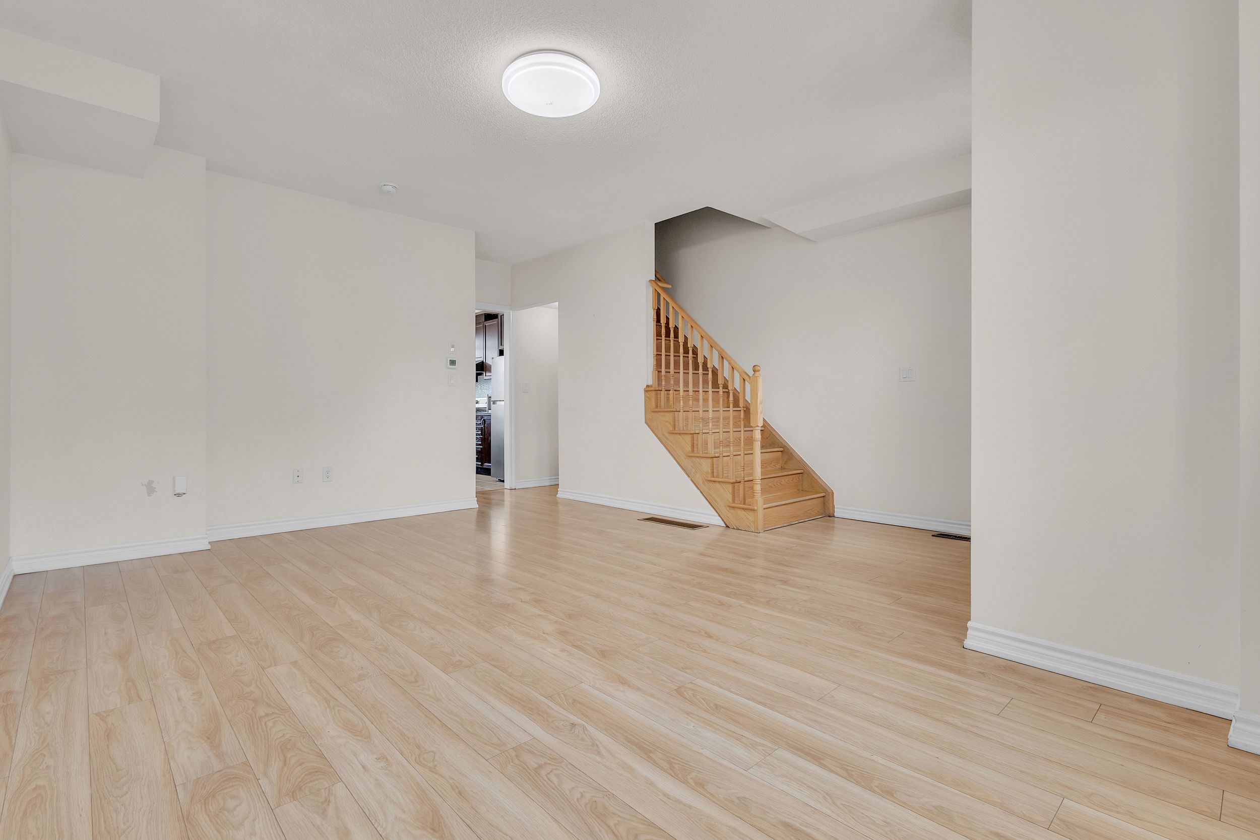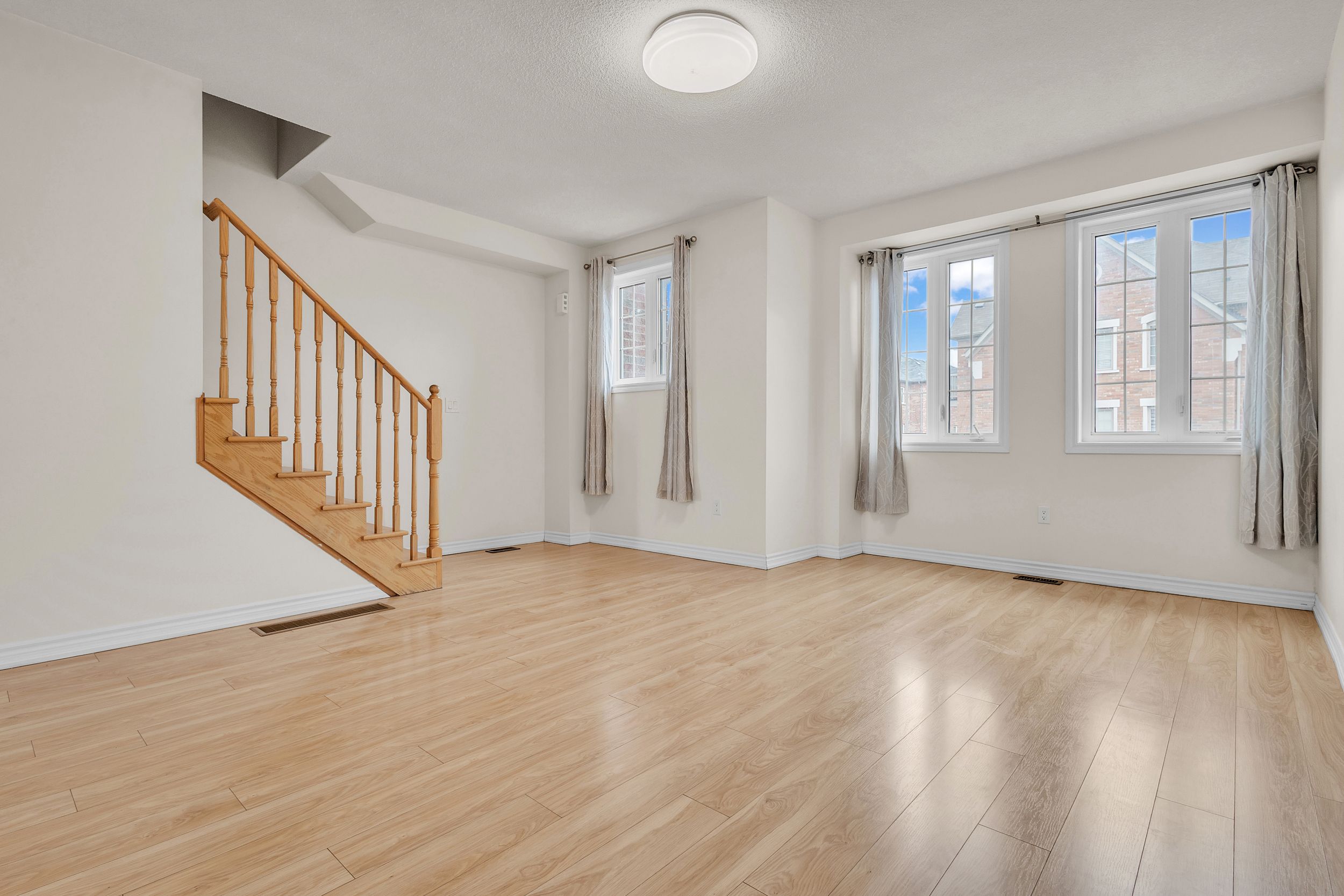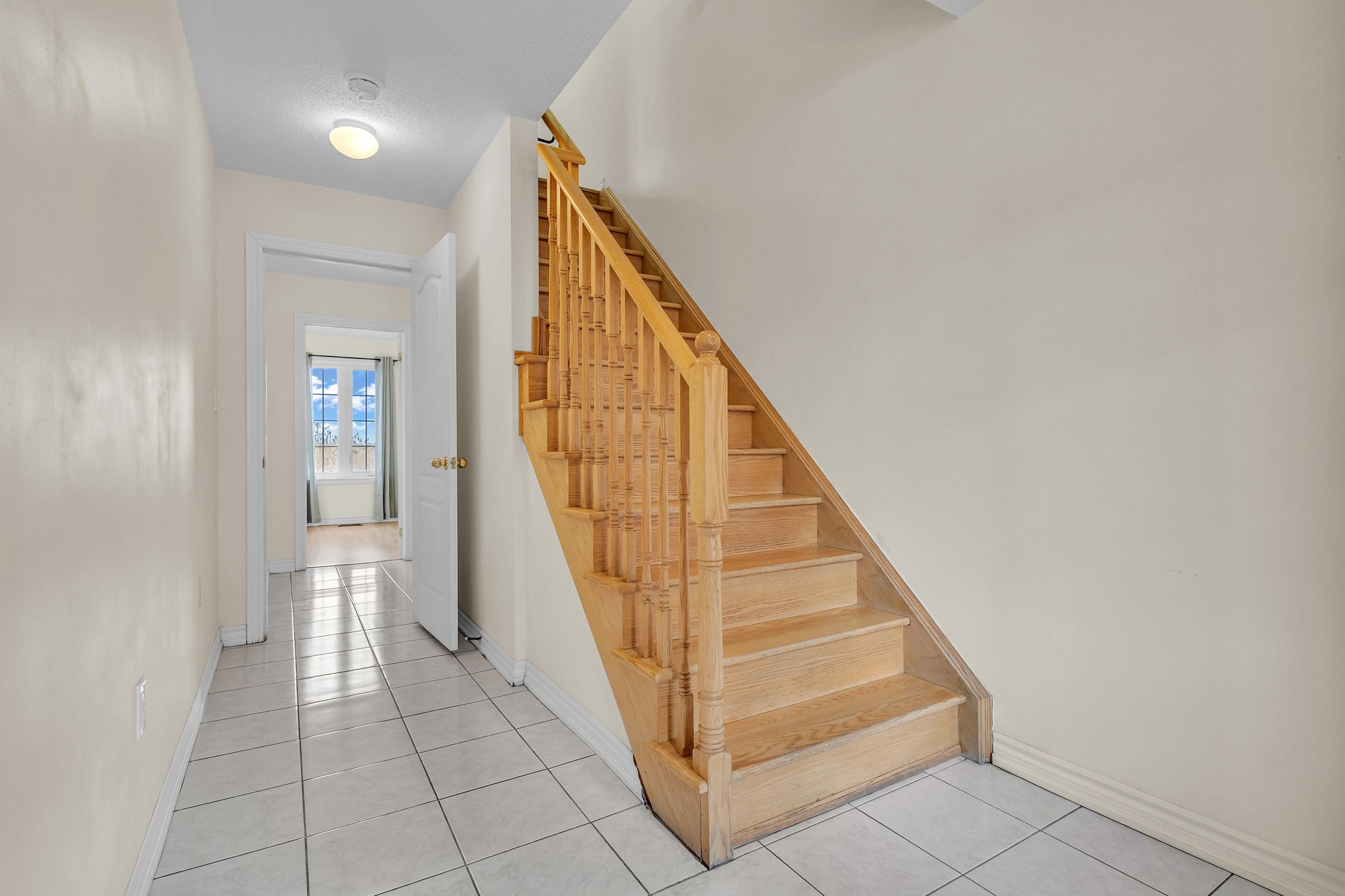• Modern interior with no carpet, featuring elegant oak wood stairs.