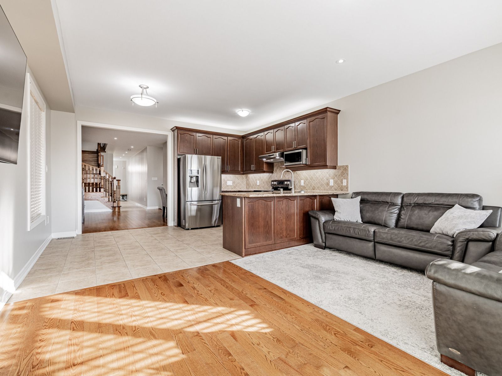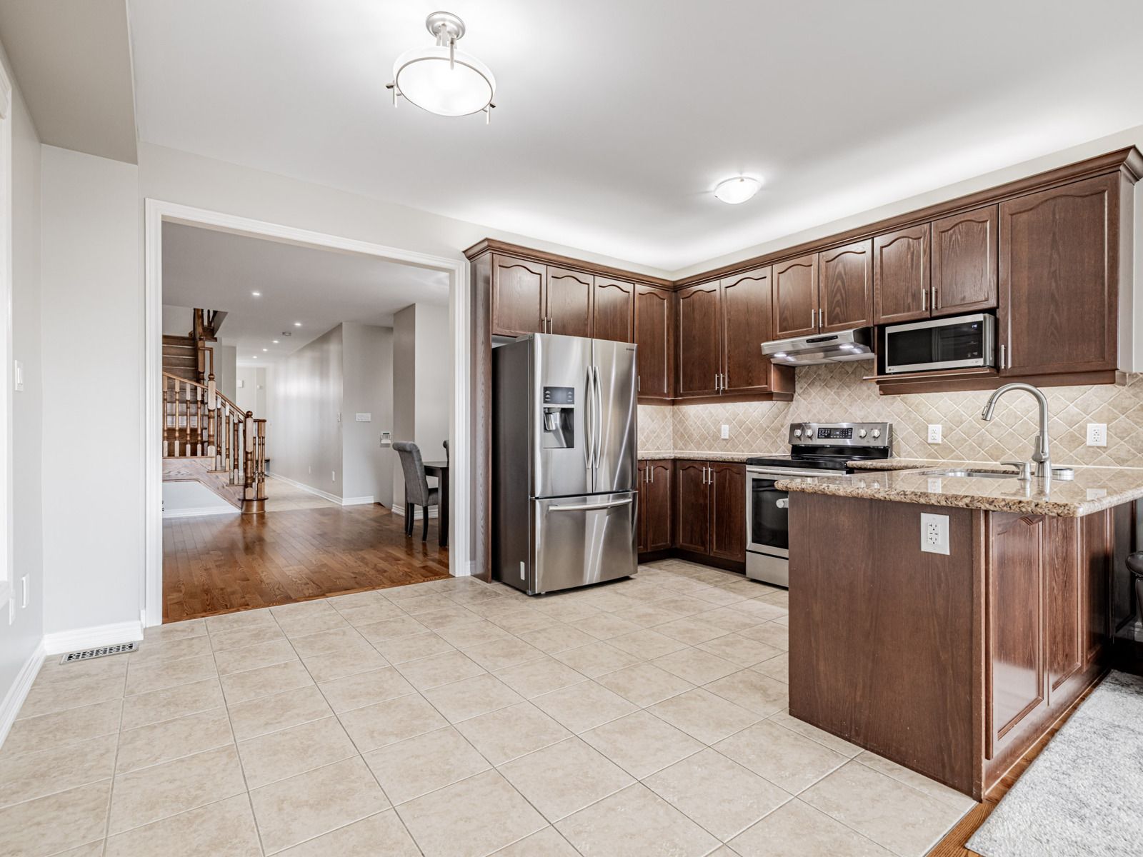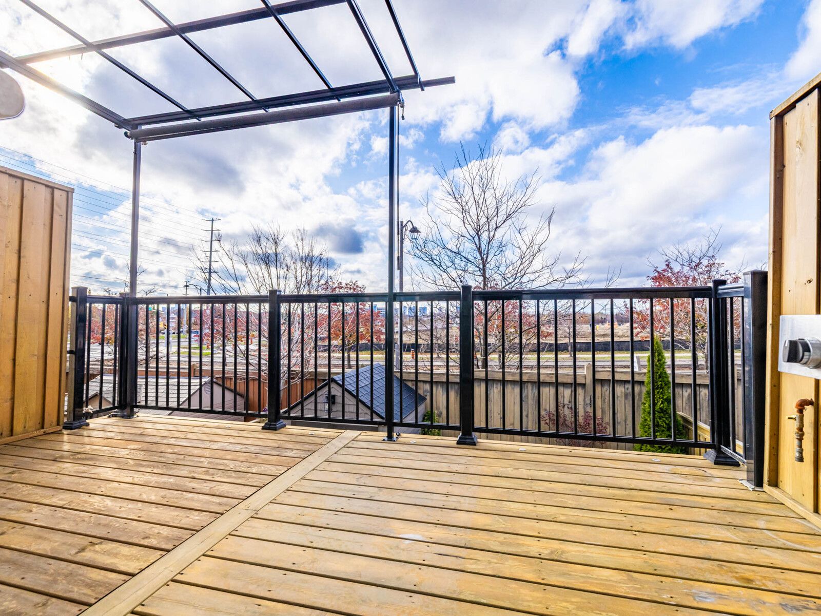 Welcome to your future executive home - first time on the market! Built by remington in 2012and meticulously maintained by its original owner, this stunning 4-bedroom, 4-bathroomexecutive end-unit freehold town home sits on a premium oversized lot and is attached only at the garage, offering the feel of a detached home. With 3,000+ sq. Ft. Of total luxury living space (2,049 sq. Ft. Above grade), this home is truly move-in ready. Step inside to a bright, open-concept layout featuring 9-ft smooth ceilings, 3-inch vintage oak flooring, fresh paint throughout, and an elegant oak staircase with upgraded pickets and handrail. The gourmet kitchen boasts granite countertops, stainless steel appliances, an eat-in breakfast area, and a walk-out to the deck through a 2025 upgraded sliding door with venetian inserts. The professionally finished basement offers a spacious walk-out design with 7-inch vinyl flooring, fresh paint, a napoleon fireplace, and a stunning stone accent wall. Additional upgrades include a navien energy-star tankless owned hwt (2020), a complete water softener and filtration system (2017), and custom laundry cabinetry with sink. The second floor is completely carpet-free, featuring vintage oak flooring, upgraded baseboards and trim, and custom organized closet systems in all bedrooms. The main bathroom and the luxurious ensuite were both renovated in 2025, showcasing premium fixtures and finishes. The primary bedroom also includes an electric fireplace and a beautifully organized walk-in closet with pot lights. The exterior offers a serene setting on a quiet street, complete with an extended driveway,garage wall storage system, and a charming flagstone walkway leading to the backyard. This end-unit gem combines luxury, style, and comfort - truly a rare find. Move-in ready and waiting for you! See attached featured sheet