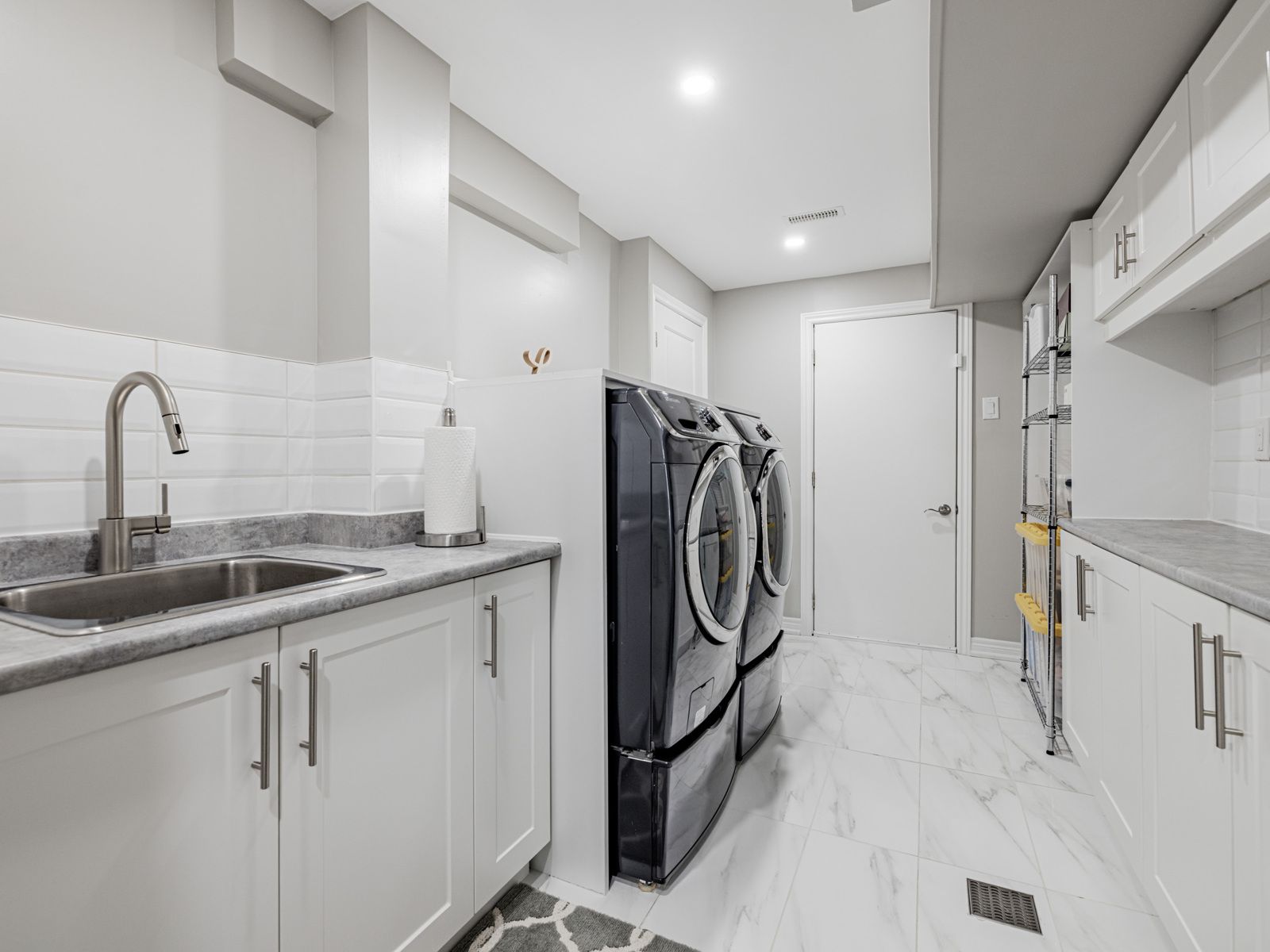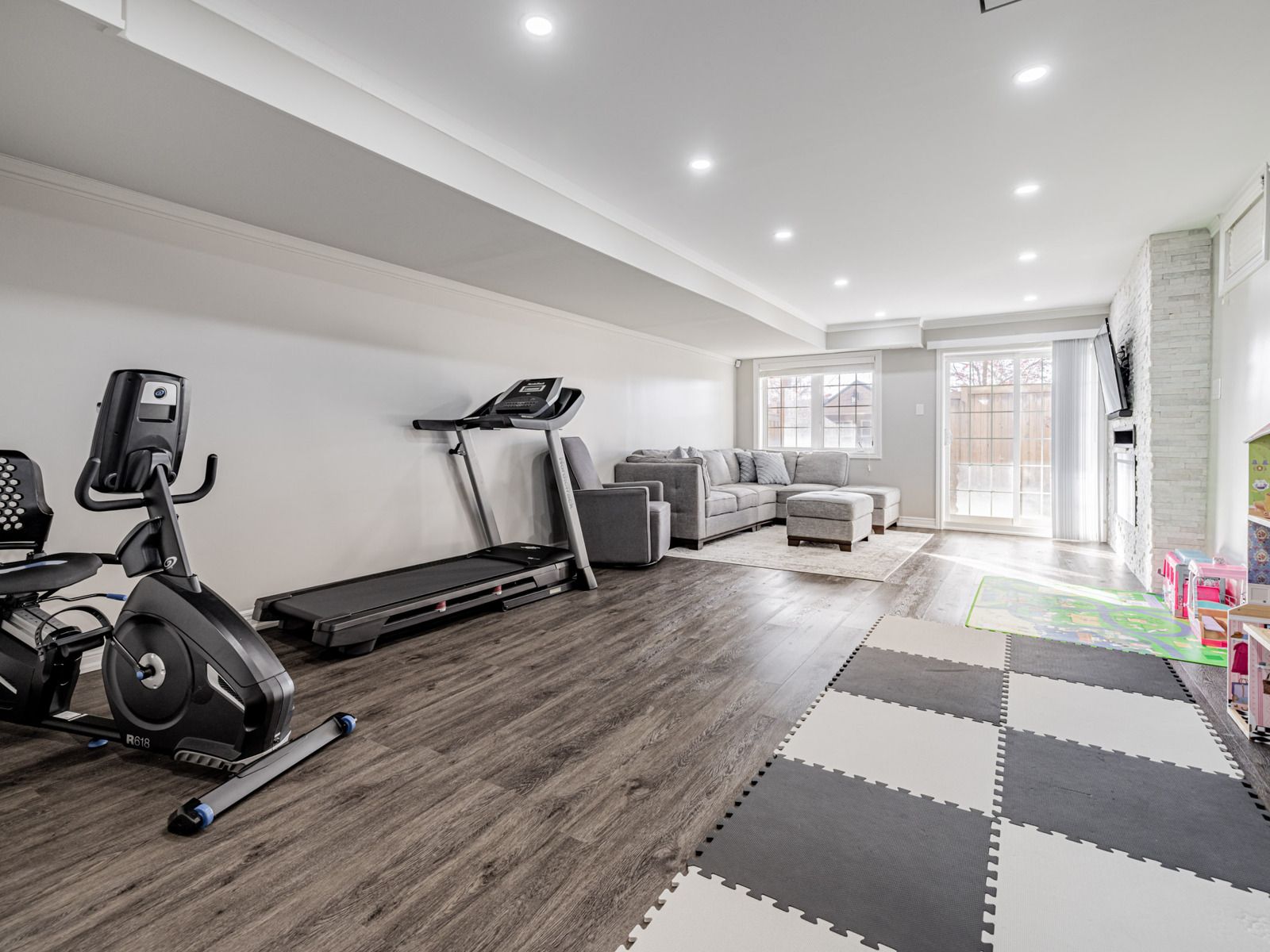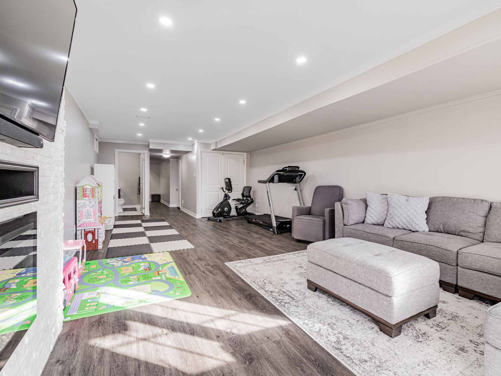 • Professionally finished basement with walk-out, fireplace, and stone accent wall.