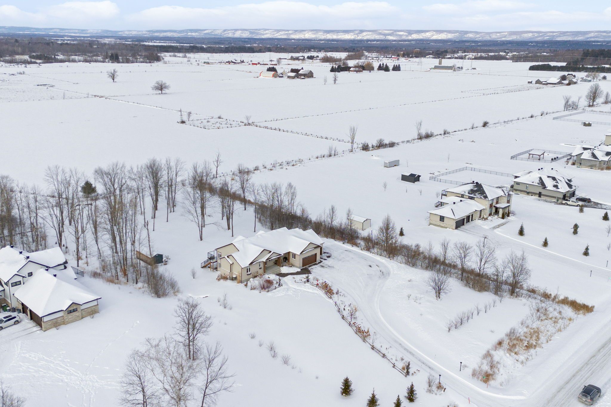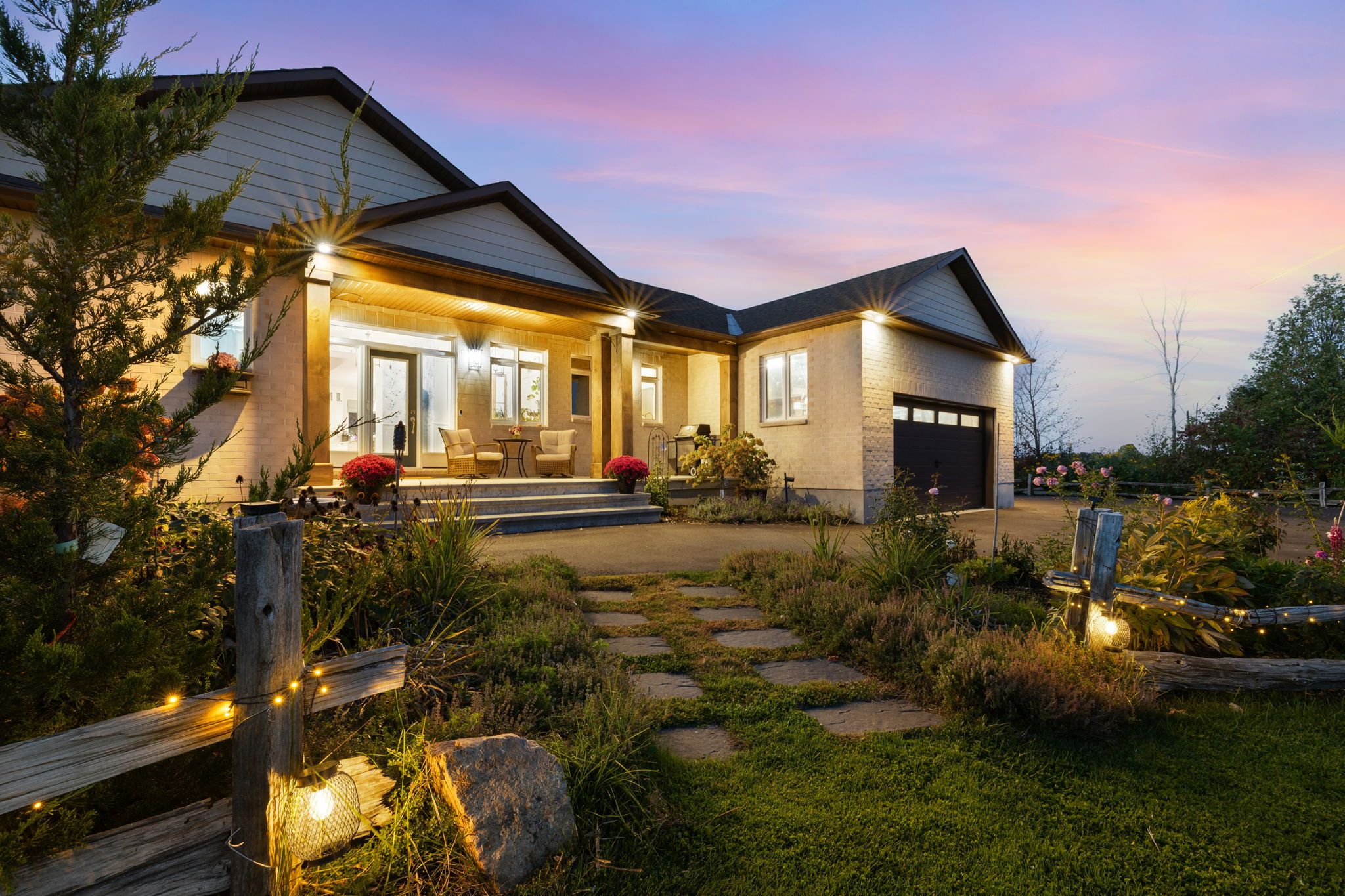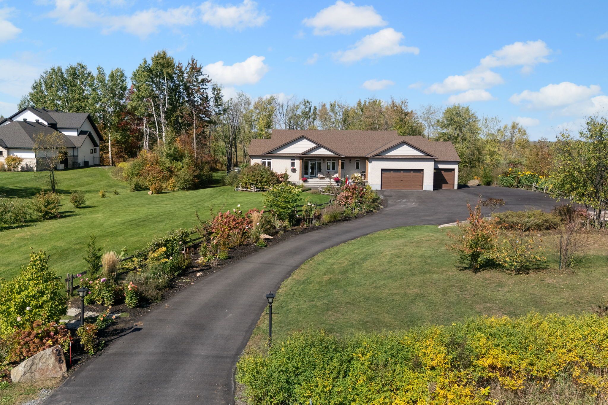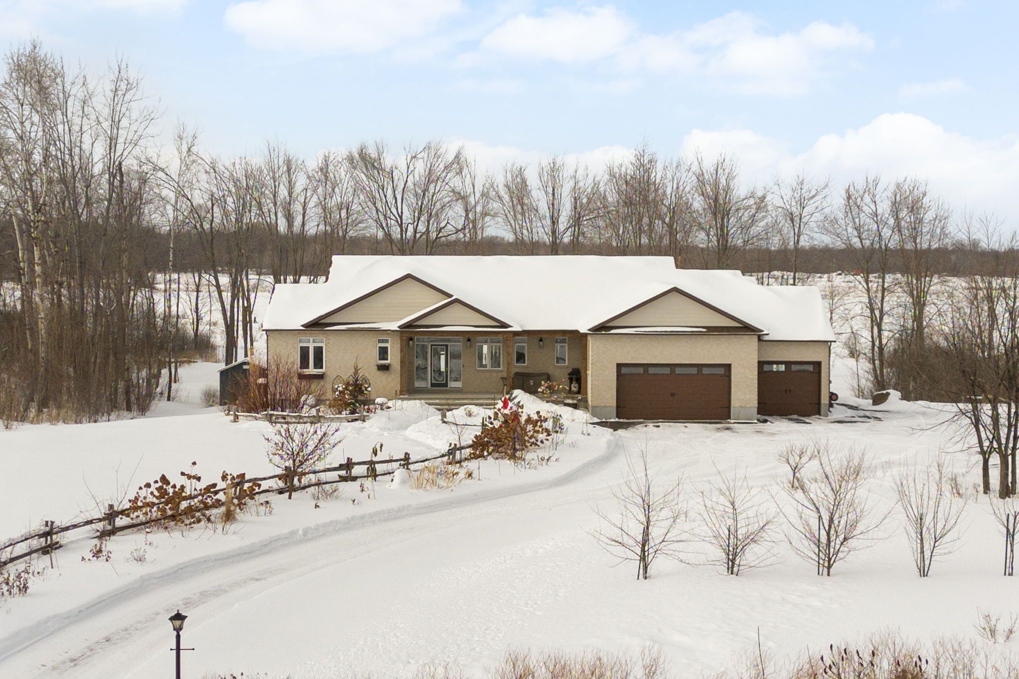Welcome to 26 synergy way, an exceptional custom-built residence located in prestigious march crest estates. Nestled on over 2 private, treed acres in rural kanata and backing onto open farmland, this property offers peaceful surroundings, and sweeping views of the gatineau hills. Built in 2018 by grizzly homes, this meticulously crafted home blends refined design, thoughtful functionality, and outstanding craftsmanship throughout. The main level features a bright, open-concept layout ideal for both everyday living and entertaining. A chef-inspired kitchen showcases quartz counters & backsplash, extra-tall stacked cabinetry, built-in microwave, pot filler, stainless steel appliances, and an impressive 10' x 5' island with extensive storage and seating. The dining area & vaulted great room offers designer lighting, pot lights, and a striking 12' real stone gas fireplace with reclaimed barn beam mantle. Sliding doors lead to a two-storey trex composite deck with glass railings, perfect for enjoying panoramic views. Three bedrooms on the main level, including a stunning primary suite with vaulted ceilings, walk-in closet, and award-winning 5-piece ensuite with heated floors. A spacious mudroom/laundry area with built-ins offers convenient access to the heated triple-car garage. Wide-plank brushed white oak hardwood flooring throughout main level. The walk-out lower level includes a fully self-contained 1,600 sq. Ft. In-law or nanny suite with two bedrooms, full kitchen, living room with electric fireplace, in-suite laundry, private garage entrance, access to a lower deck & park-like backyard. Additional unfinished space provides excellent storage. Extensive upgrades include an oversized paved driveway, generlink 12,000w generator, irrigation system, landscaped gardens with mature trees & fruit plantings, firepit, shed, and meticulous ongoing maintenance. Stylish, versatile, and impeccably cared for, this one-of-a-kind home offers an extraordinary lifestyle opportunity.