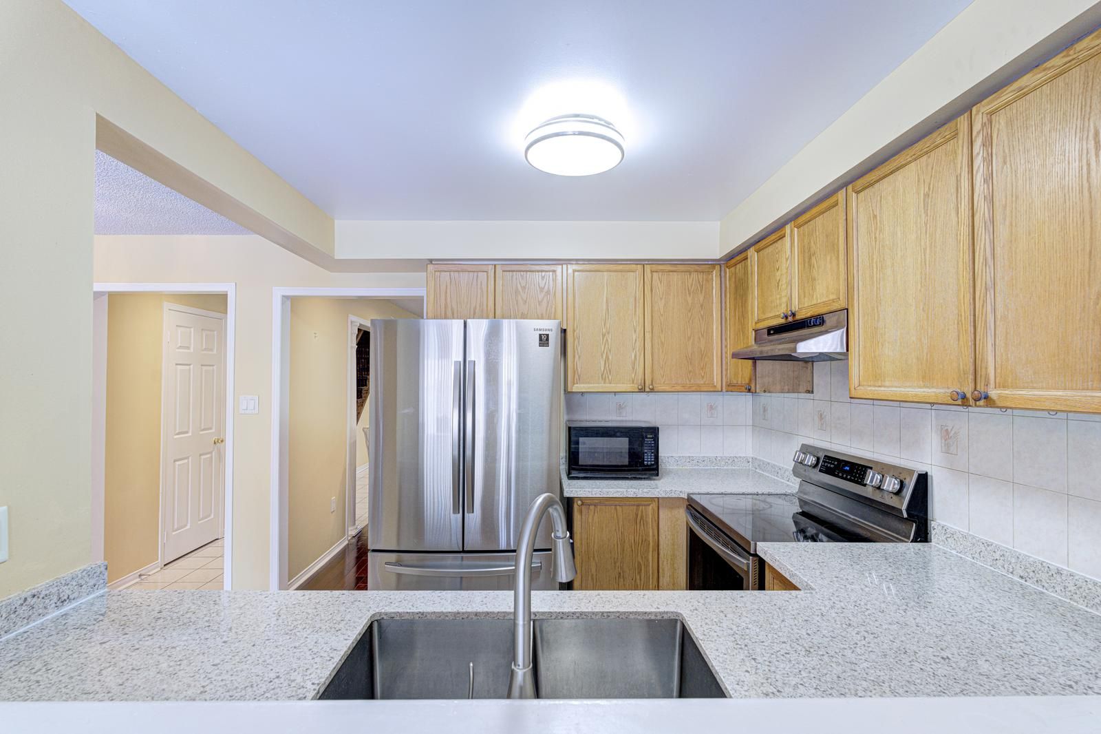 • Modern kitchen featuring granite countertops and stainless steel appliances.