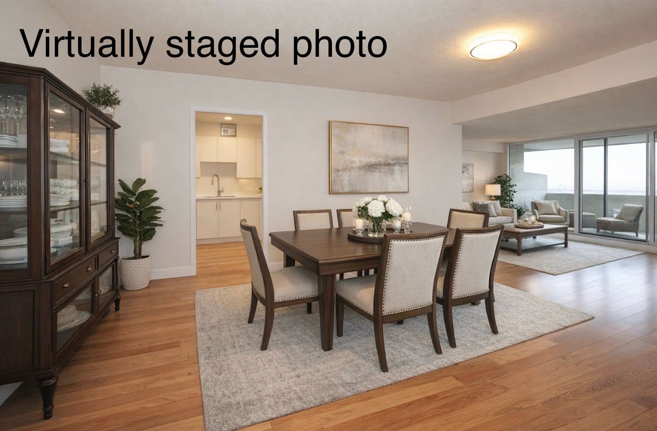 Spacious 2 bedroom 2 bathroom suite located in the- lambton square community. New white kitchen cabinets, expansive private balcony with quiet views of the; courtyard/ city /cn tower. Eat- in kit., separate dining room, large living room with floor to ceiling windows. Large primary bedroom that can accommodate a king size bed with 4 pc bath & large closet. Exclusive use; parking & locker, large ensuite laundry room. Electric bbq's are allowed. Recently updated lobby, hallways and suite door. The maintenance fee is all inclusive covering; heat/hydro//central air/water/high speed rogers ignite internet & cable, common elements, parking, locker and building insurance. Amenities include; outdoor pool with terrace, gym, party room, library, sauna, bike storage, car wash and ample visitor parking. Steps to; ttc, soon to come eglinton lrt,lambton and scarlett wood golf courses and beautiful james gardens. Floor plan attached.