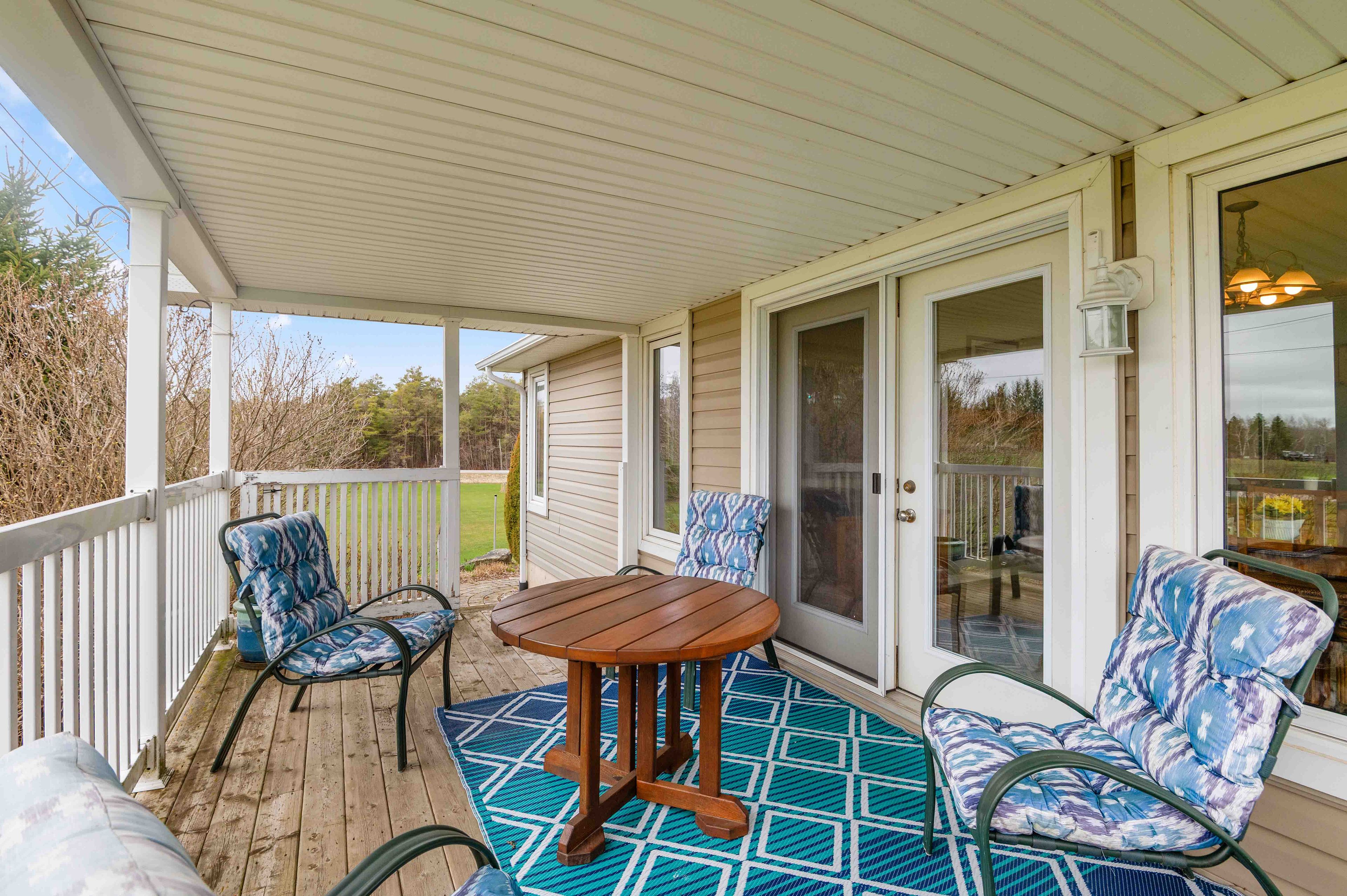 • Charming porch overlooking a pond, perfect for outdoor living and views.
