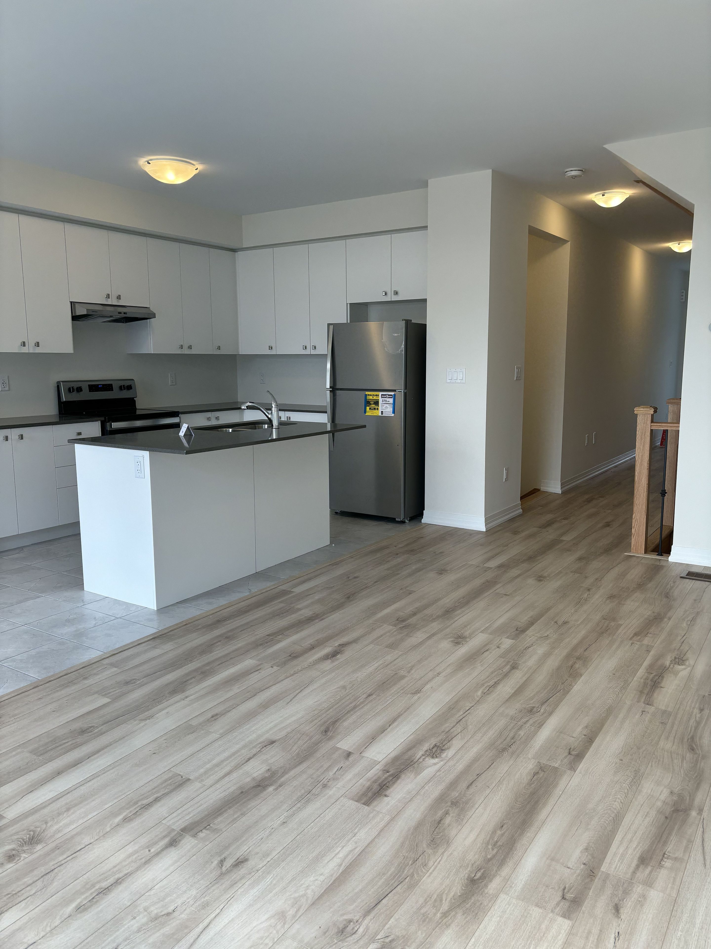 Luxury townhouse at pickering. Full of sunlight. Single car garage. Driveway can park 1 more cars. Huge living room access to balcony. 9' smooth ceiling throughout. Modern kitchen with island with breakfast bar. Engineering hardwood flooring and quartz countertops in first floor. Open concept layout with huge dining room and living room. Large master bedroom, 5 piece en-suite with glass shower and walk-in closet. Prefer non smoker. Few minutes to 407 and 401. Tenant is responsible for all utilities and hot water tank rental cost. Please have your credit report and employment letter ready. Professional cleaning and new paint throughout will be ready by may 1st move in. Thanks for your visit!