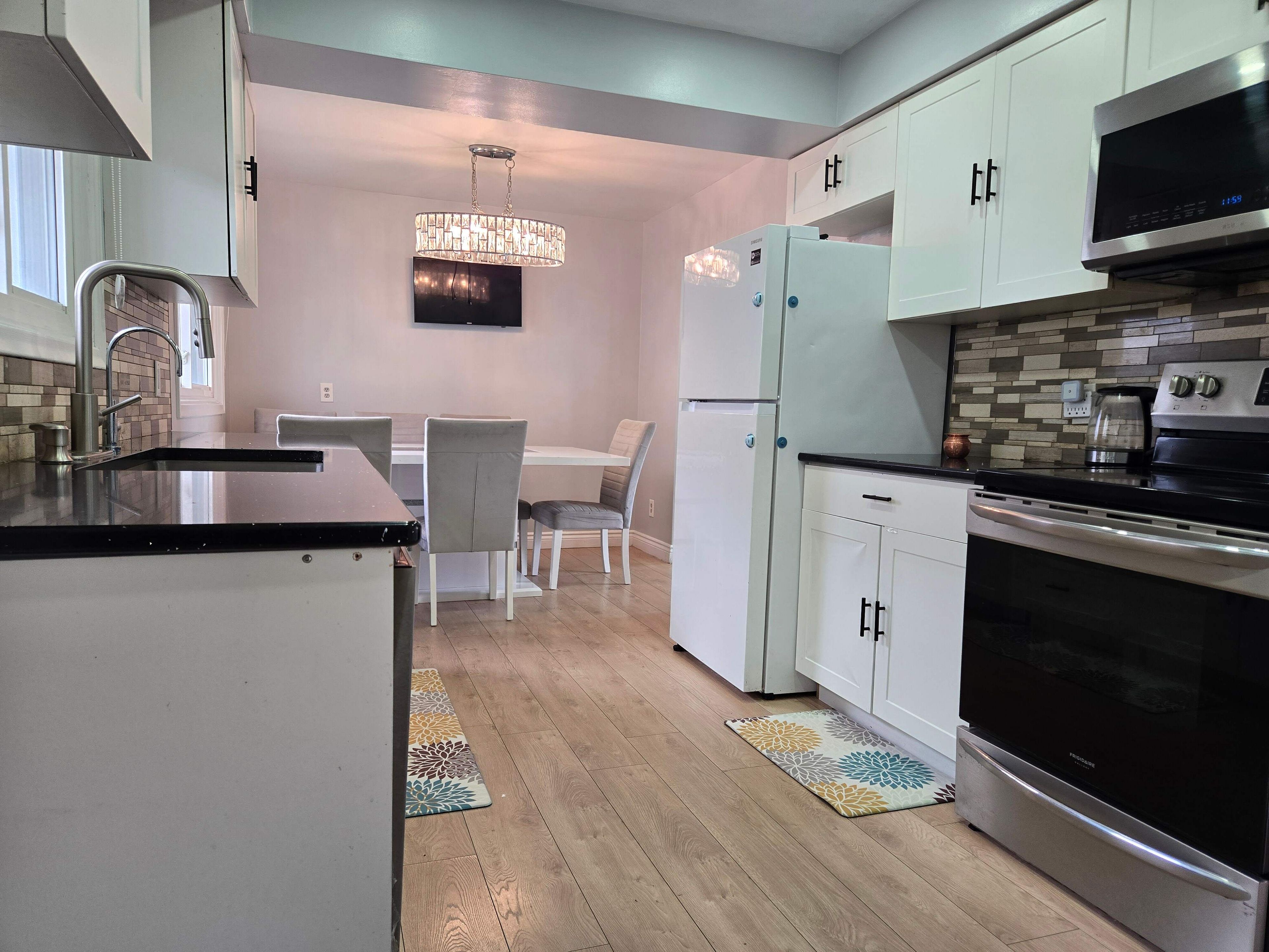 • Large upgraded eat-in kitchen with quartz countertops and new cabinets.
