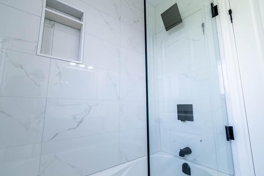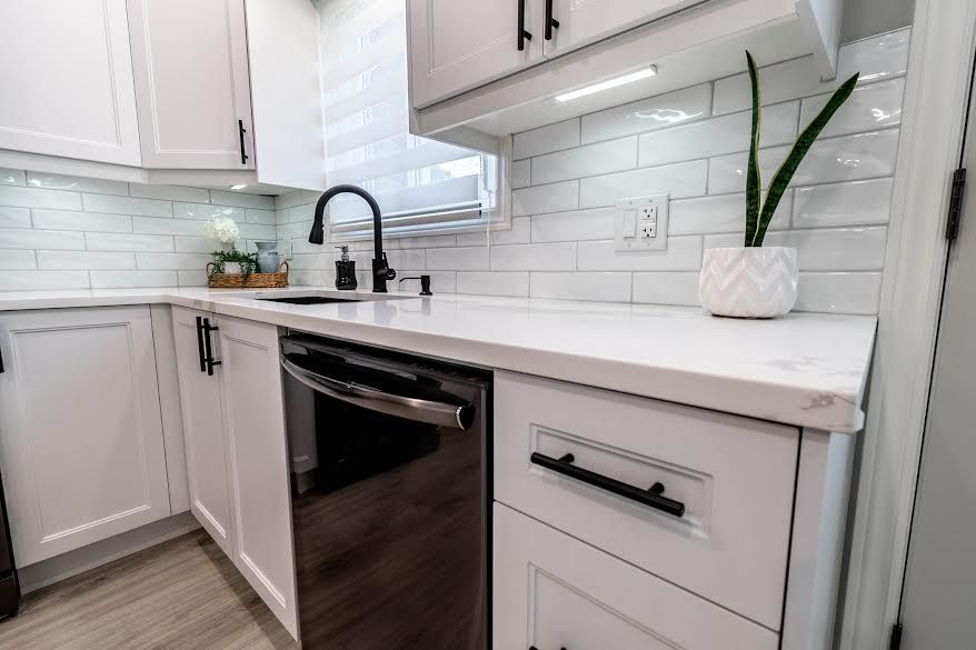 • Modern kitchen with quartz countertops and new black stainless appliances.