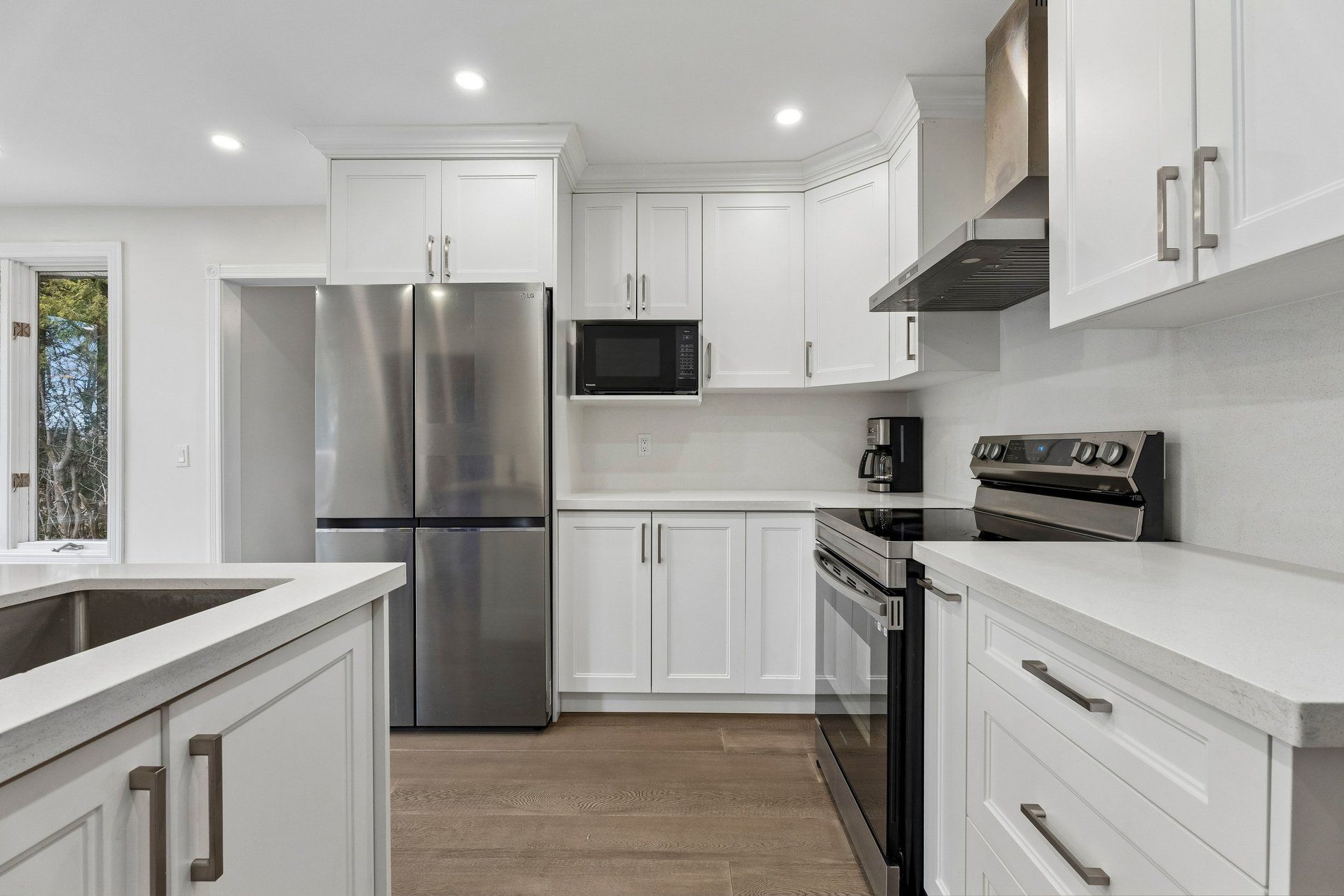 • Spacious chef's kitchen with three-sided windows and breakfast area.