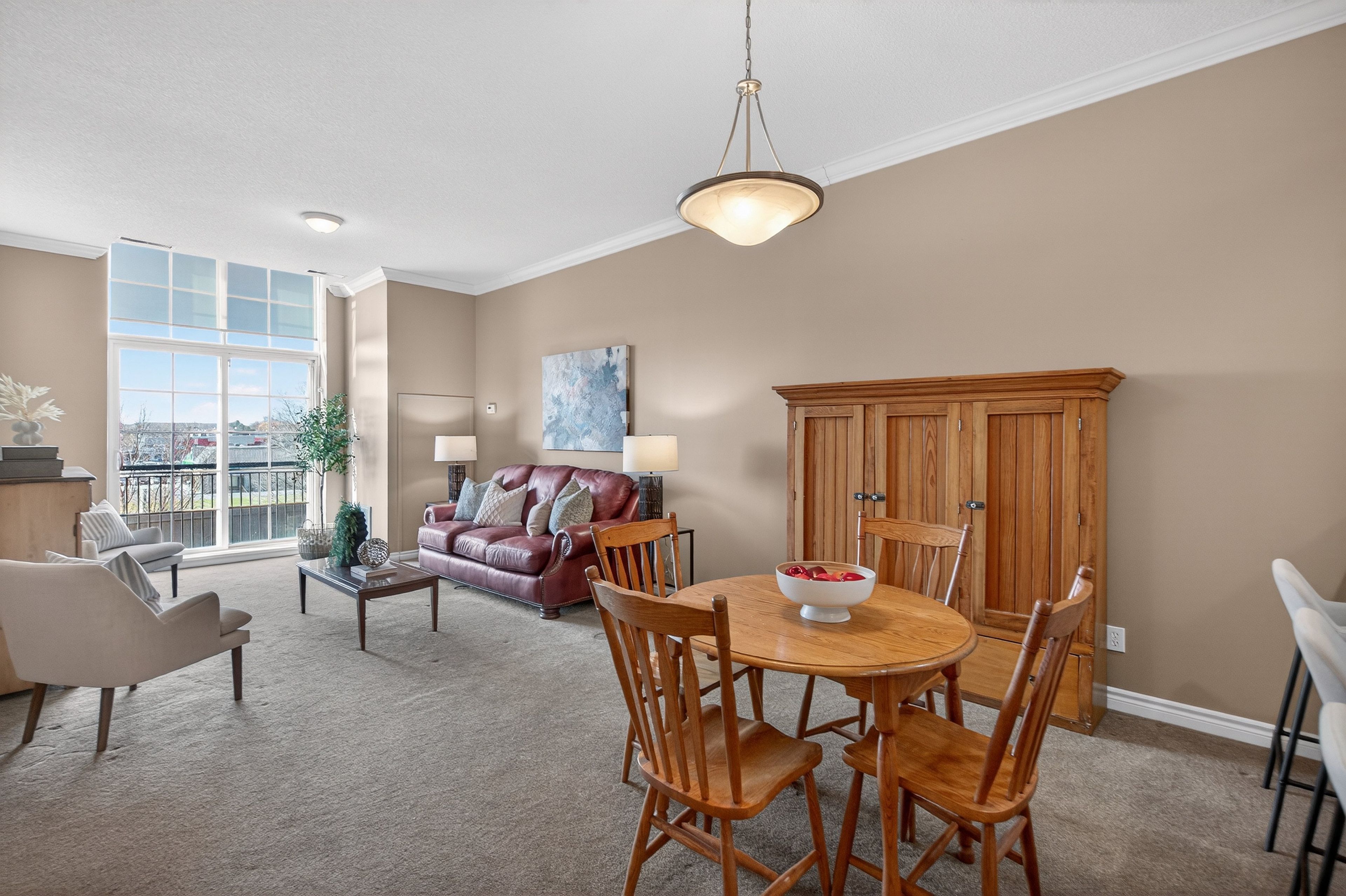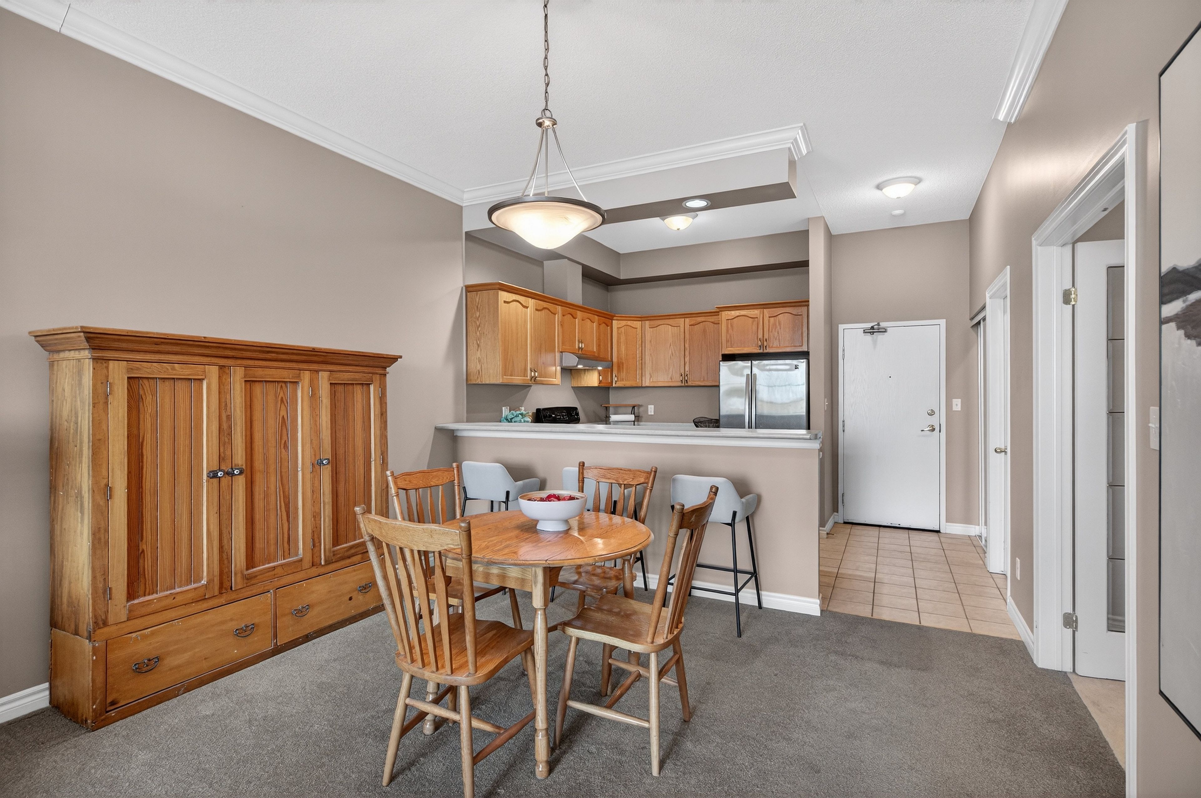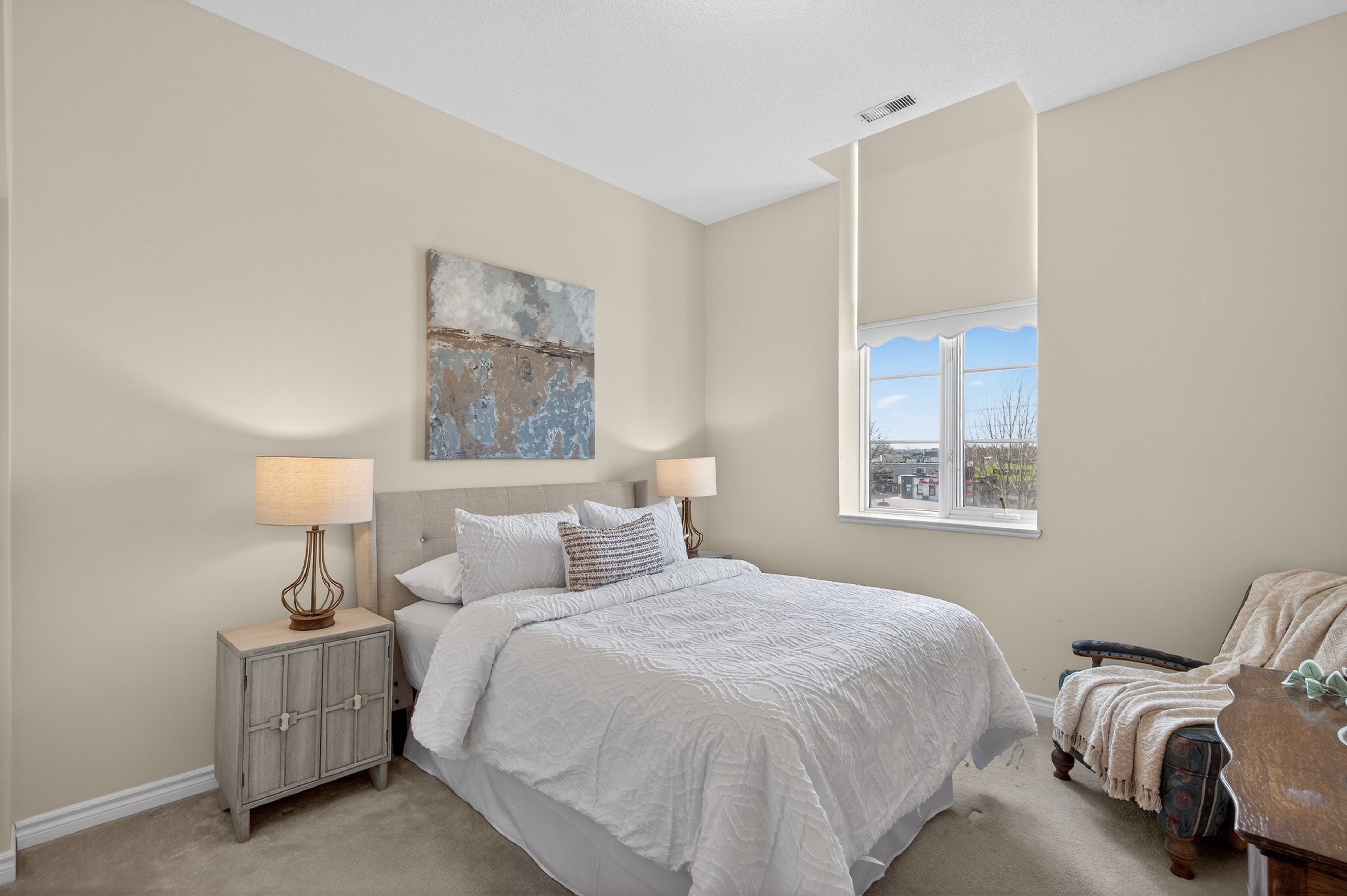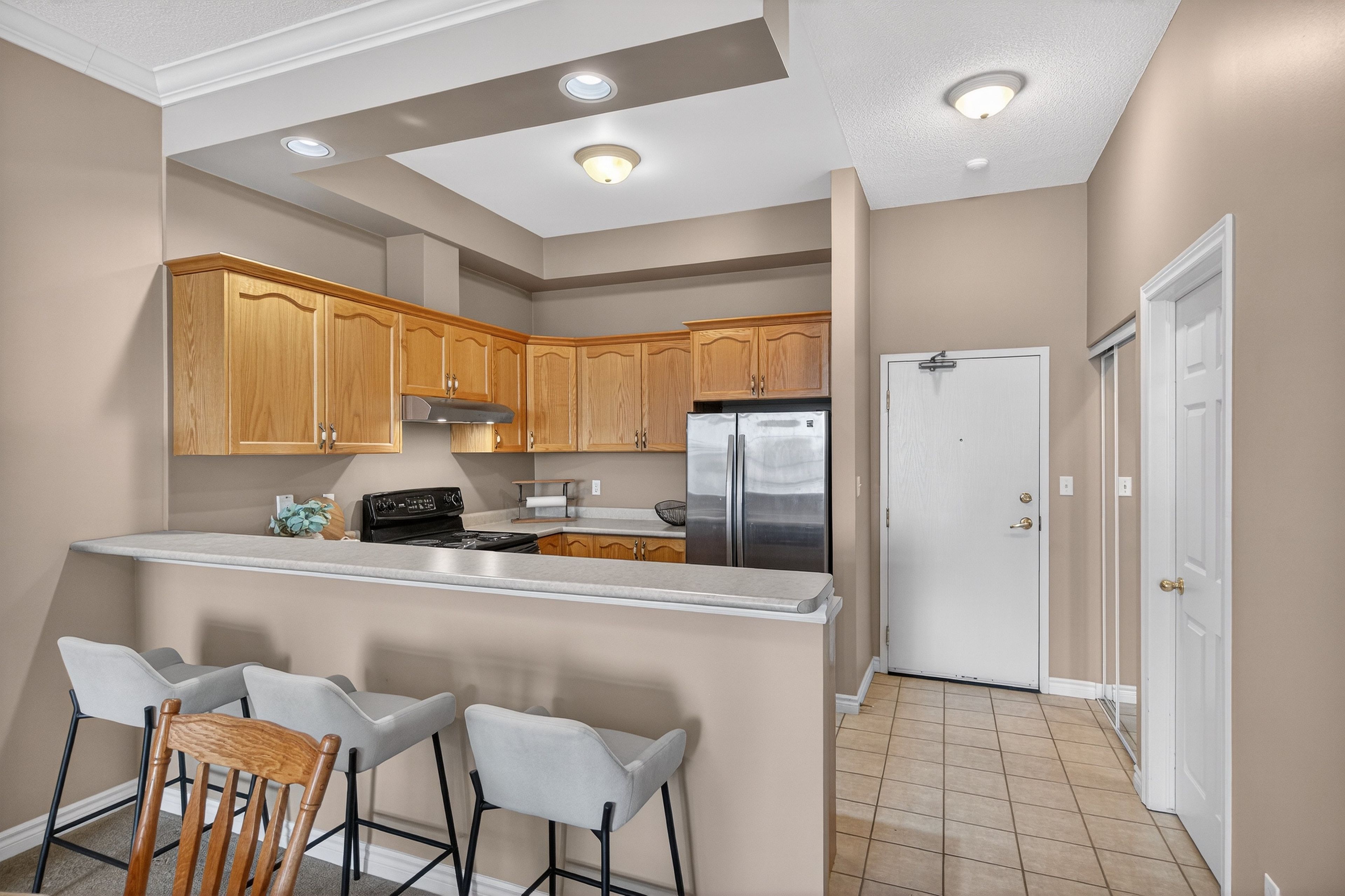 Welcome to this sun-filled, beautifully appointed 1+1 bedroom/den condo in the highly sought-after historic waterdown high school building-an iconic circa 1923 landmark, condo conversion registered 2000 - known for its excellent management and meticulous upkeep. Soaring 10-foot ceilings enhance the bright, open-concept living and dining area, creating an inviting and spacious feel. The kitchen is both stylish and functional, featuring stainless steel appliances, a double sink, and a convenient breakfast bar that flows seamlessly into the main living space. The generous primary bedroom offers a double closet with built-in shelving, while the den with double french doors provides the perfect setup for a home office or guest retreat. An oversized laundry/utility room adds incredible versatility with front load washer and dryer and abundant storage. Additional highlights include owned underground parking and an exclusive storage locker. Enjoy a private north-west facing balcony with views of nearby amenities and stunning sunsets, all just steps from shopping and dining. Move-in ready and offering exceptional value, this is a rare turn-key opportunity not to be missed.