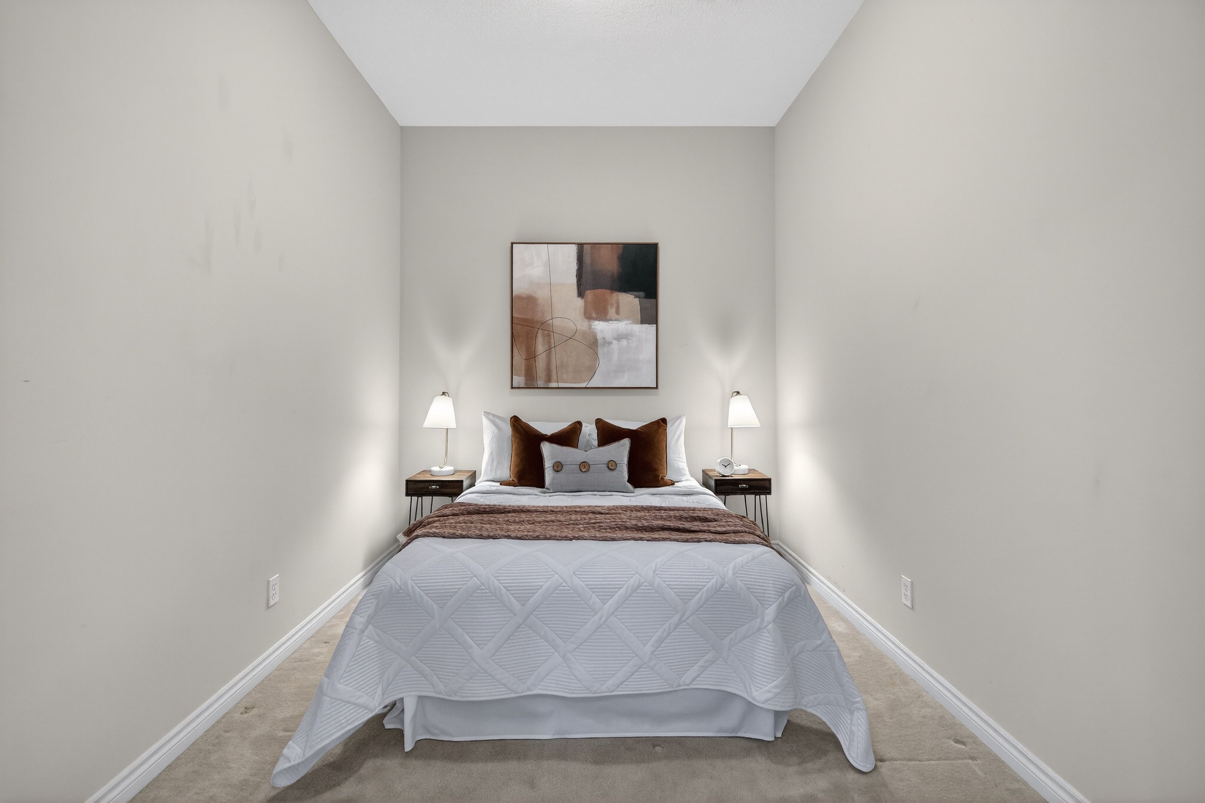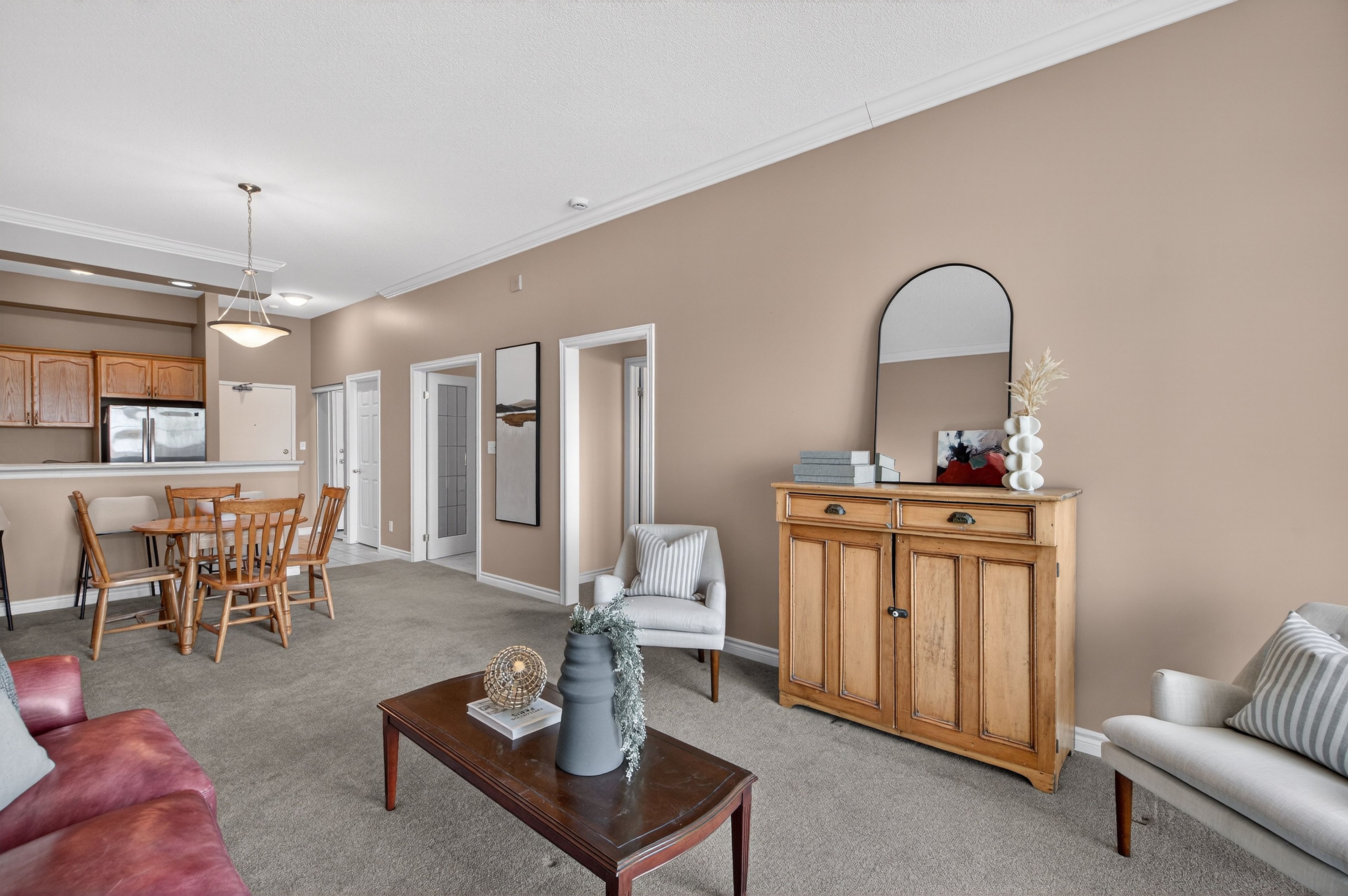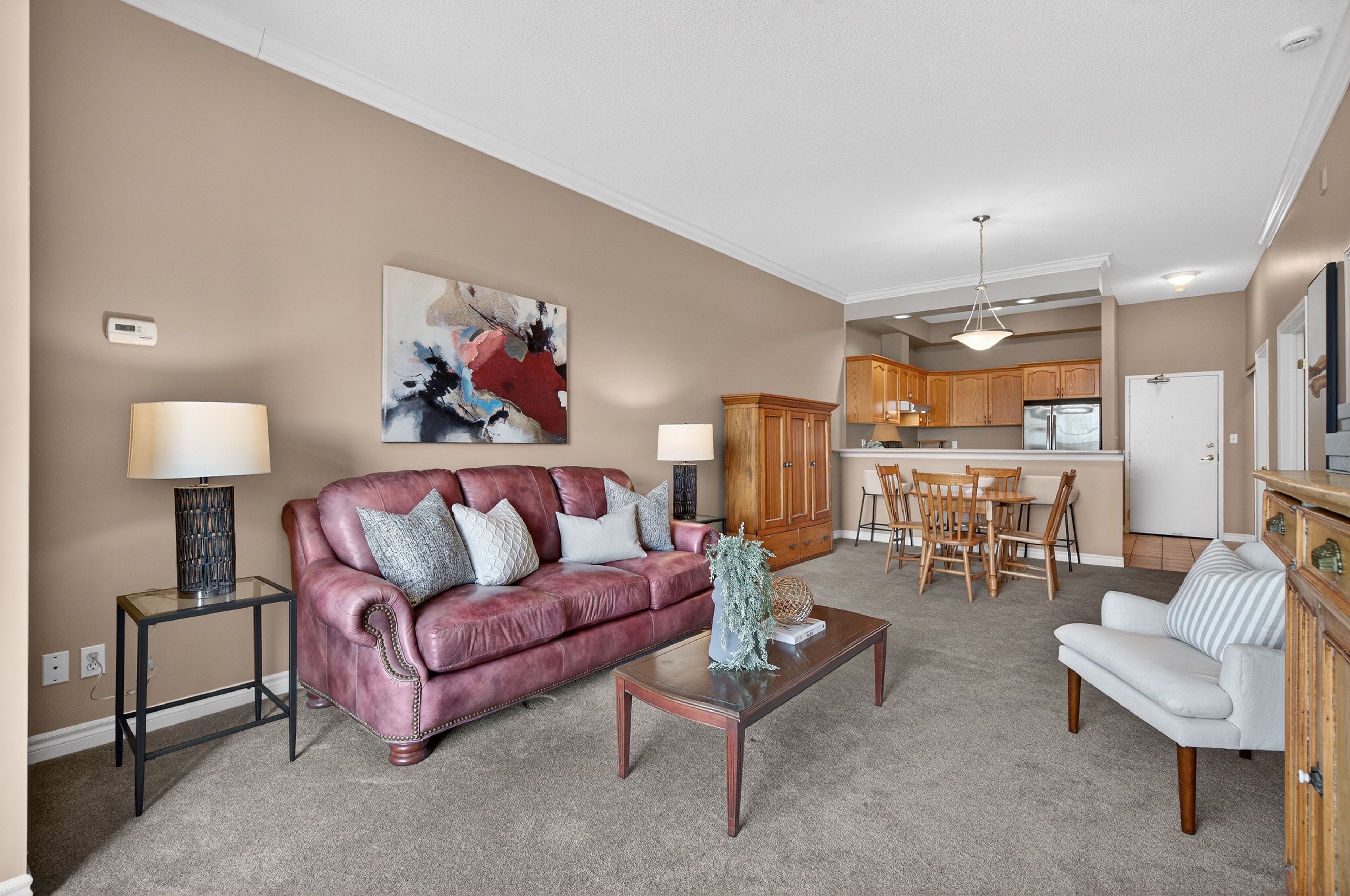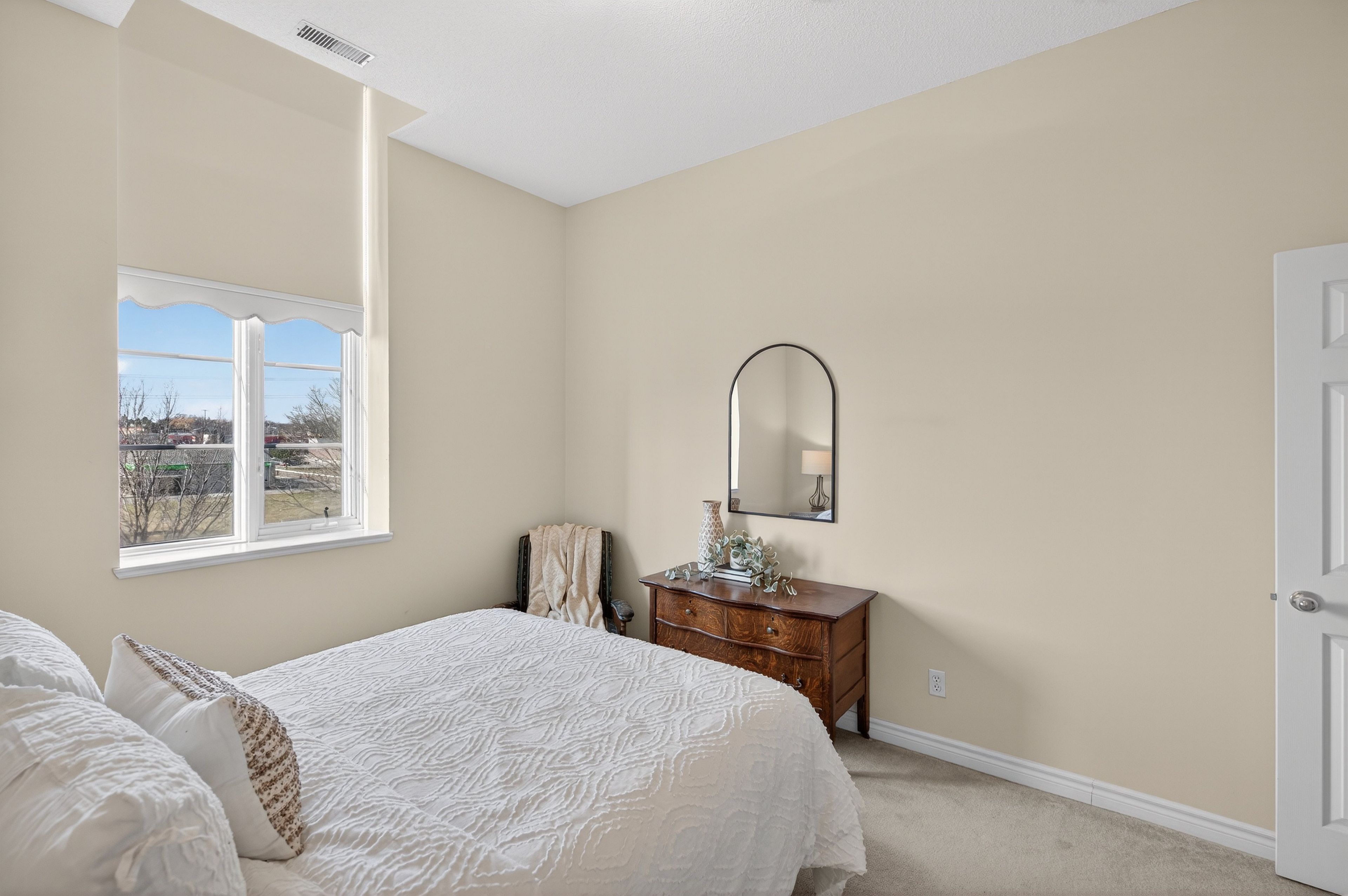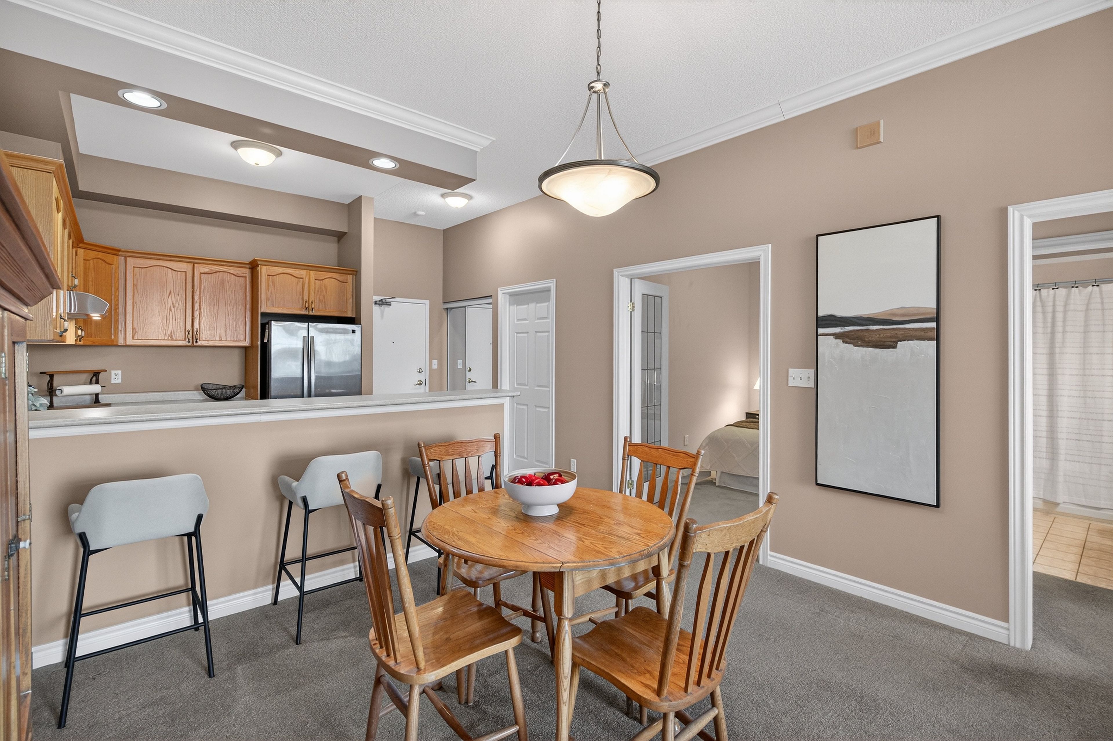 Welcome to this sun-filled, beautifully appointed 1+1 bedroom/den condo in the highly sought-after historic waterdown high school building-an iconic circa 1923 landmark, condo conversion registered 2000 - known for its excellent management and meticulous upkeep. Soaring 10-foot ceilings enhance the bright, open-concept living and dining area, creating an inviting and spacious feel. The kitchen is both stylish and functional, featuring stainless steel appliances, a double sink, and a convenient breakfast bar that flows seamlessly into the main living space. The generous primary bedroom offers a double closet with built-in shelving, while the den with double french doors provides the perfect setup for a home office or guest retreat. An oversized laundry/utility room adds incredible versatility with front load washer and dryer and abundant storage. Additional highlights include owned underground parking and an exclusive storage locker. Enjoy a private north-west facing balcony with views of nearby amenities and stunning sunsets, all just steps from shopping and dining. Move-in ready and offering exceptional value, this is a rare turn-key opportunity not to be missed.