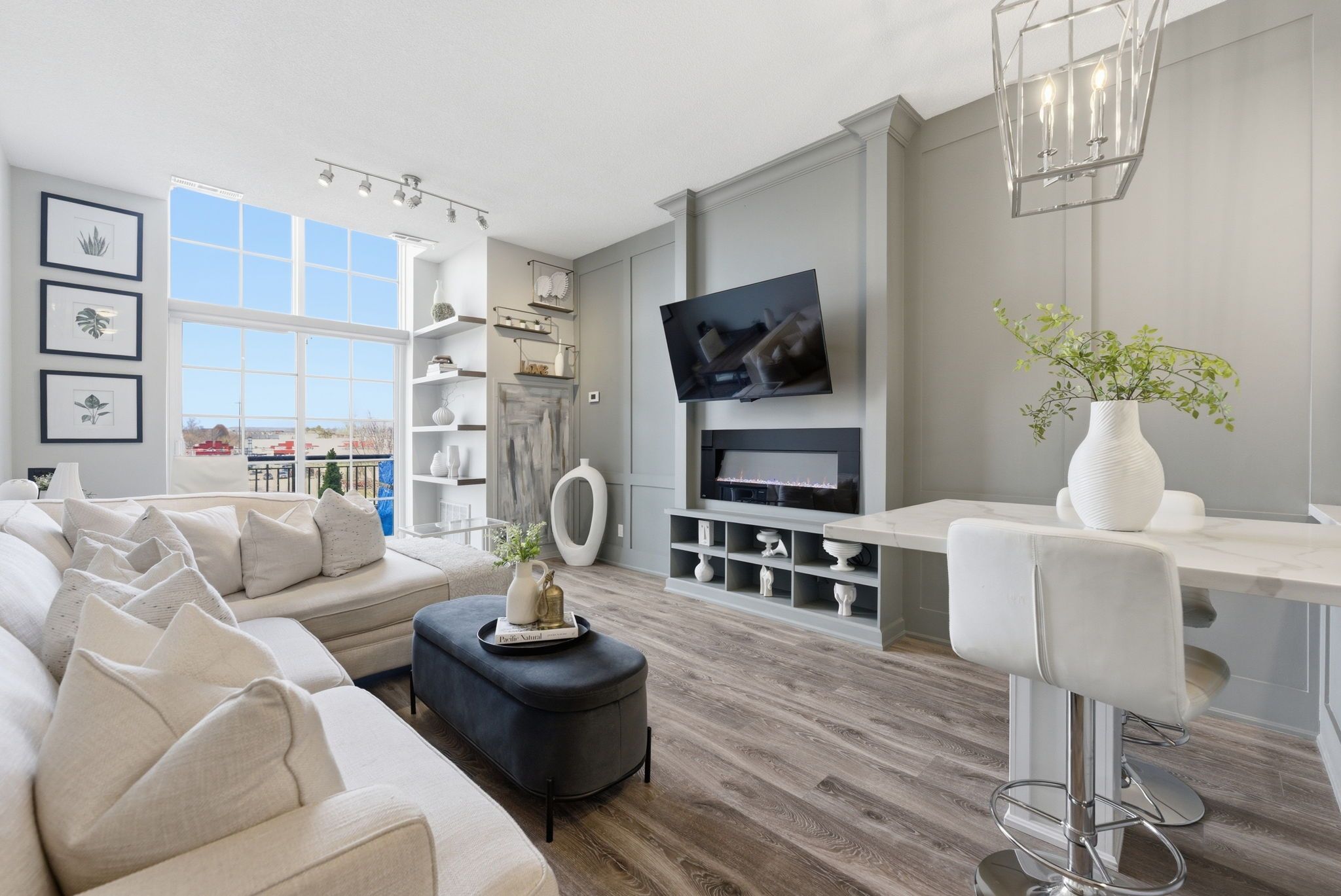Stunning, renovated, and thoughtfully designed, this spacious suite offers a dream layout with stylish, chic upgrades at every turn. Sun-filled and beautifully appointed, the open concept living and dining area is anchored by a board and batten fireplace feature wall with an electric fireplace, custom built-in shelving, office nook and grand living space. Wide plank oak-inspired laminate flooring runs throughout, tying the space together with a clean, modern feel. Double sliding doors open to a private north-facing balcony, bringing in natural light. The kitchen was fully custom-designed and features quartz countertops, a tile backsplash, white cabinetry, an undermount double sink, stainless steel appliances, and upgraded lighting. Polished and well-equipped for everyday cooking with a customized island breakfast bar/dining area to gather around. The primary bedroom is generously sized with an oversized window and a double door closet. The bathroom was renovated to match with patterned tile flooring, a custom glass shower door, upgraded wall tile, a custom vanity, and updated fixtures throughout. Storage is a standout. The spacious foyer includes a double sliding door entry closet, a linen/pantry-style closet, and an additional hallway storage closet, all with upgraded trim and casings. The oversized laundry and utility room adds even more flexibility with a utility sink and ample additional storage. Double sliding doors open to a private north-facing balcony, bringing in natural light overlooking everyday amenities within walking distance. This is a move-in ready home that delivers genuine value. A turn-the-key-and-unpack opportunity that doesn't come along often.