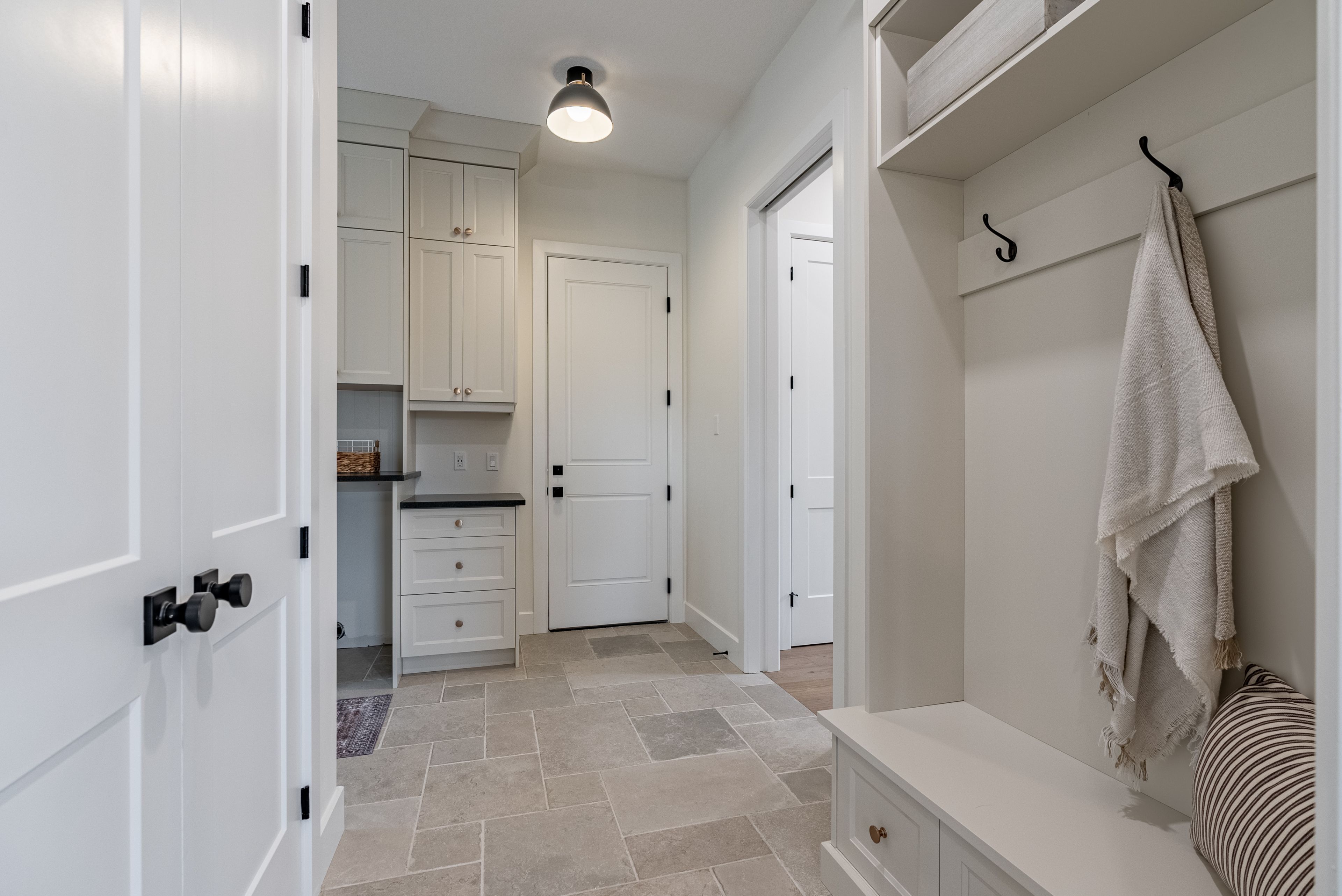 • Spacious kitchen featuring stone counters, large island, and walk-in pantry.