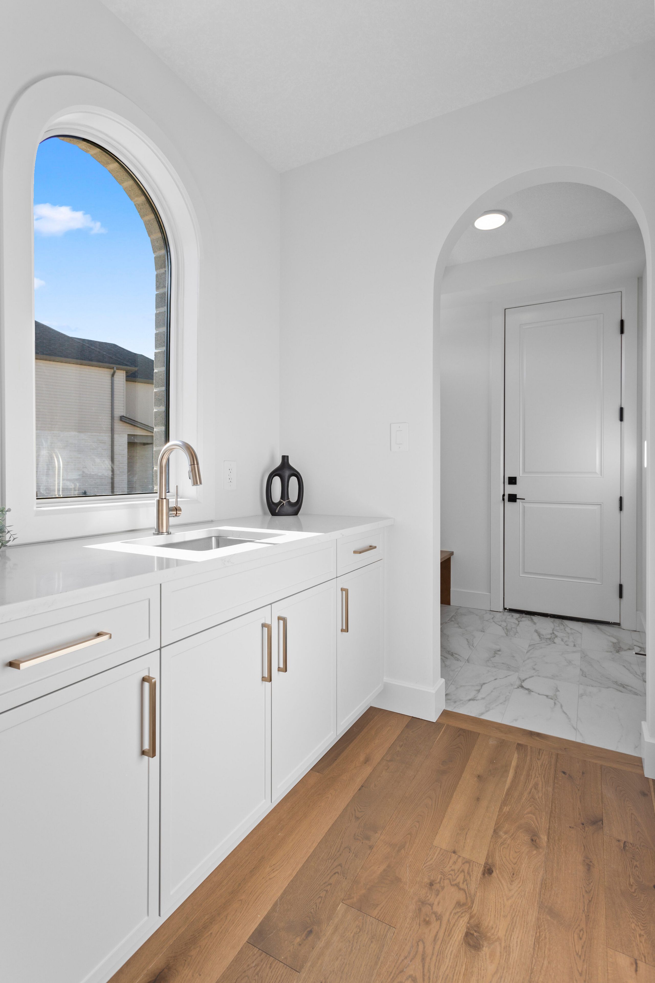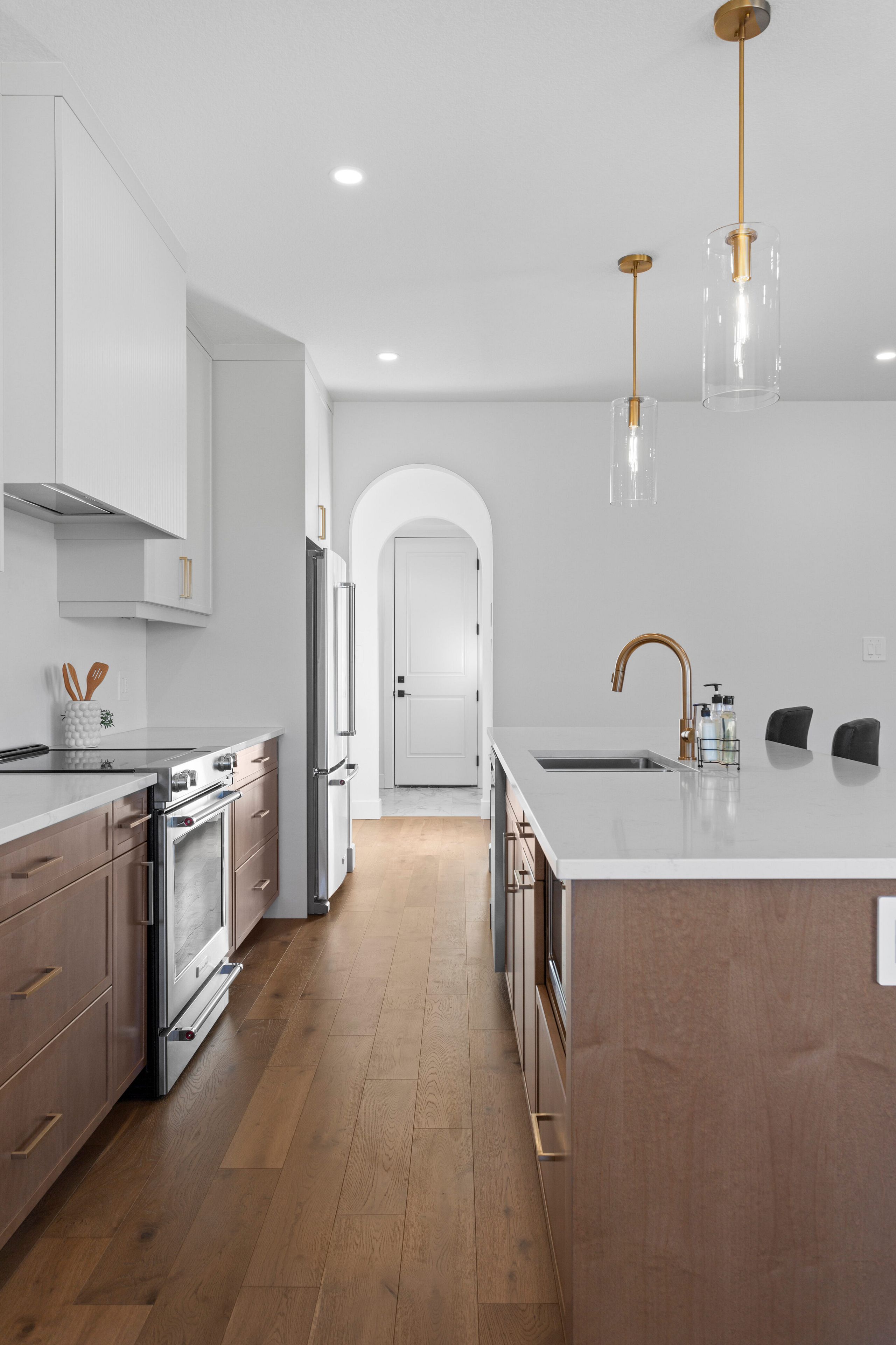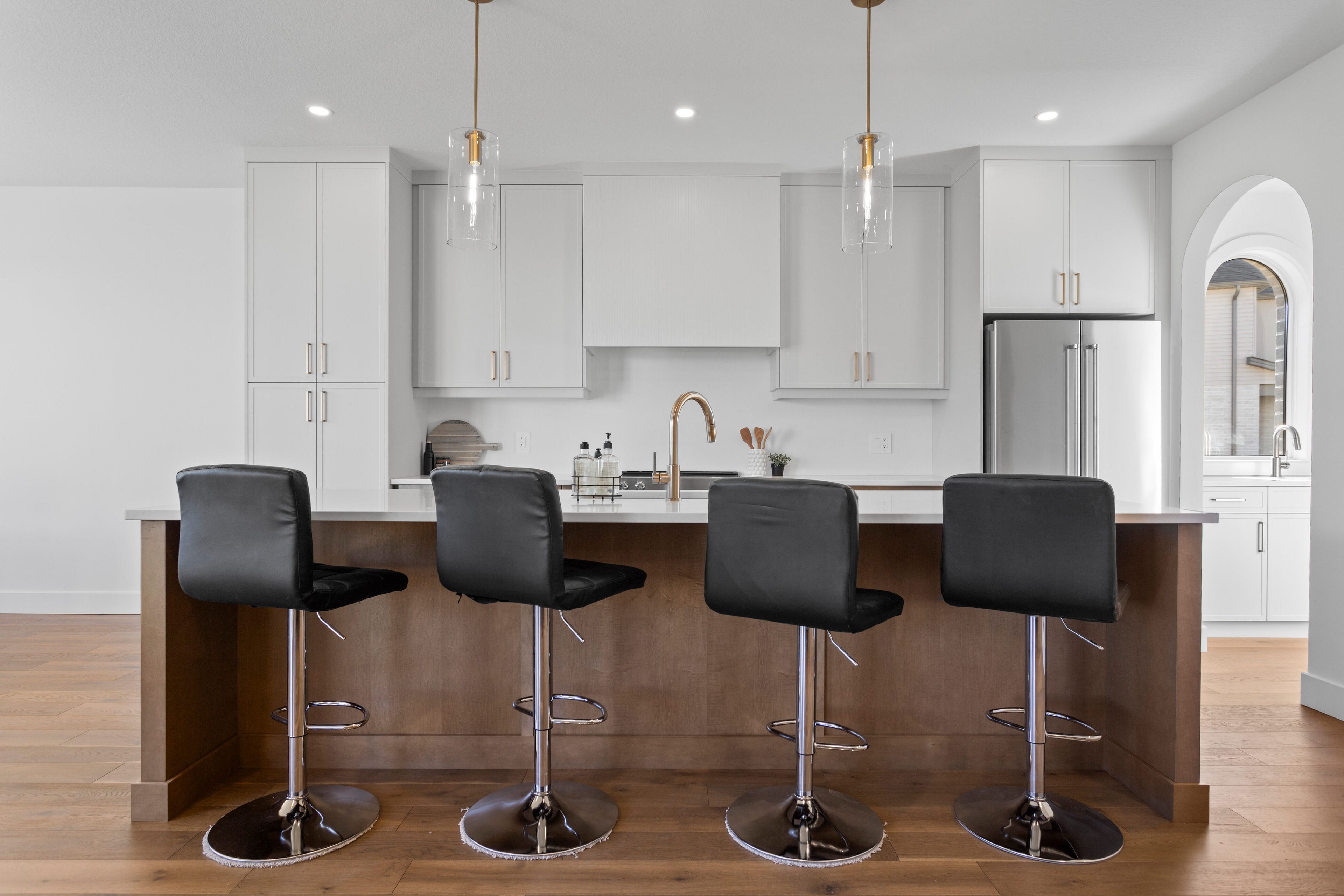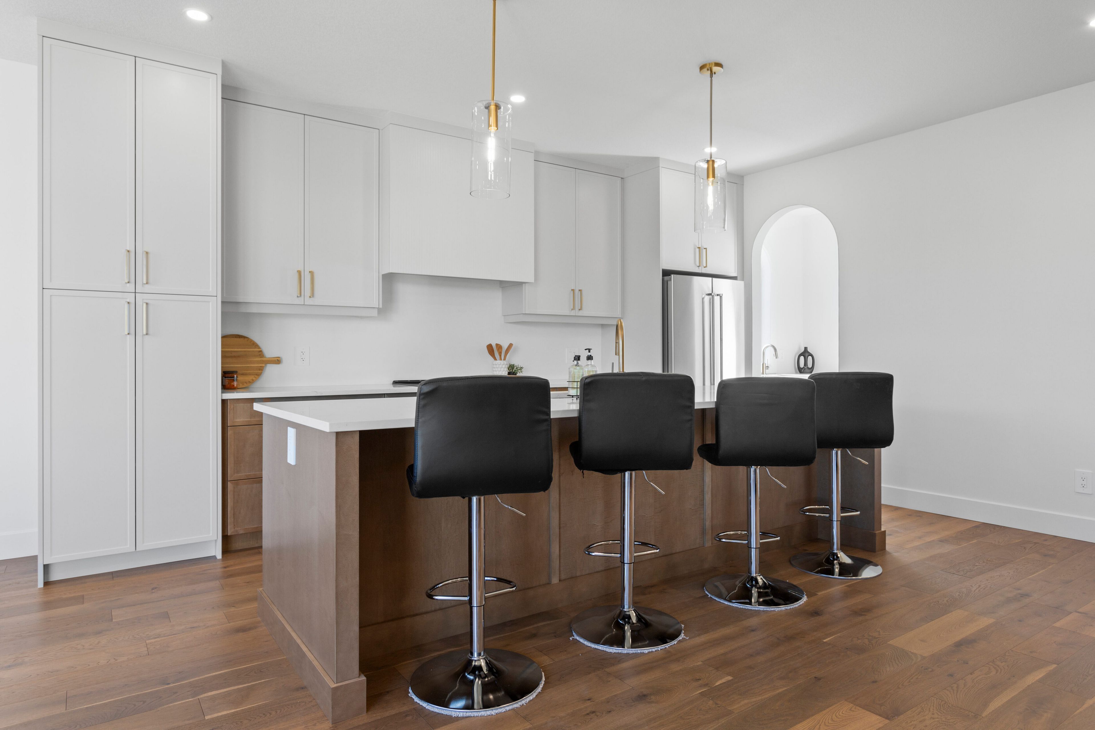 • Modern kitchen features custom cabinetry and a butler's pantry.