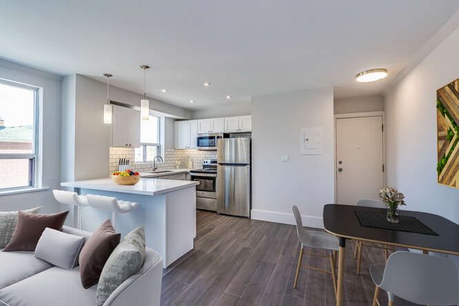 Bright and spacious 1-bed, 1-bath apartment in a well-managed multiplex. Main floor unithas open concept living/dining area and a modern kitchen with s/s appliances, a breakfast bar and plenty of storage. Two large windows allow for plenty of natural light. There is an extra closet outside of the newly renovated 4-pc bathroom. The large bedroom also boasts a large window. Close to transit, shopping and easy access to 401. Sparkle solutions laundry service with reloadable card, conveniently located in building. Pet friendly. Parking available in garage or outside for a fee
