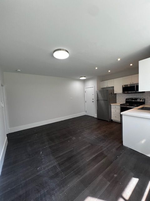 • Open concept living/dining area with modern kitchen and stainless steel appliances.