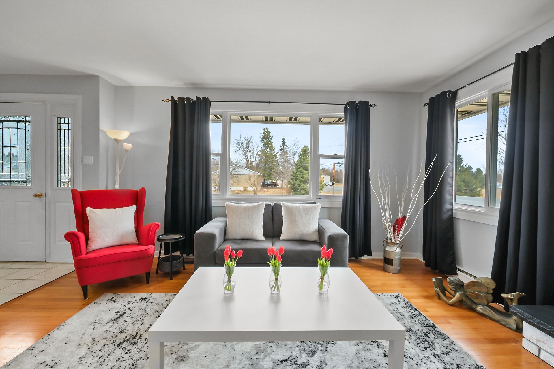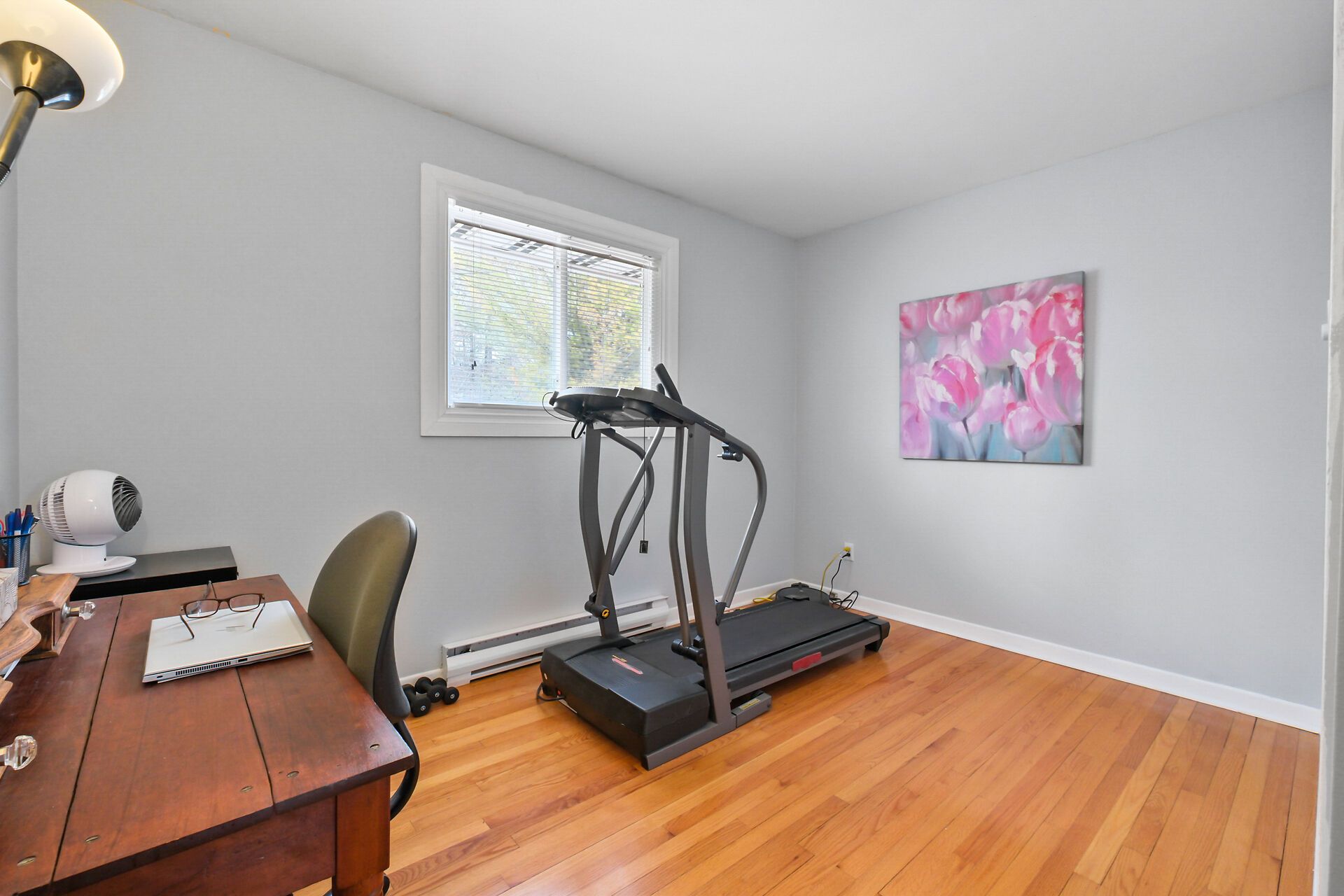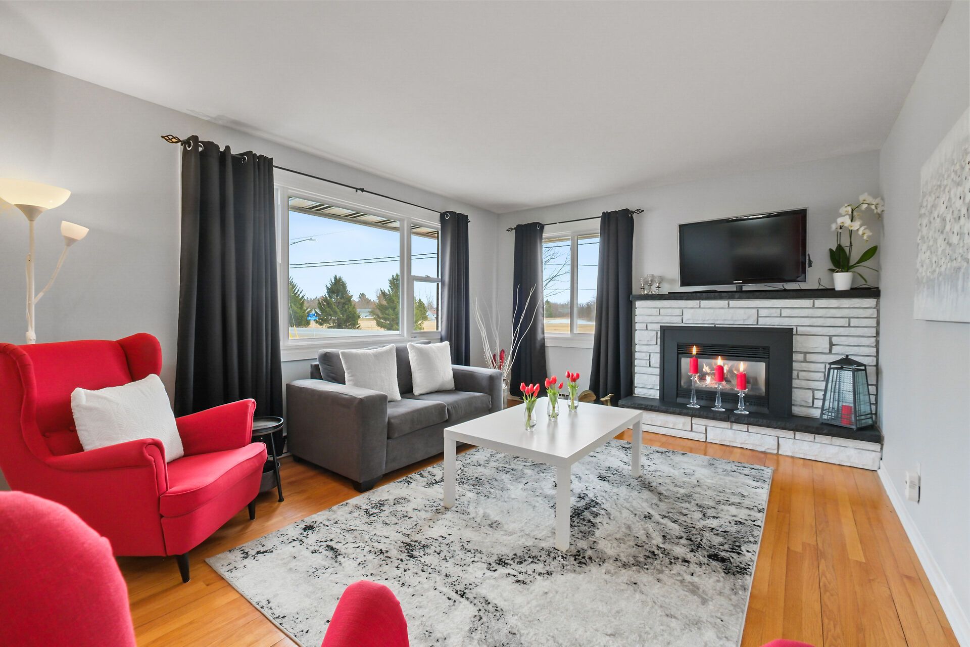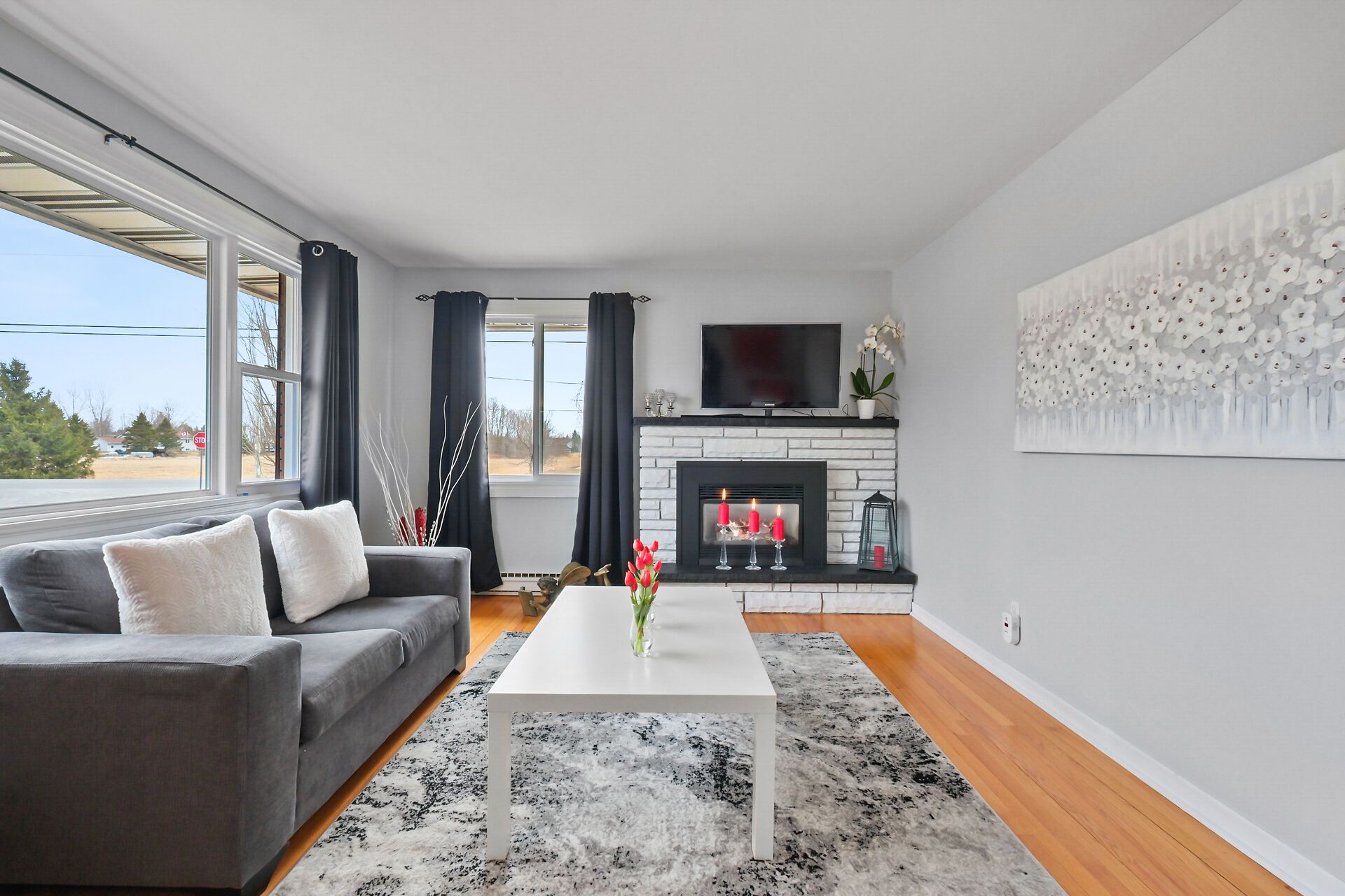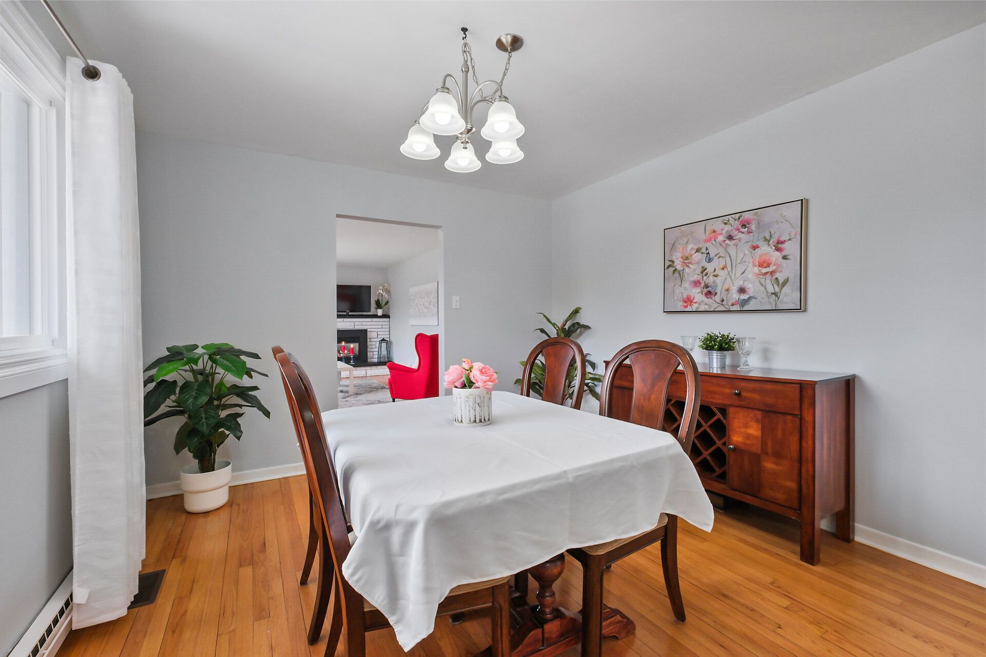 • Cozy living room with a fireplace and no carpet on the main level.