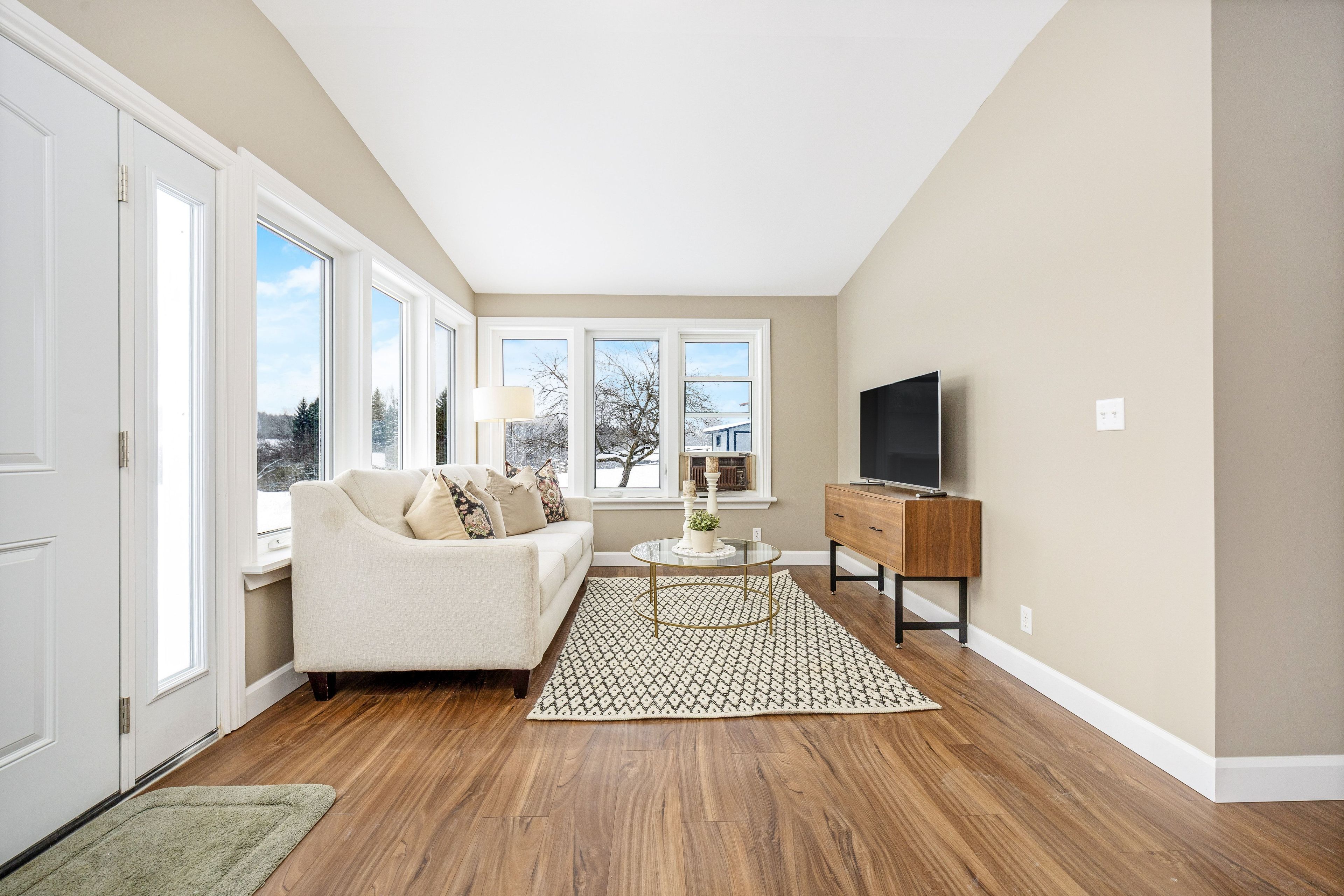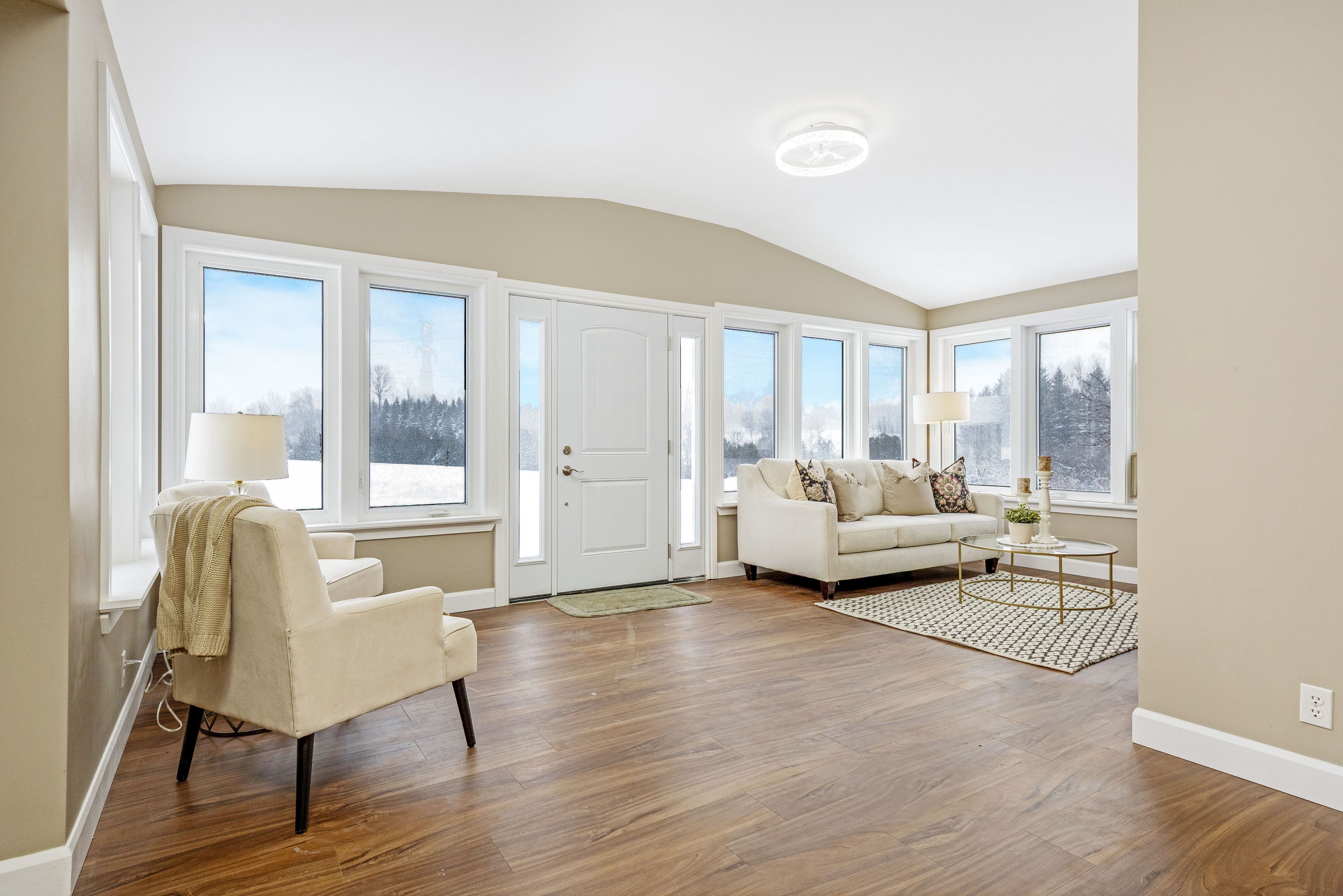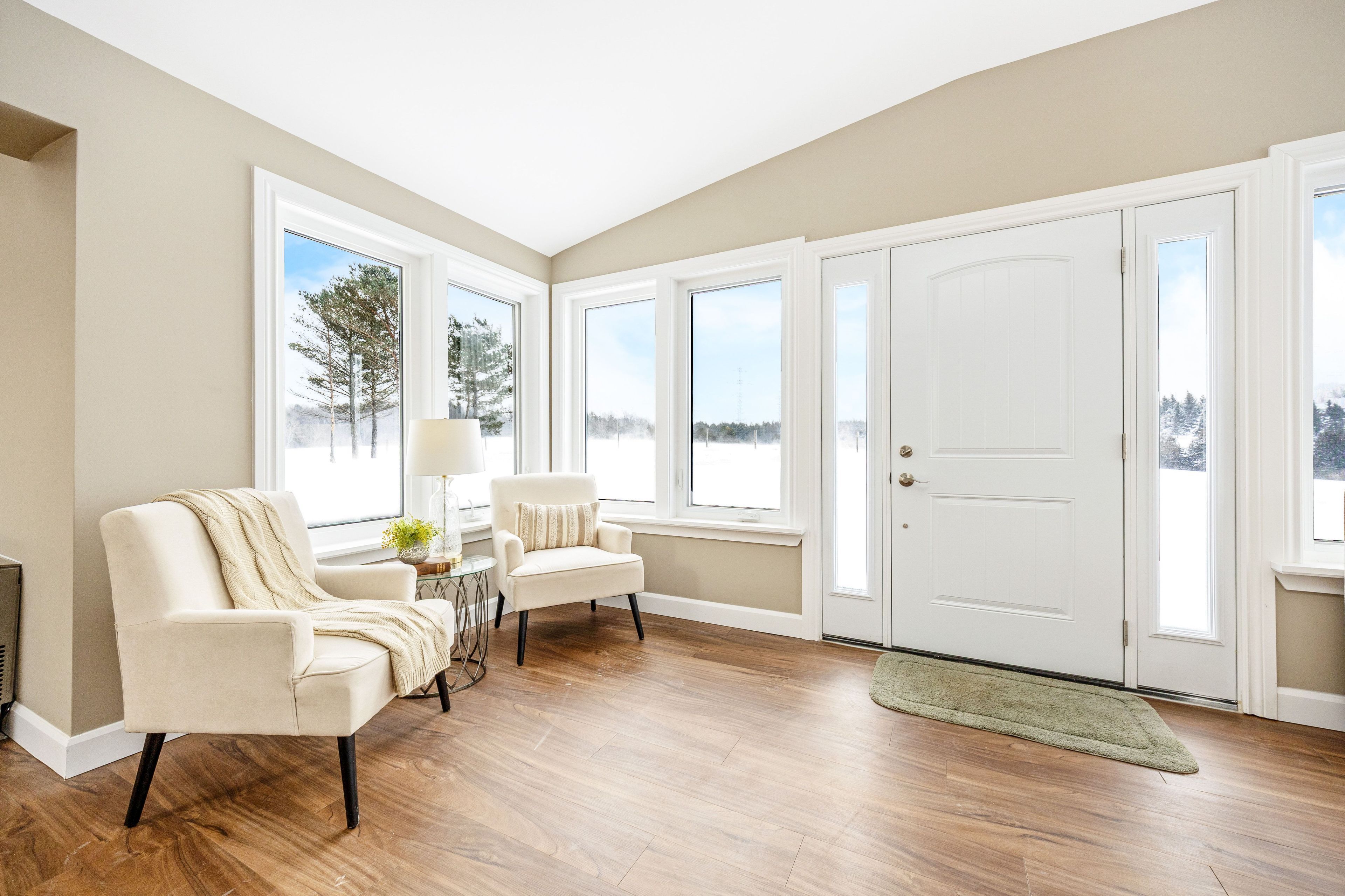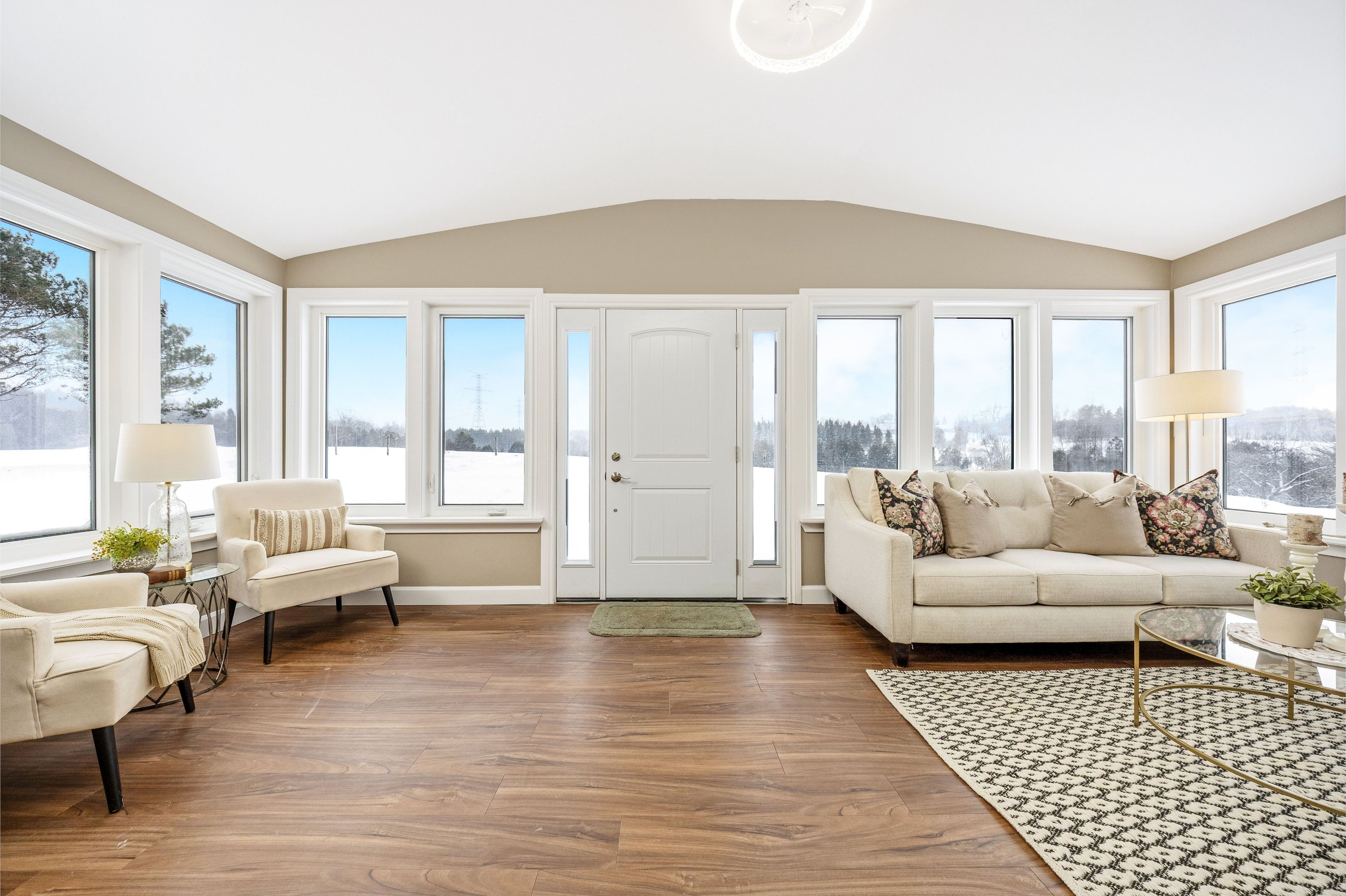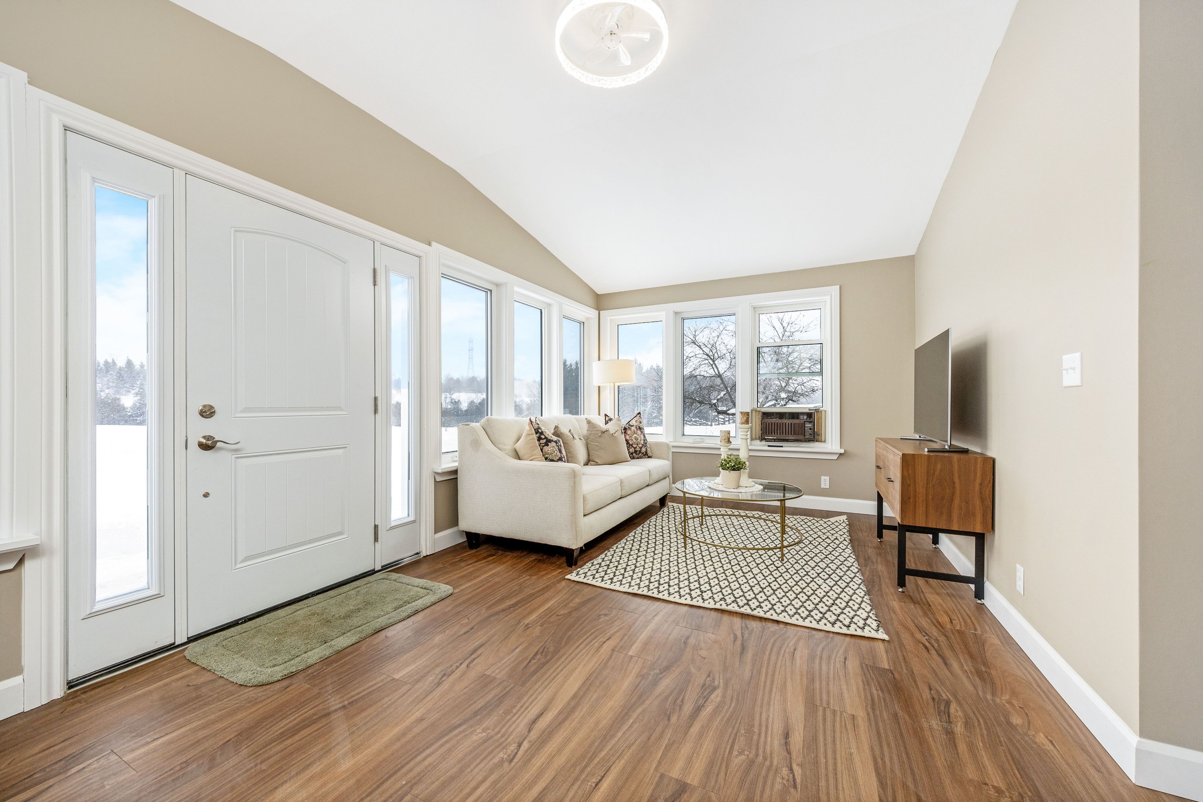 • Bright bungalow entrance with new flooring and ample windows for natural light.