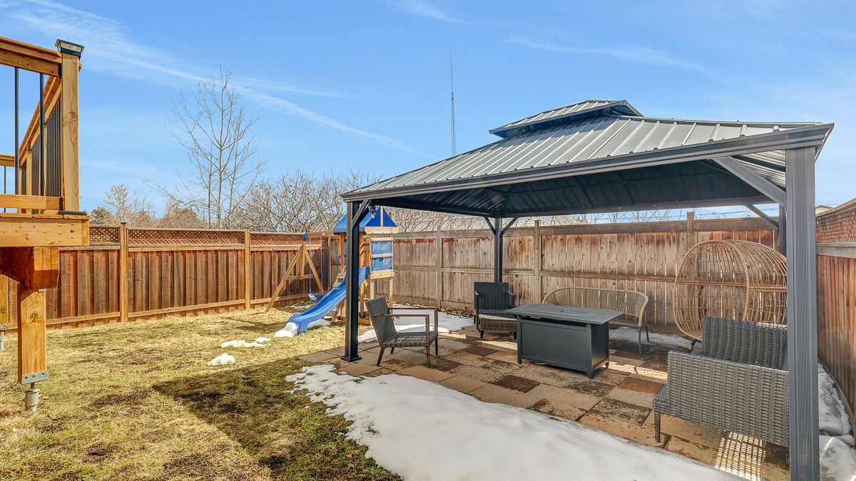 • South-facing backyard with a deck, patio, and gazebo for entertaining.