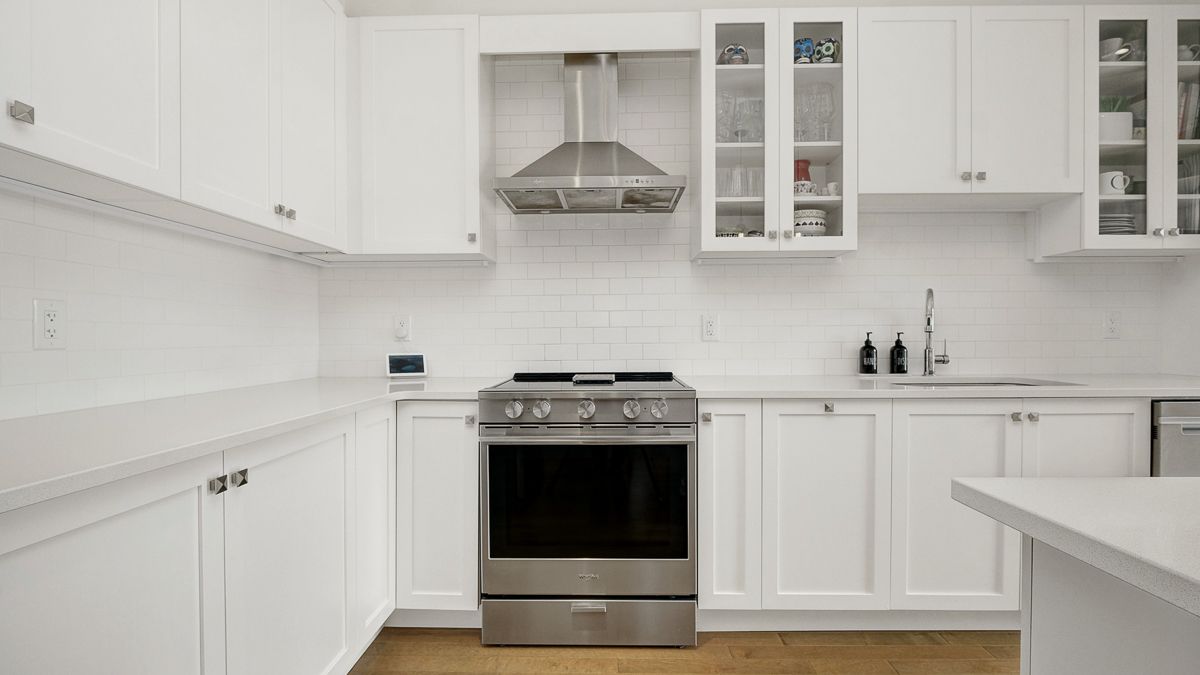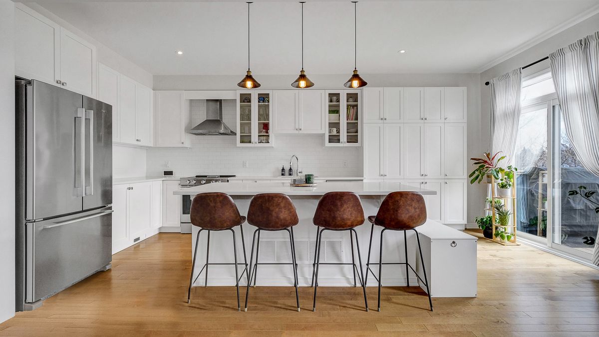 • Gourmet kitchen features large quartz island and stainless steel appliances.
