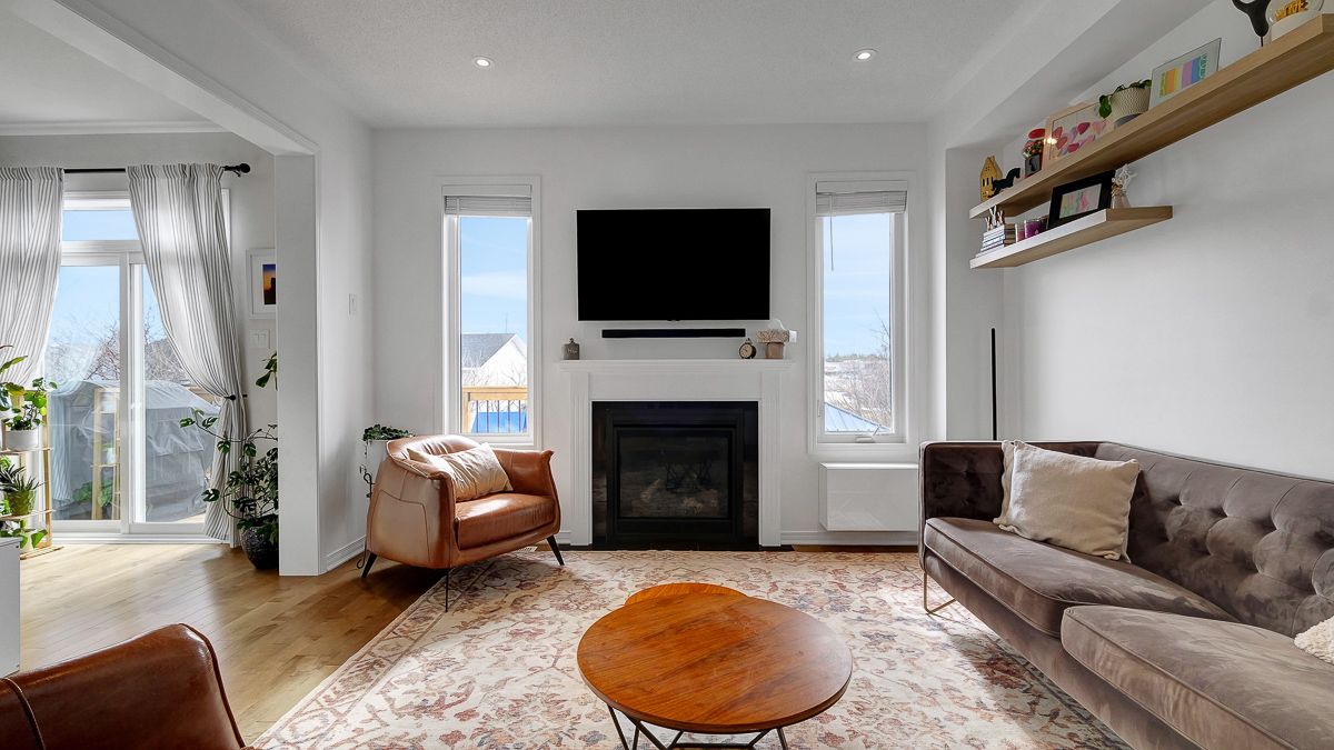 • Open-concept design with a bright living room and gas fireplace.