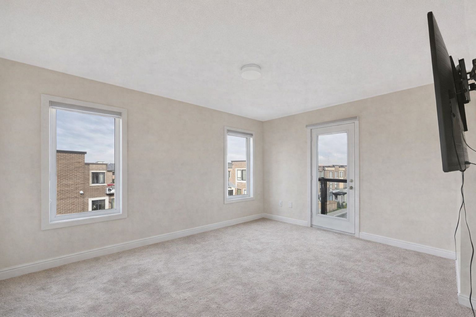 Welcome to this beautifully upgraded 3+1 bedroom end-unit townhome by madison homes, offering approximately 2,014 sq. Ft. Of bright, contemporary living in a highly desirable, family-friendly neighbourhood. Designed for both comfort and functionality, this home features a versatile main-floor room-perfect as a fourth bedroom, private home office, or in-law suite-along with direct garage access for added convenience. The sun-filled open-concept main level boasts 9-foot ceilings, elegant hardwood flooring, and expansive windows that flood the space with natural light. The modern kitchen is a true showpiece, complete with a striking waterfall island, stainless steel appliances, and ample cabinetry, seamlessly connecting to the spacious living and dining areas. Walk out to your large private deck-ideal for entertaining or unwinding outdoors. Upstairs, the primary suite offers a peaceful retreat, featuring its own private balcony, a walk-in closet with custom built-ins, and a spa-inspired ensuite with an upgraded double vanity. Two additional generously sized bedrooms complete the upper level. Additional highlights include an unfinished basement offering endless potential for a home gym, recreation space, or future living area. Perfectly located just steps to shops, restaurants, a gym, and transit, and only minutes to schools, parks, go transit, and highways 401 & 407. Potl fees include snow removal and street maintenance for added ease of living. A rare opportunity to own a bright, spacious end-unit in one of pickering's most desirable communities-don't miss it!