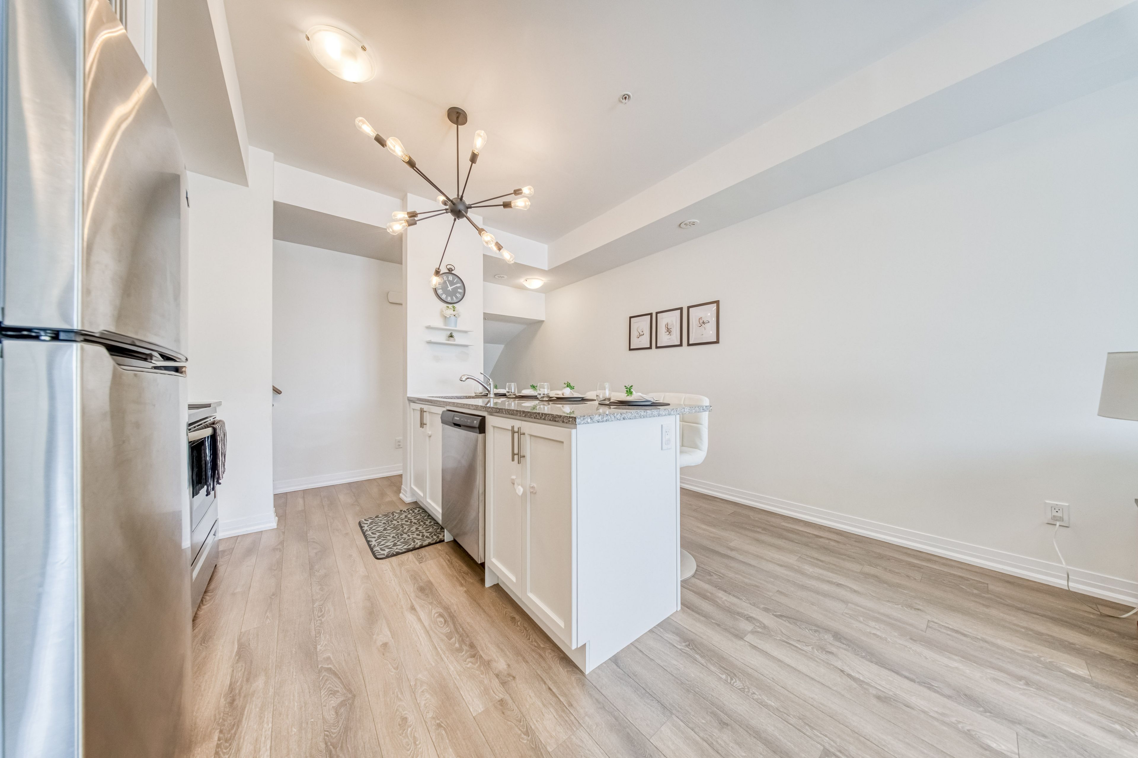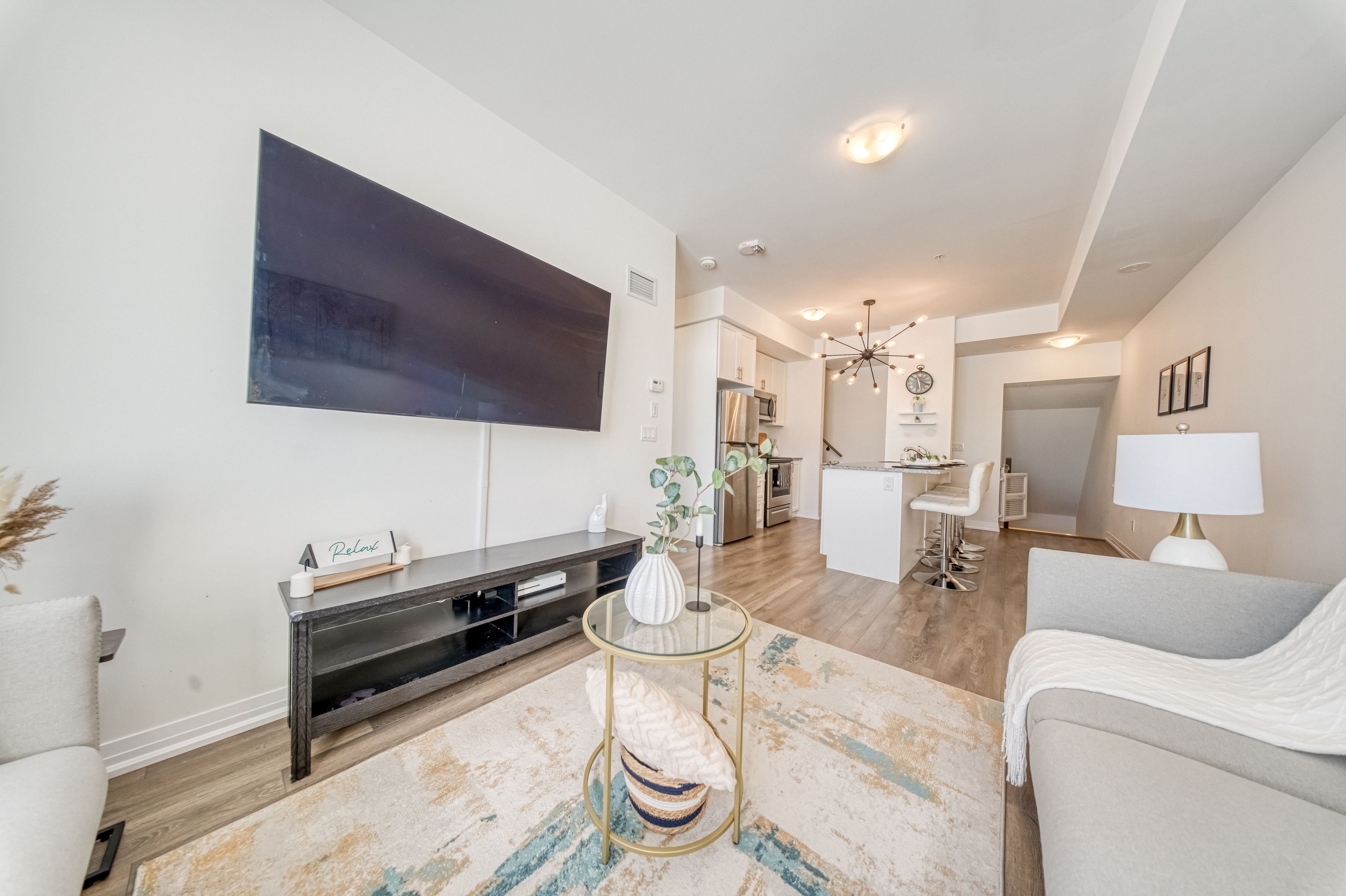 Welcome to this sun-filled, south-facing townhome in the heart of pickering's desirable duffin heights community, offering unobstructed views of the pickering golf club's lush greens. Thoughtfully designed with both style and practicality in mind, this modern 3-bedroom, 3-bathroom residence features high-quality vinyl flooring throughout, delivering a clean, contemporary look with no carpet anywhere. The open-concept main living area is bright and inviting, enhanced by oversized windows that flood the space with natural light. The sleek kitchen is finished with quartz countertops, stainless steel appliances, and a convenient breakfast bar that flows seamlessly into the living and dining areas-ideal for everyday living and entertaining. Two private balconies extend the living space outdoors, perfect for morning coffee, evening relaxation, or enjoying the peaceful surroundings. Upstairs, generously sized bedrooms provide comfort and privacy, including a spacious primary retreat with a walk-in closet and private ensuite. Additional bedrooms offer flexible use for family, guests, or a home office, with access to modern bathrooms. Ensuite laundry, two parking spaces (paid premium to be close to door), and a dedicated locker add everyday convenience and valuable storage. Set within a quiet, family-friendly neighborhood surrounded by parks, trails, and playgrounds, this home offers a perfect balance of tranquility and accessibility. Minutes to smartcentres pickering, pickering town centre, highways 401 & 407, and pickering go station, commuting and daily errands are effortless. An excellent opportunity for professionals, families, or investors seeking a move-in-ready home with modern finishes in one of pickering's most sought-after communities.
