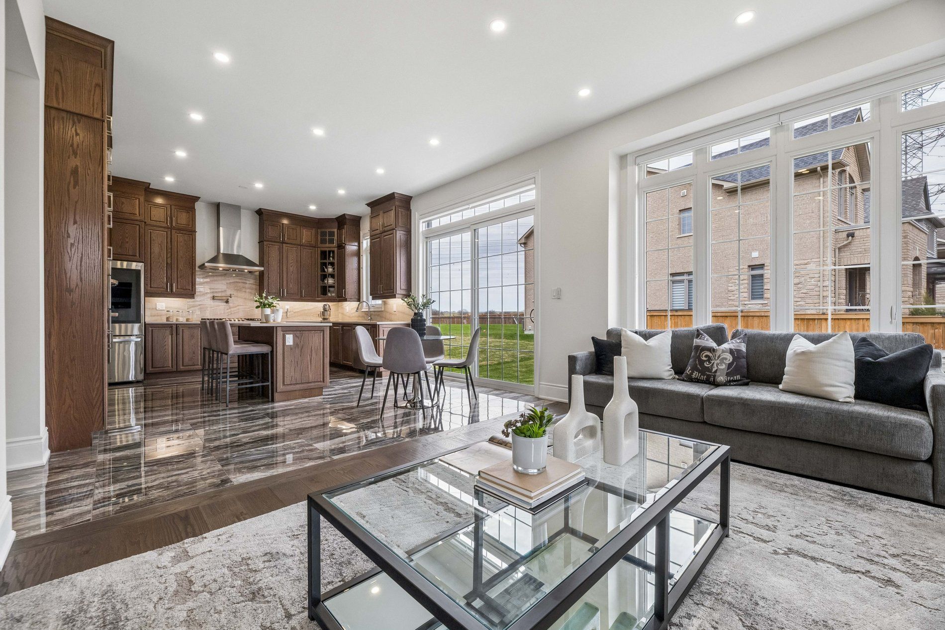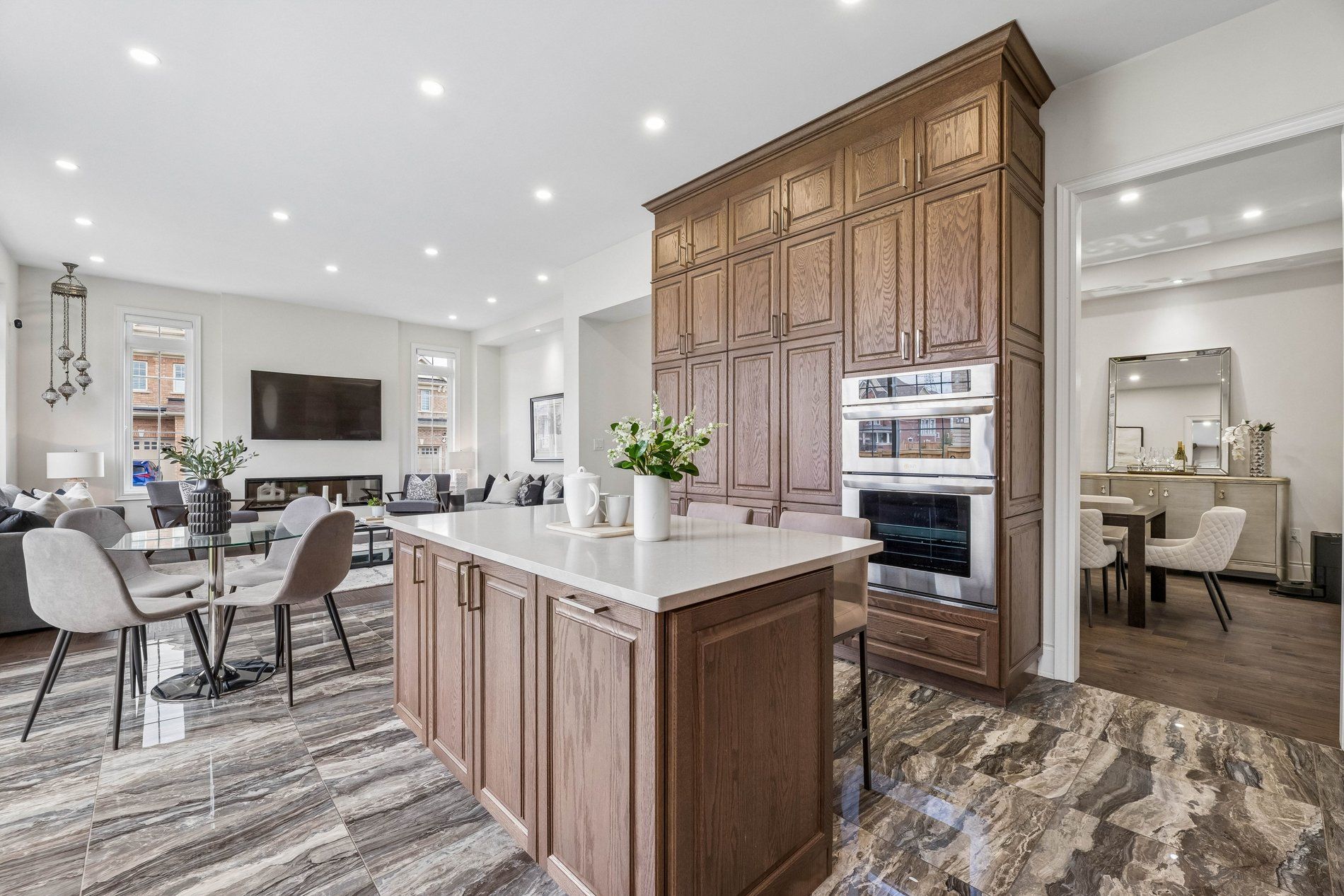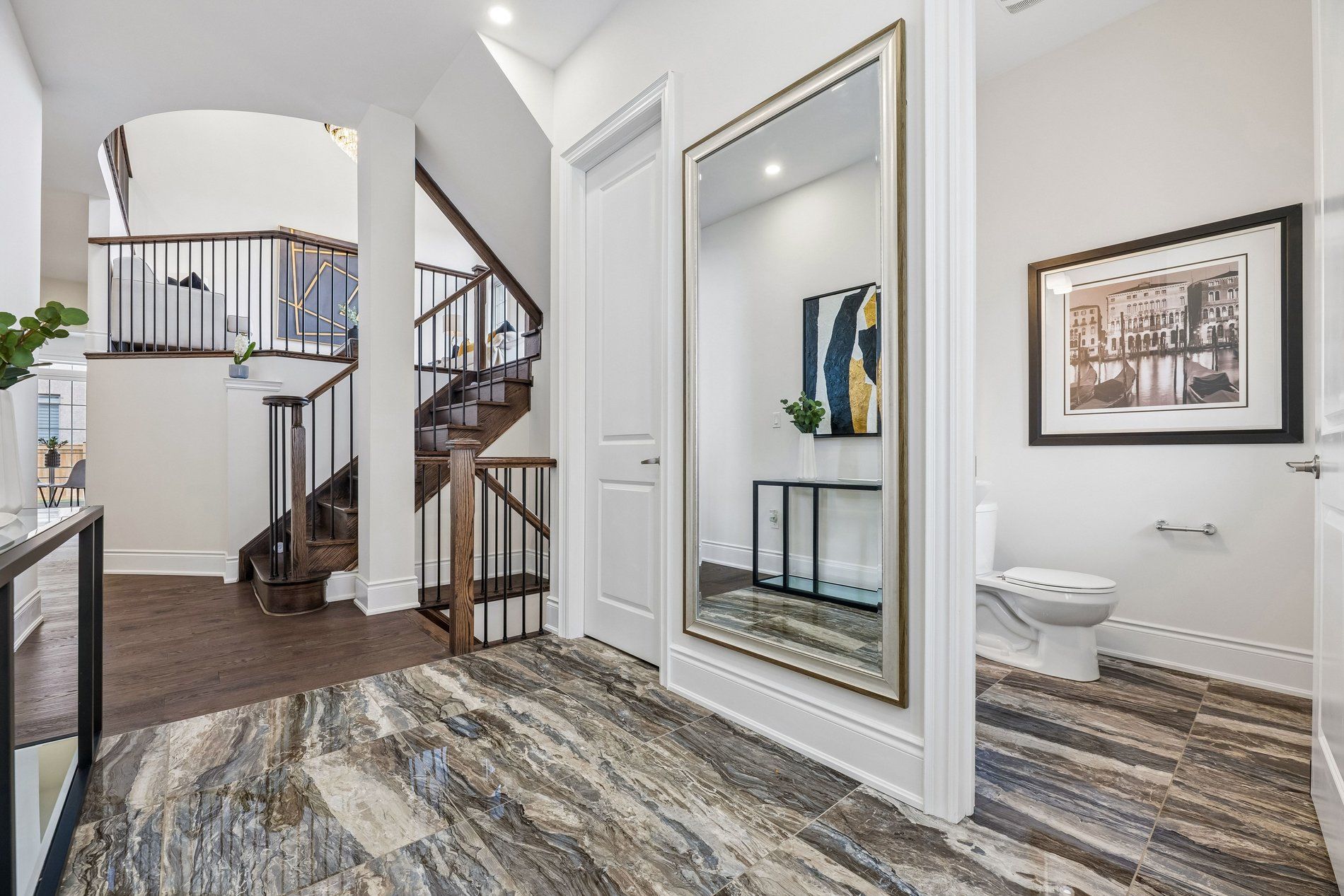 • Impressive grand foyer with marble-look tile and high ceilings.