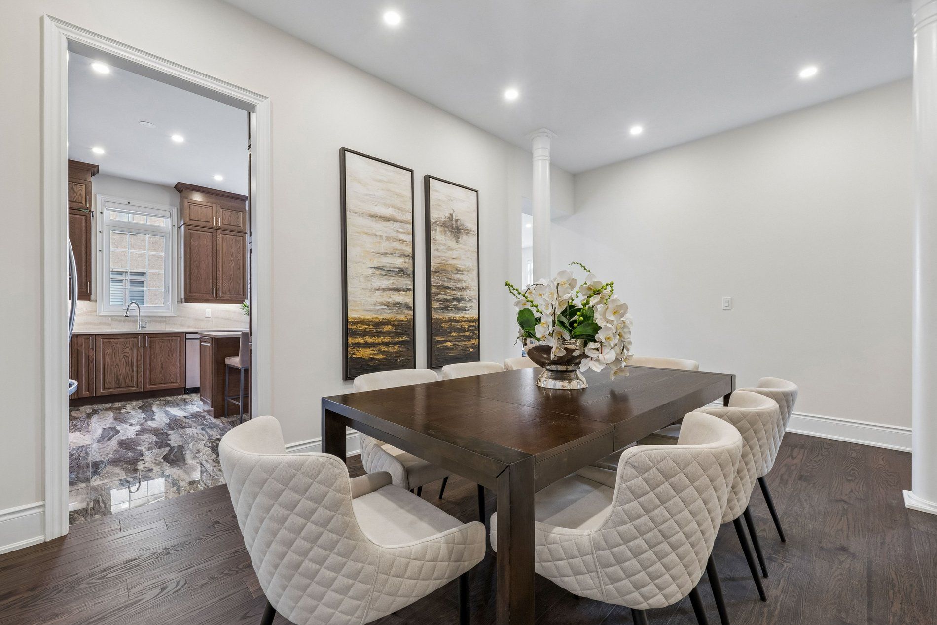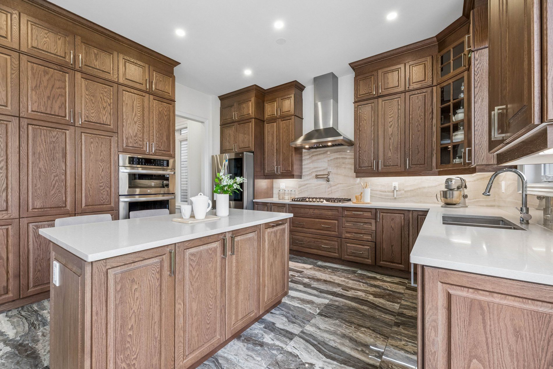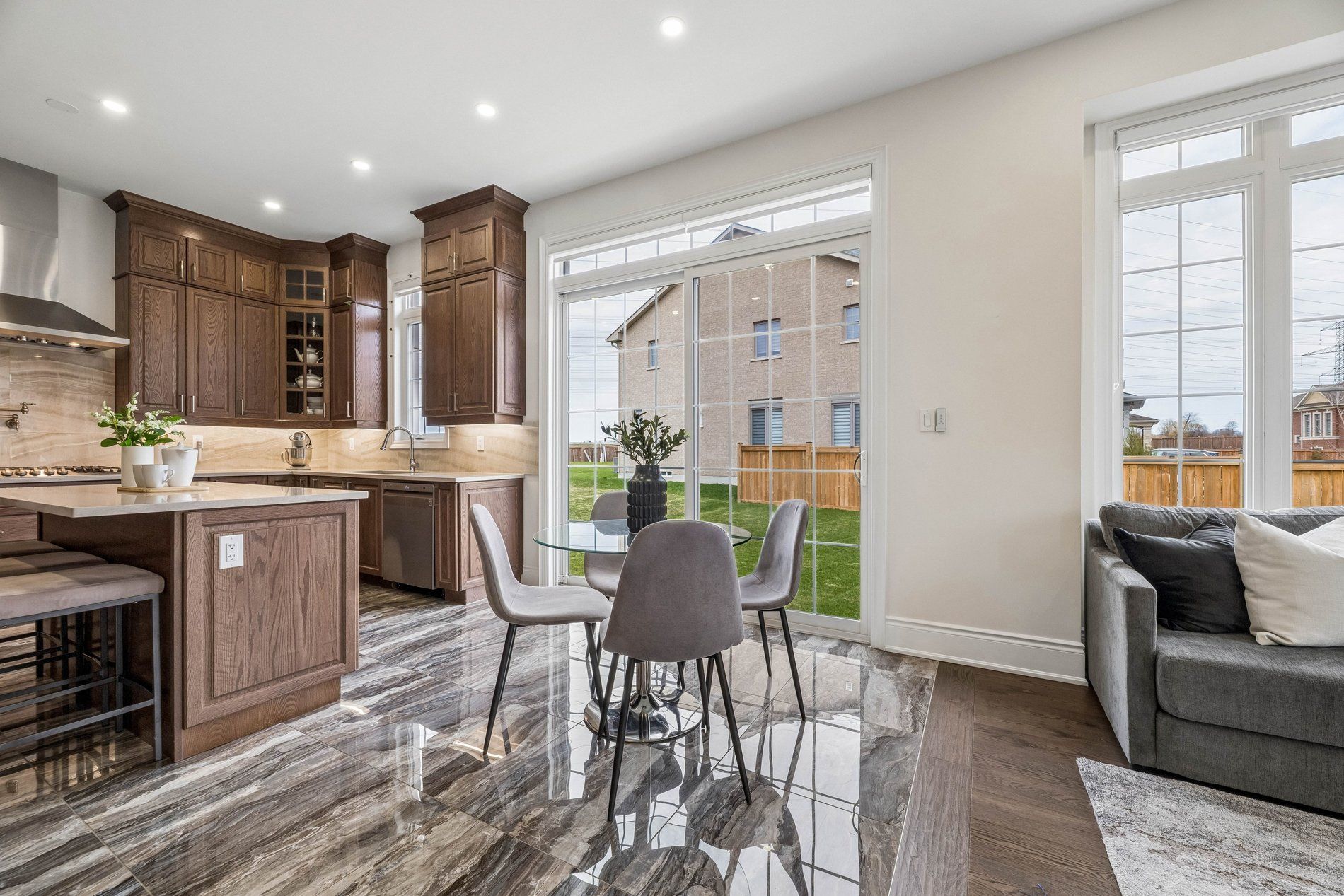 • Impressive grand foyer with marble-look tile and high ceilings.