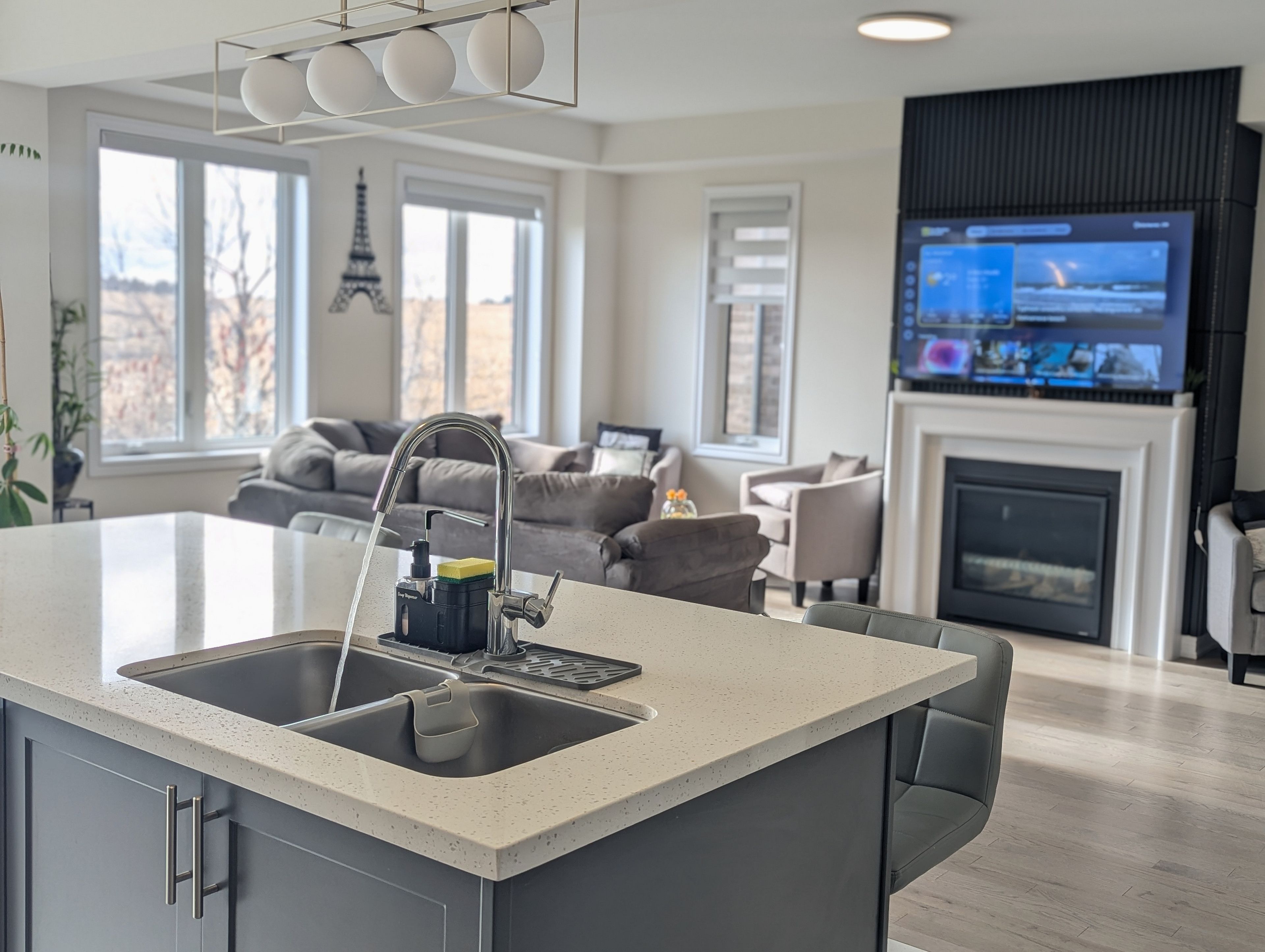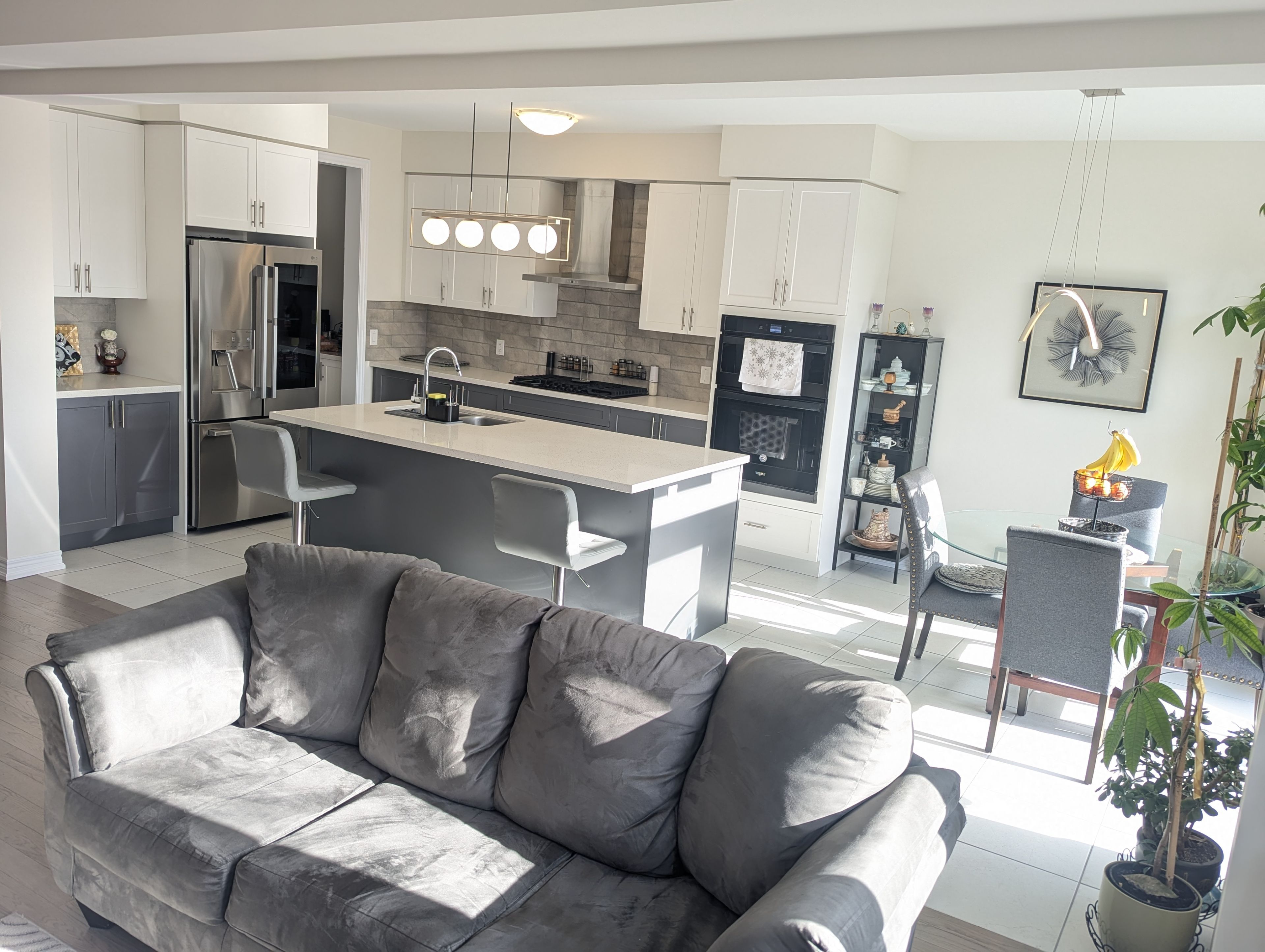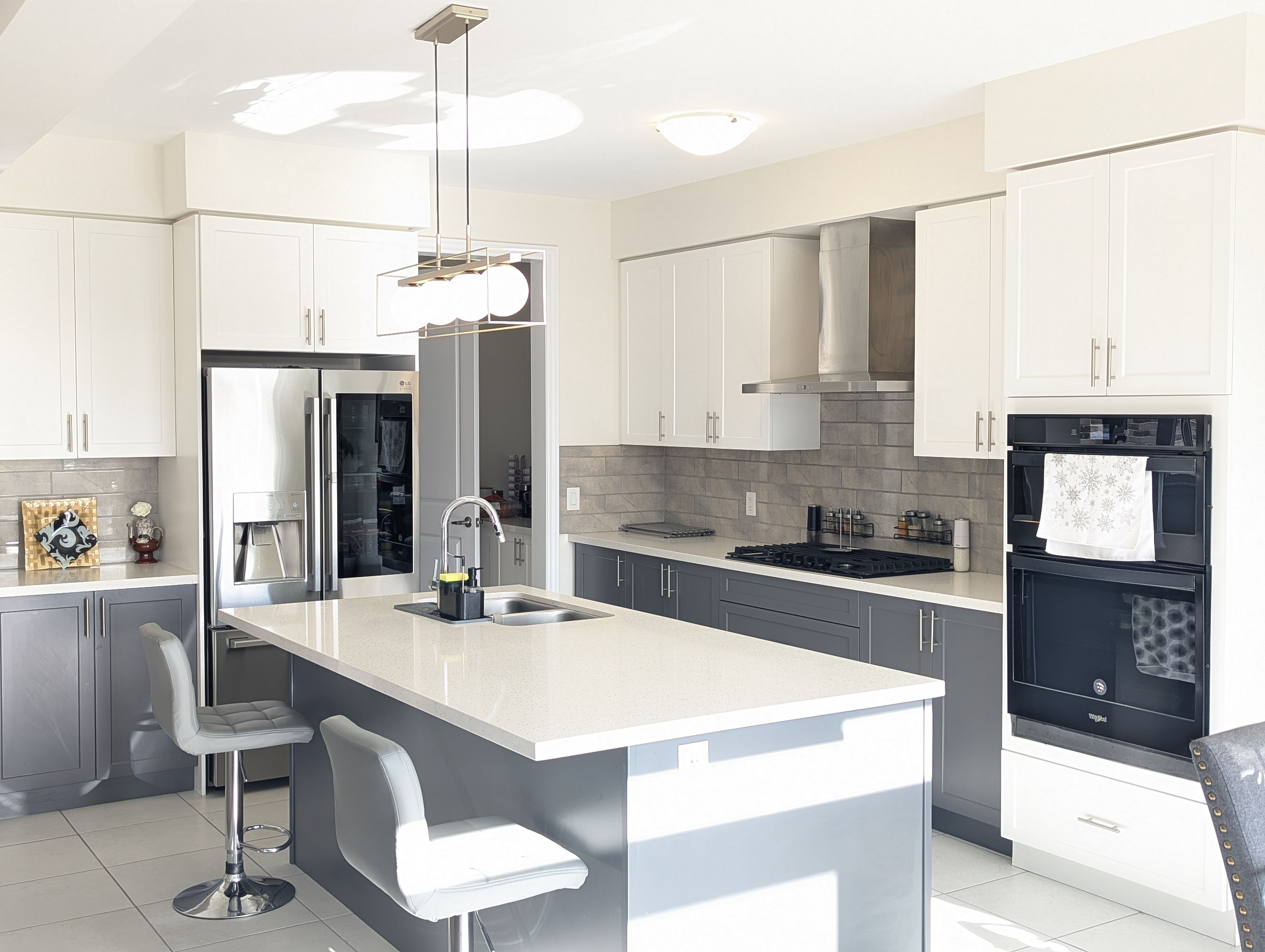 • Modern kitchen includes island and stainless steel appliances.