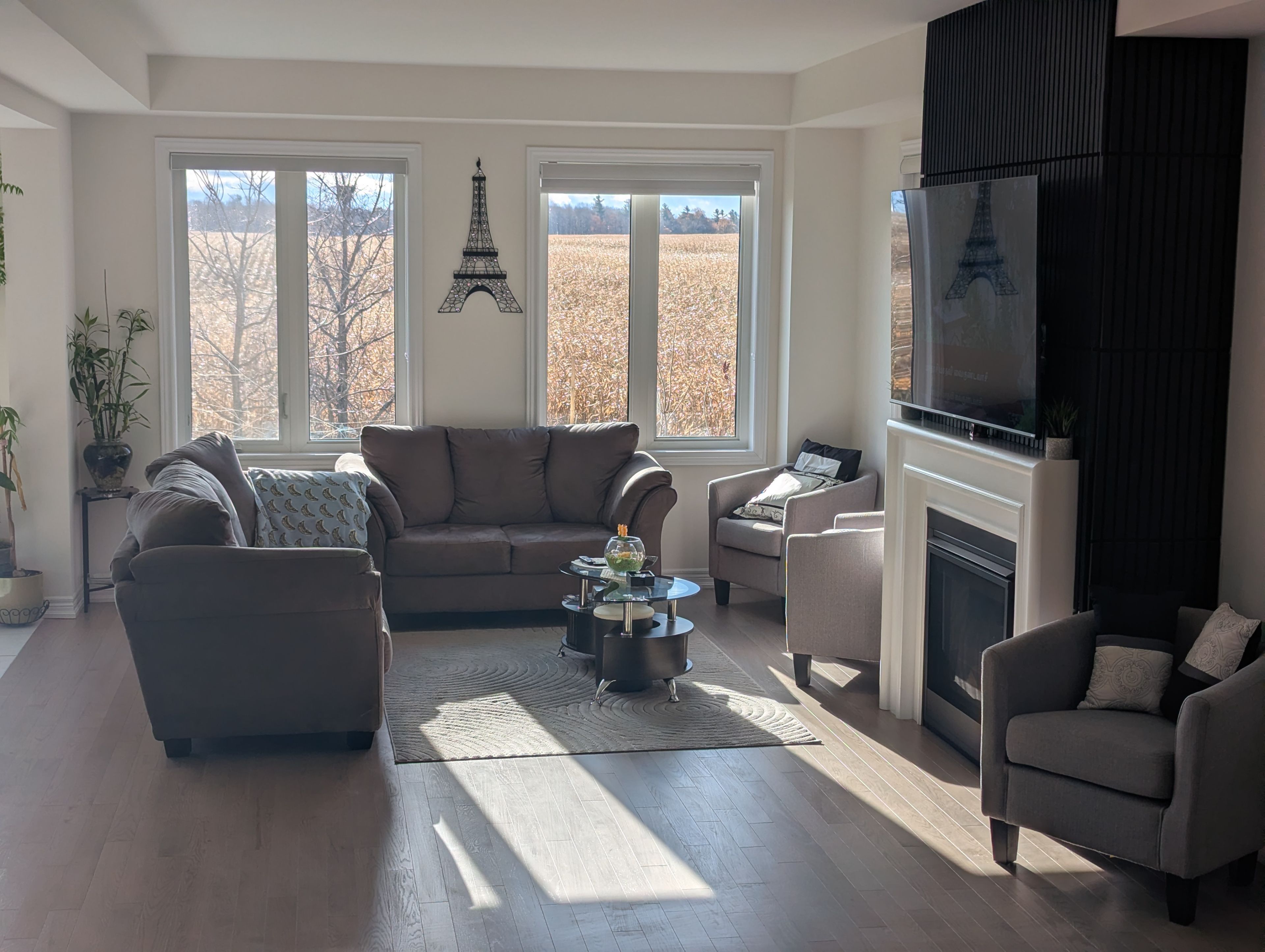 • One-year-old detached home backing onto farm field for privacy.